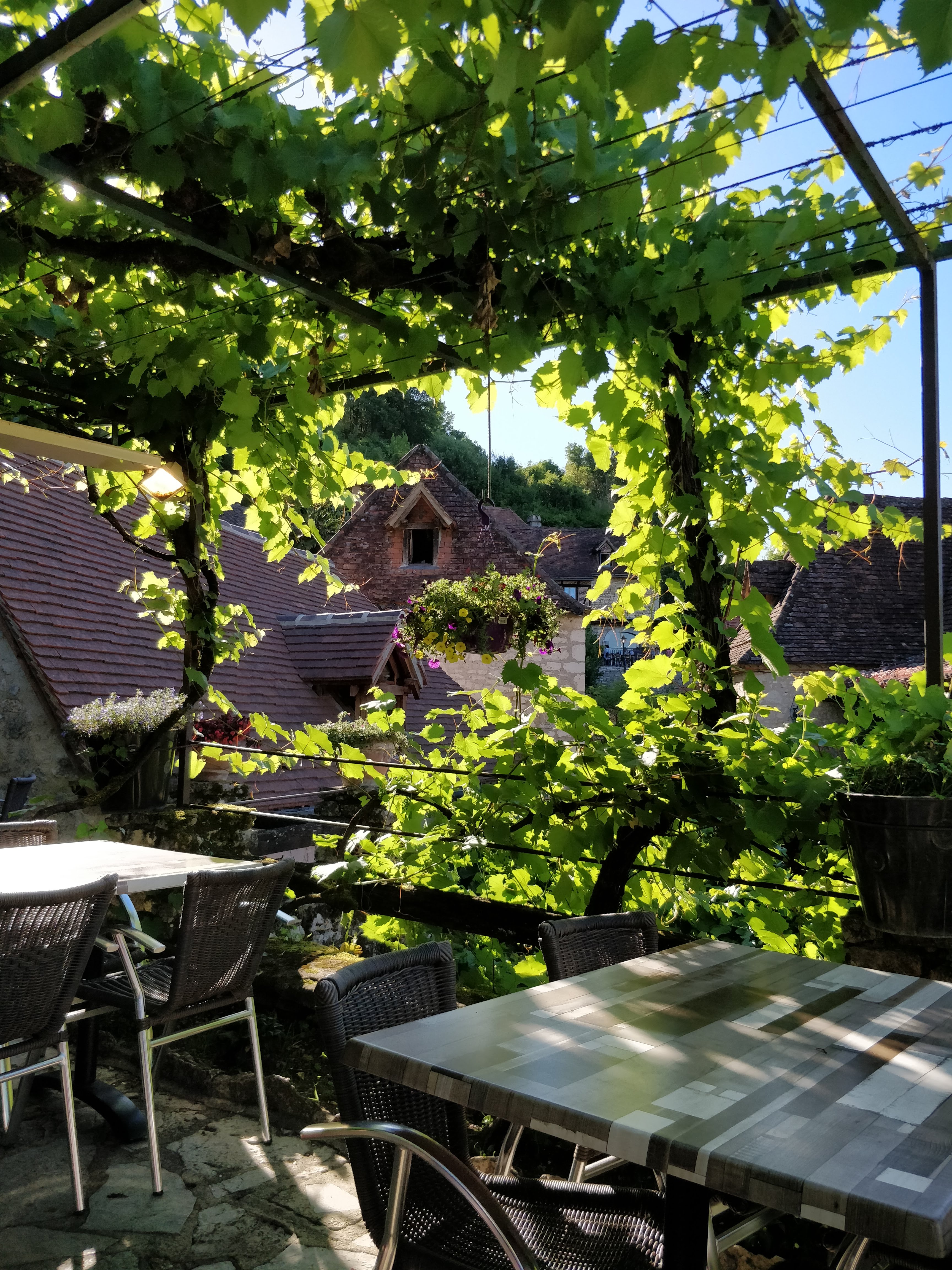 Une magnifique terrasse ombragé par des vignes semble suspendre le temps, on profite des plats simple mais bon. Une assiette gourmande du Sud ouest (manchon de canard, gésiers, fromage de Rocamadour...), un dessert maison (tarte aux noix). Un bon moment passé.