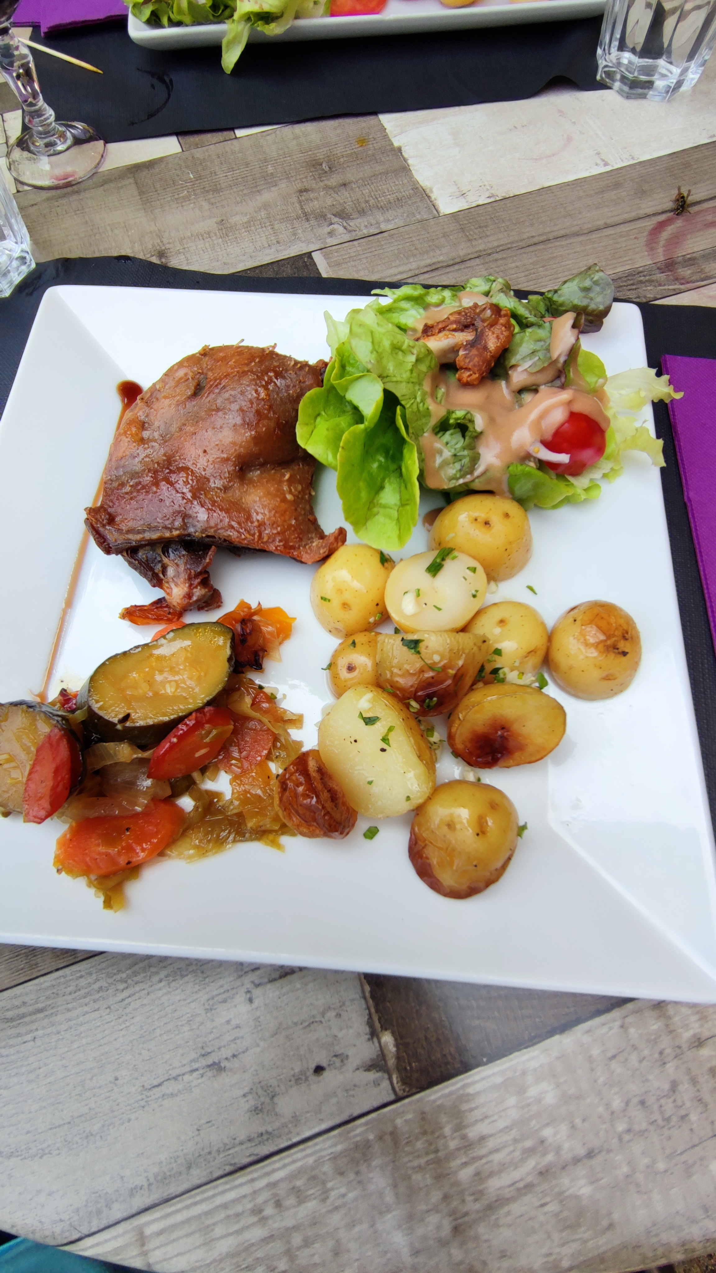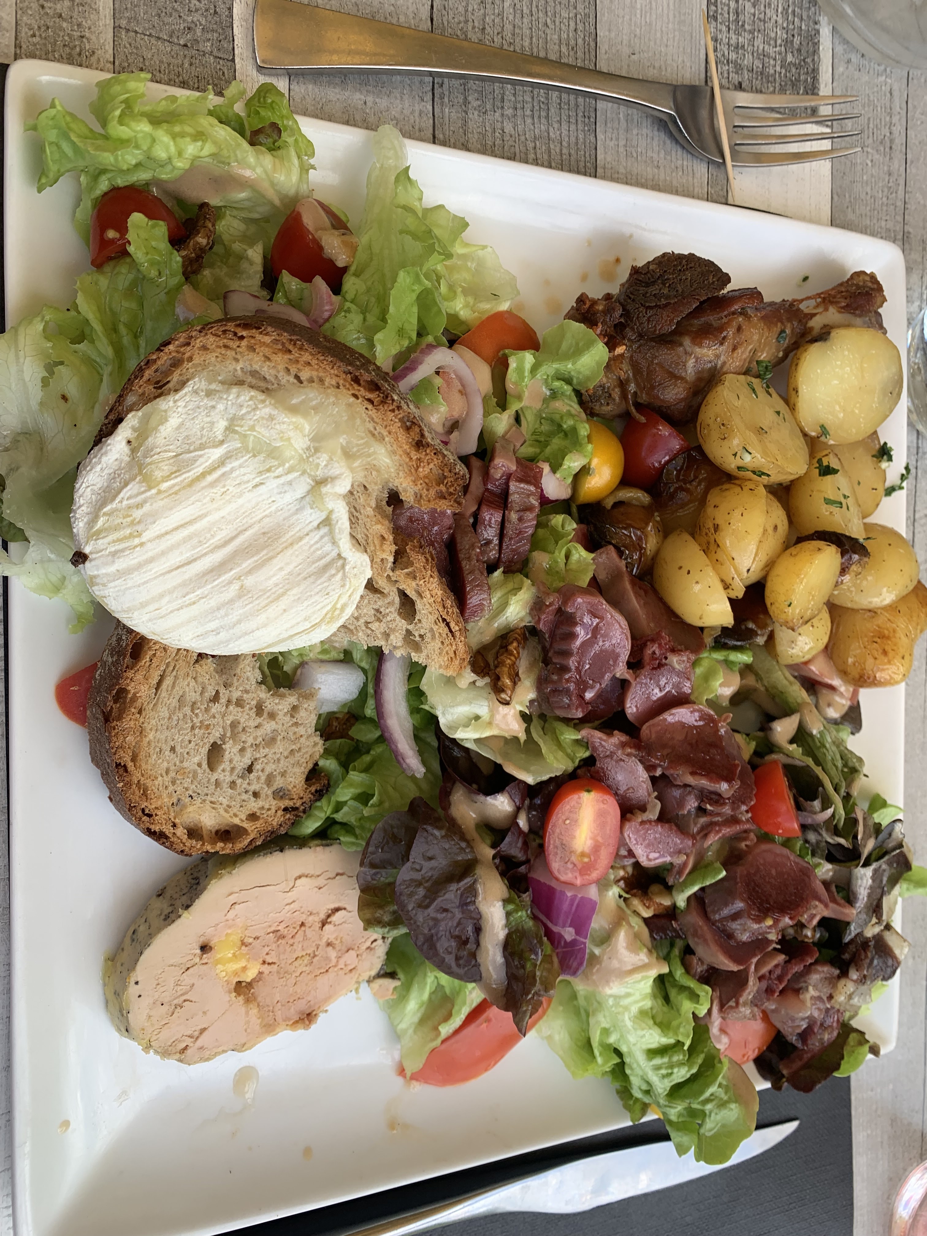 Jolie terrasse. Service beaucoup trop long (40 min) entre la commande et l'arrivée des 4 salades. Cuisses de canard confites (cuisses de canard complètements desséchées serait plus approprié) foie gras correct . Magrets séchés sans intérêt gustatif . point à améliorer : La tenue vestimantaire de vos serveurs. Résumé : un resto sans grand intérêt à par le cadre pour les produits du terroir passez votre chemin.