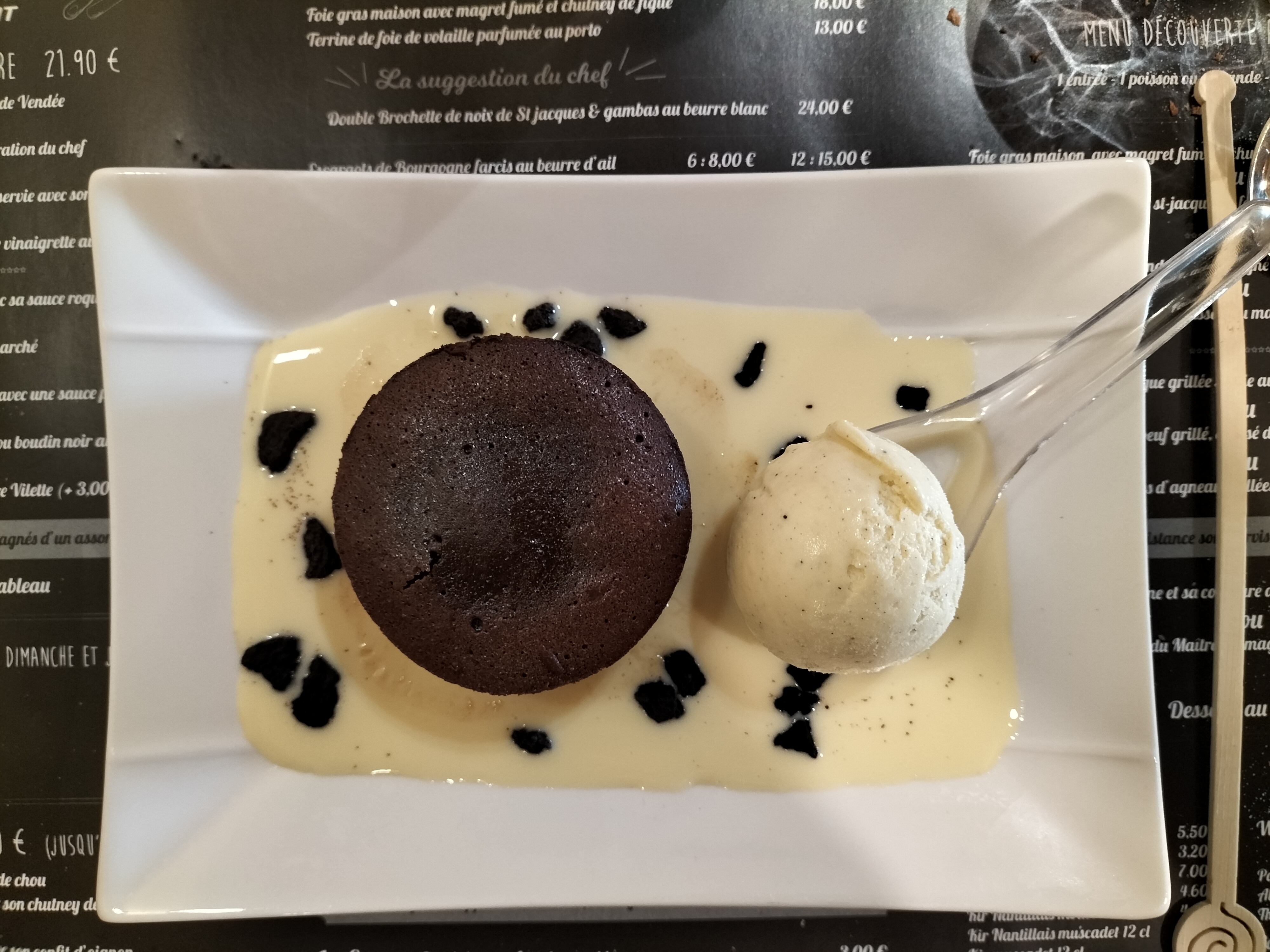 Avons choisi le menu terre et mer dont une entrecôte en plat principal (supplément annoncé de 3€). Bonnes entrées (terrine de campagne et assiette fraîcheur). Entrecôtes un peu fines mais saignantes comme souhaité. En dessert, un fondant chocolat chaud excellent avec une boule de glace. Le tout agrémenté d'une carafe de 50cl de Côtes du Rhône à 11€ (prix trop élevé). Serveuse très cordiale et agréable. La patronne est un peu moins souriante (nous nous étions recommandé d'un habitué, cela a peut-être joué un peu). Café à 2€ (prix trop élevé). C'est une bonne étape mais il y a quelques améliorations à faire, notamment au niveau de l'accueil...