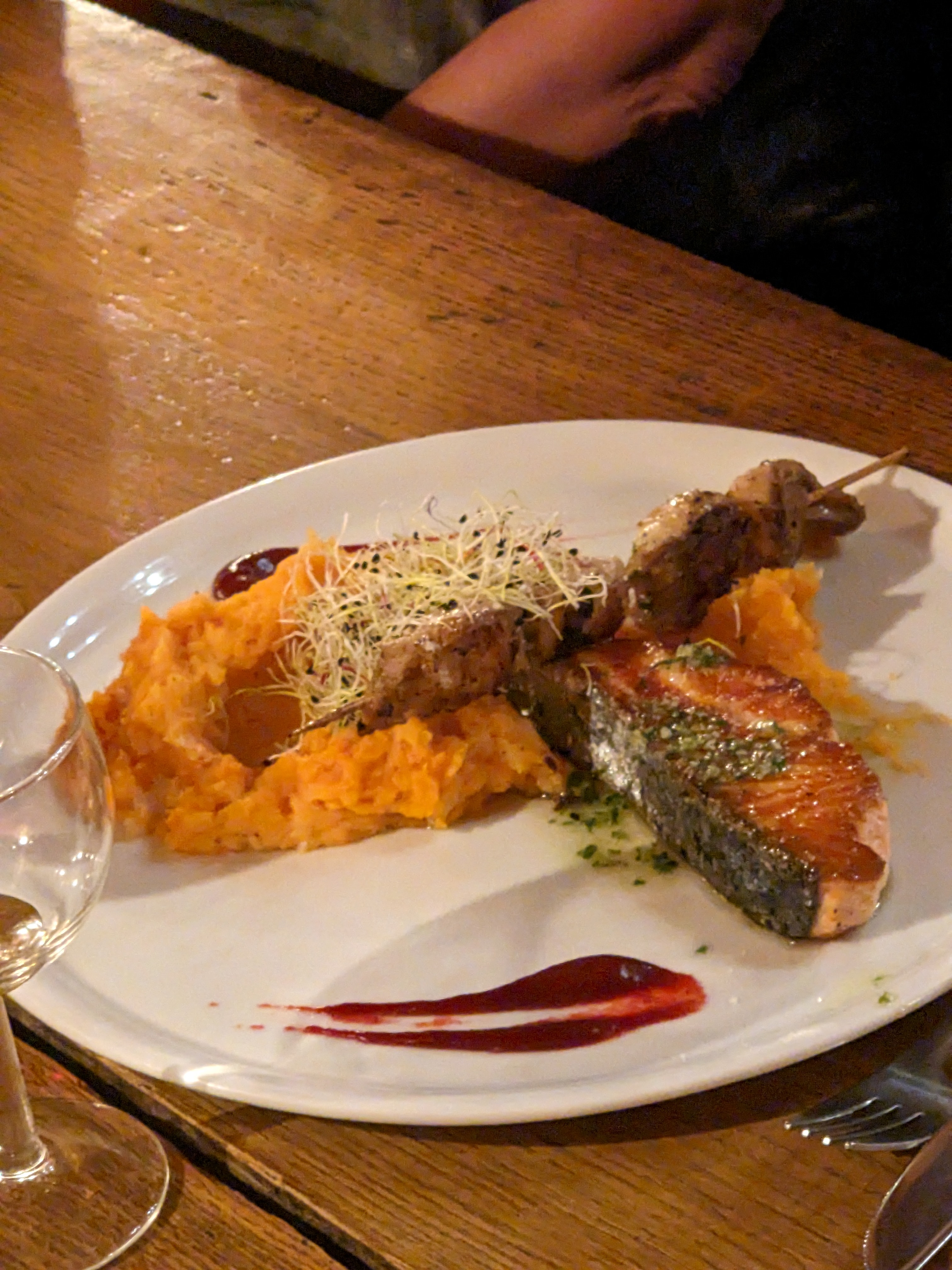 L'appétit n'est pas venu en mangeant.. Déçu du peu de quantité de nourriture dans l'assiette pour le tarif .. Cuisson de la sèche et du saumon pas dutout maîtrisée.