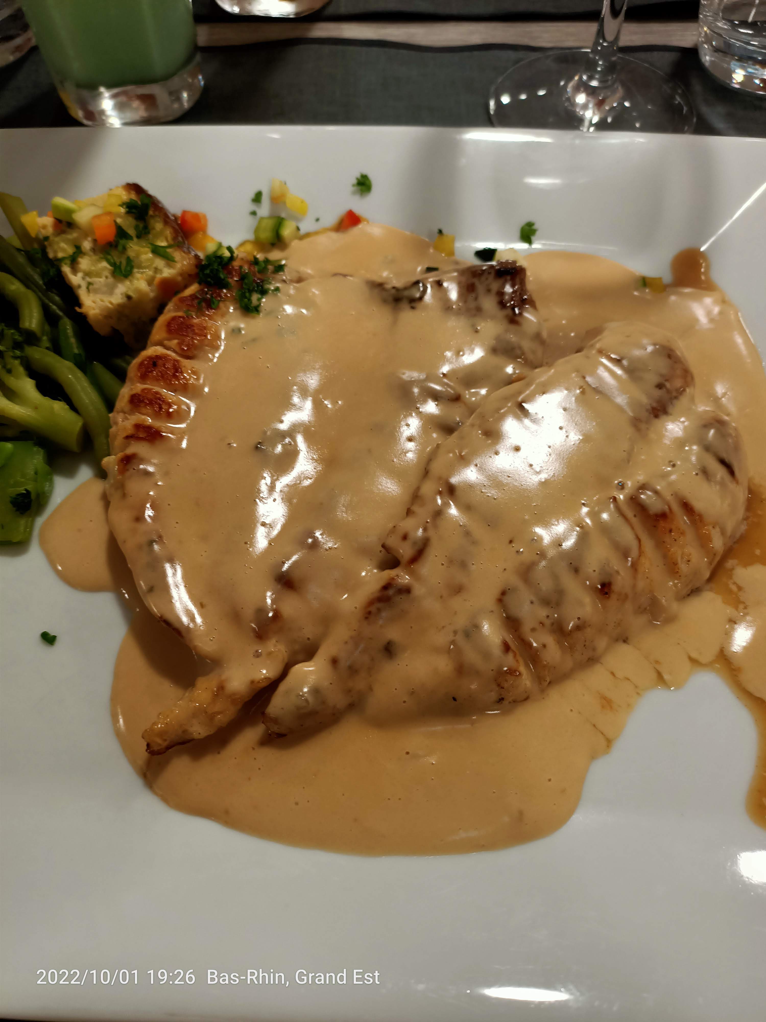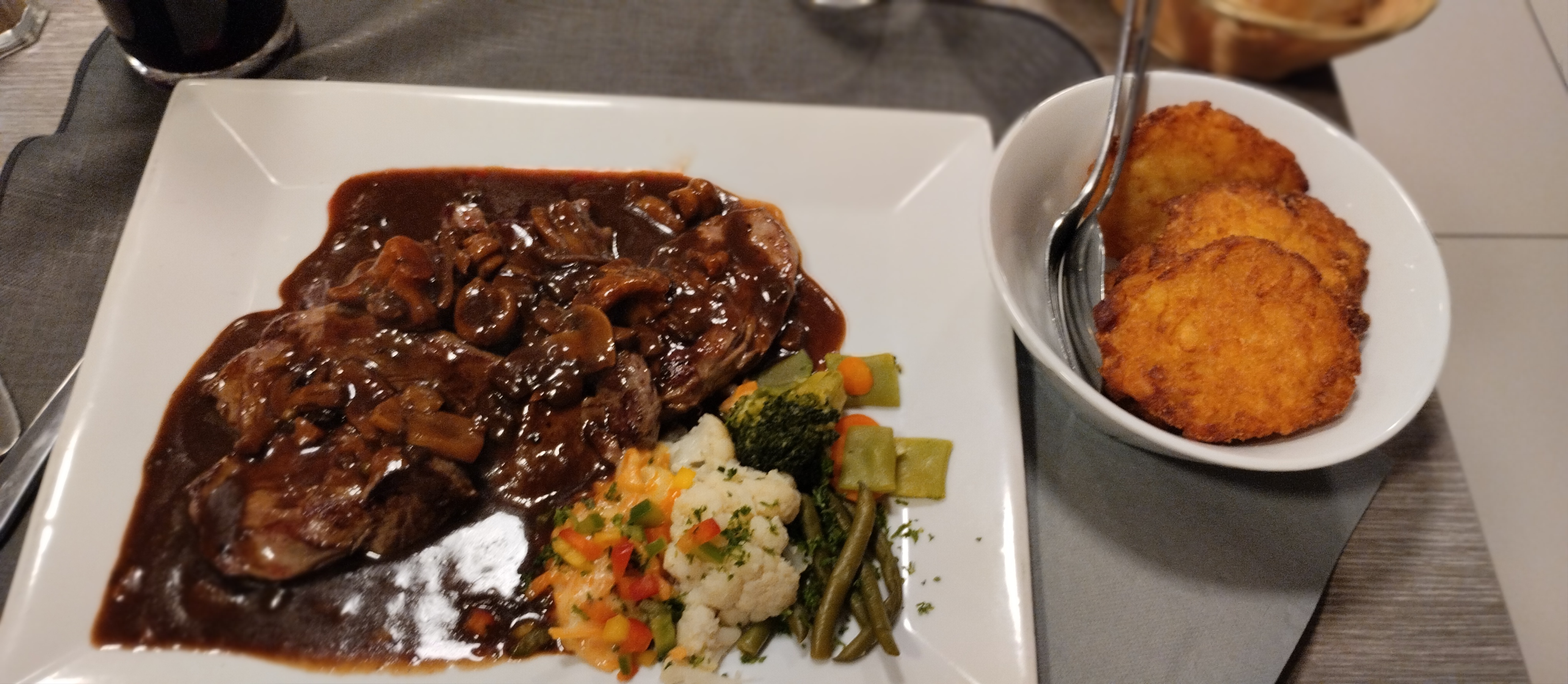 Gibier pas mauvais du tout mais accompagnement de légumes congelés puis restaurant terriblement bruyant car c'est une grande salle sans mur ! Dessert correct mais service long voir très long ... Mérite la moyenne car c'est très généreux en quantité.