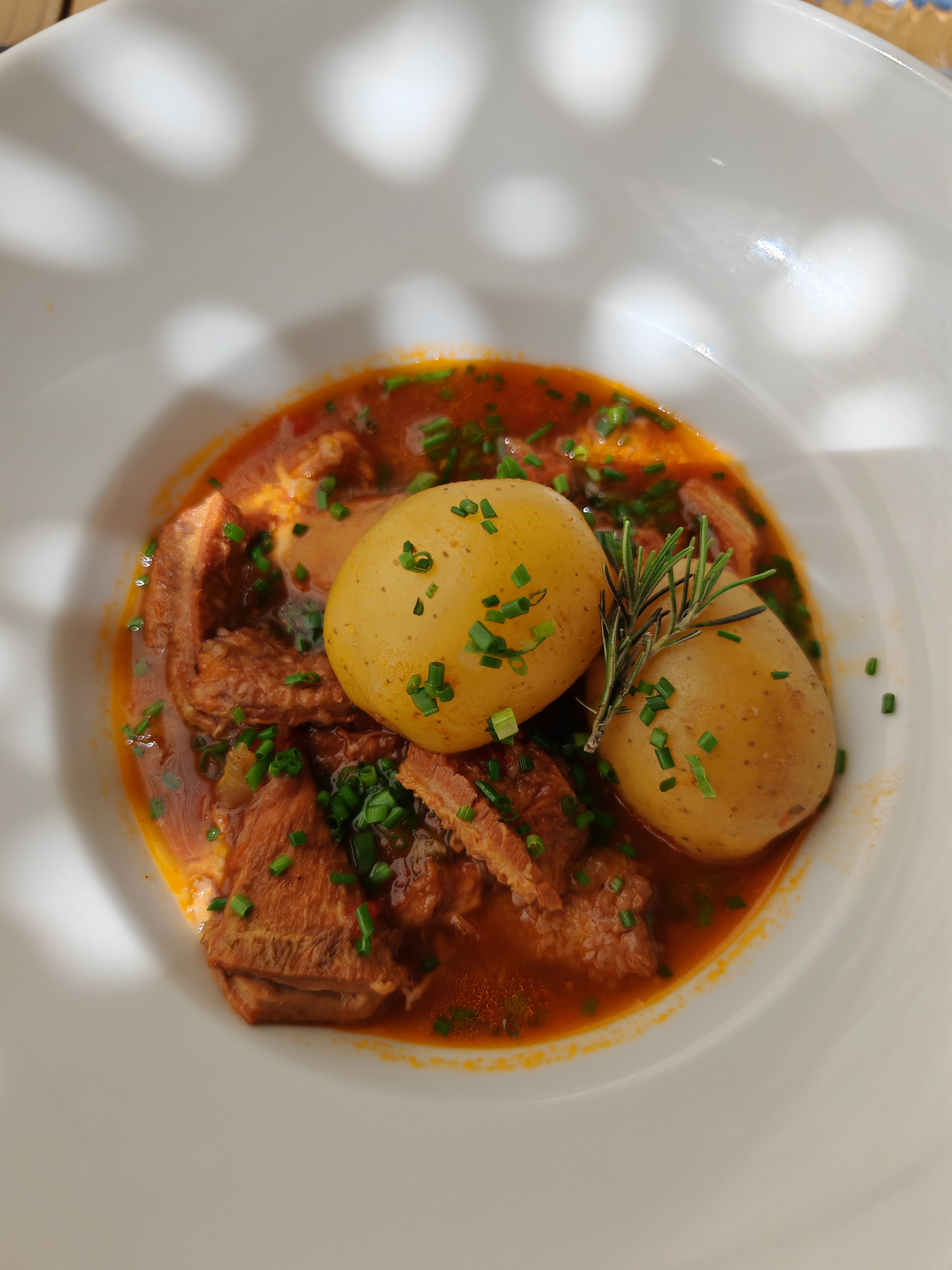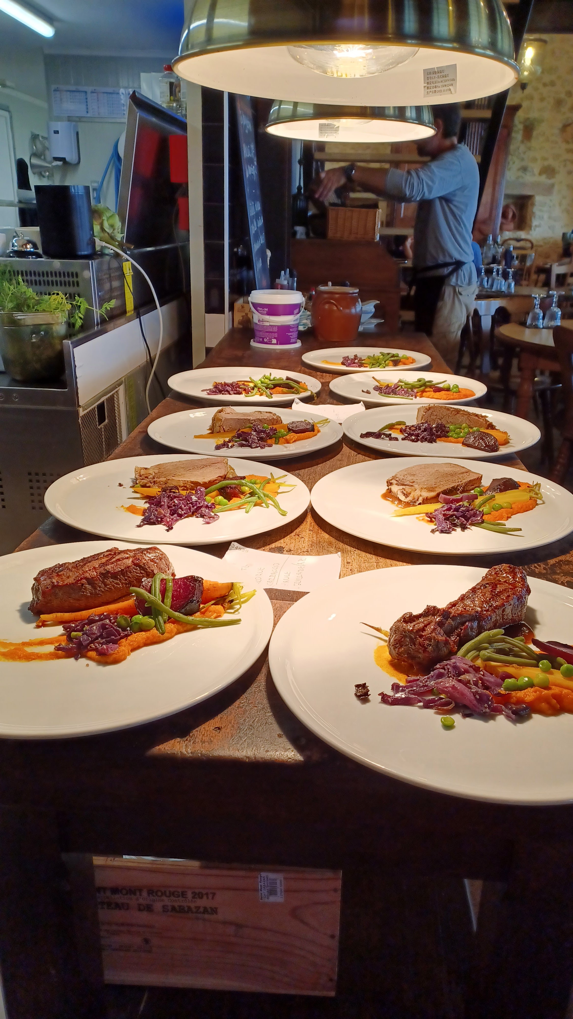 Cadre bucolique surtout si vous mangez en terrasse. Personnel toujours souriant, malgré la chaleur (40°c) et la fanfare qui faisait beaucoup de bruit et prenait beaucoup de place :-). Les plats sont bien présentés et excellents. La viande est évidement très bonne mais le gaspacho était également délicieux. A refaire!