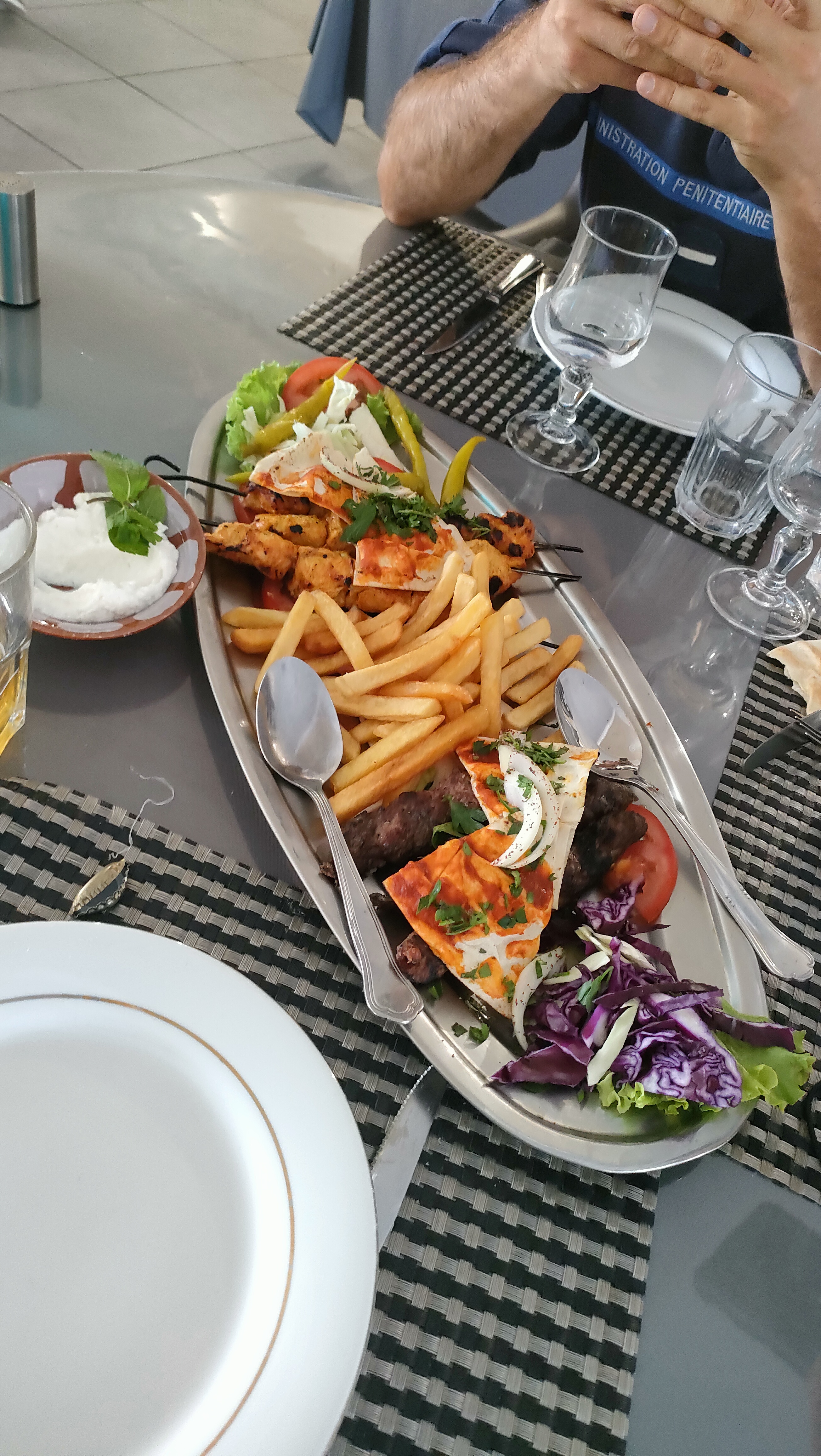 Parking exigüe. Accueil sympathique du responsable mais pas bien expliqué pour une première. La salle est propre. Les entrées froides sont très bonnes, les chaudes un peu moins. Le plat brochettes, frites et riz n’est pas trop mal, par contre un petit insecte s’y trouvait dedans ! Le dessert n’est jamais arrivé nous sommes partis. Le thé dit offert nous est finalement facturé…