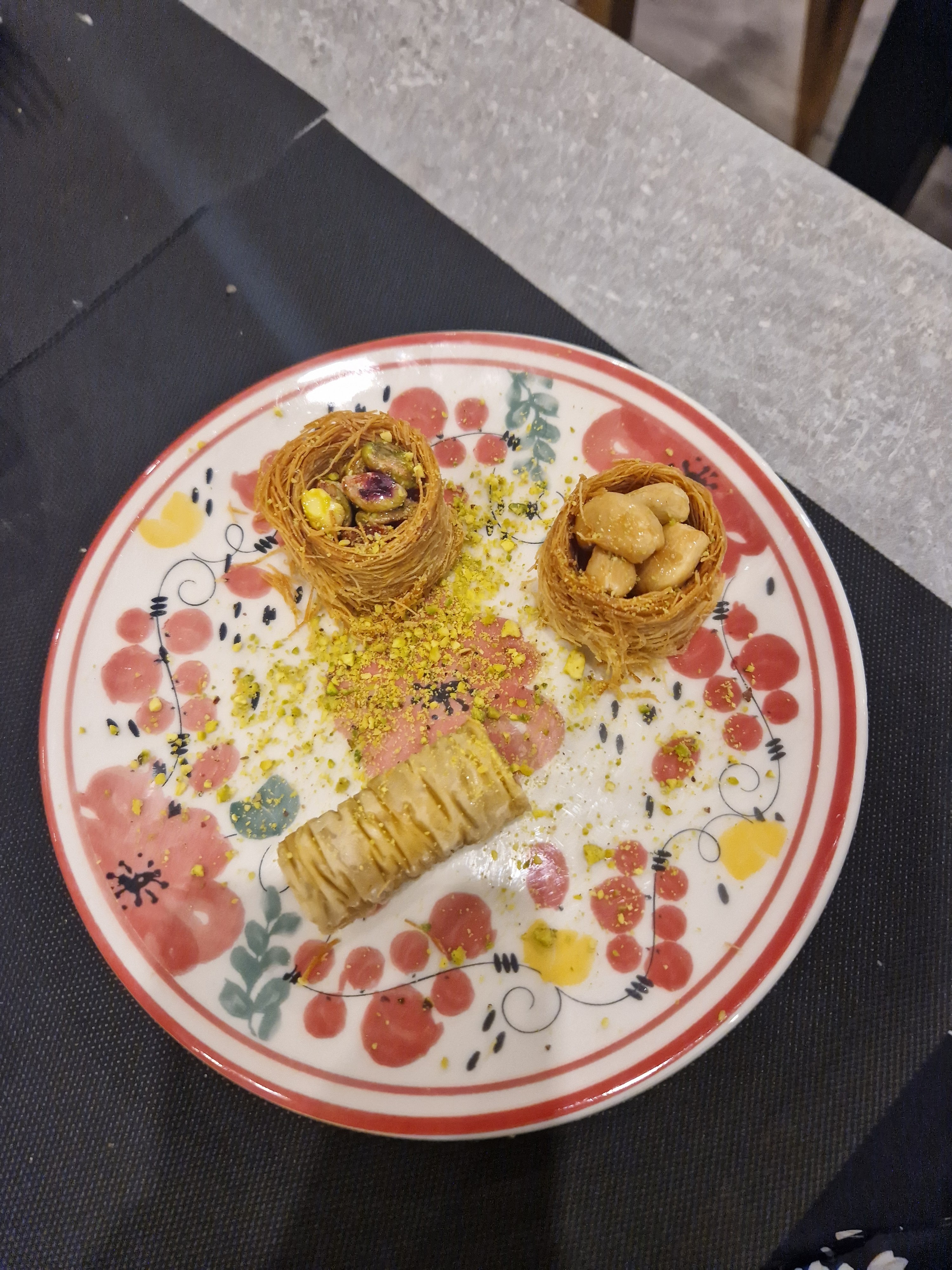 Nous avons très bien été accueillis, les mezze sont excellents, personnels très gentils et le gérant qui nous fait voyager tout au long du repas ! Nous avons pu goûter deux desserts vraiment bon aussi ! Très bonne soirée merci encore
