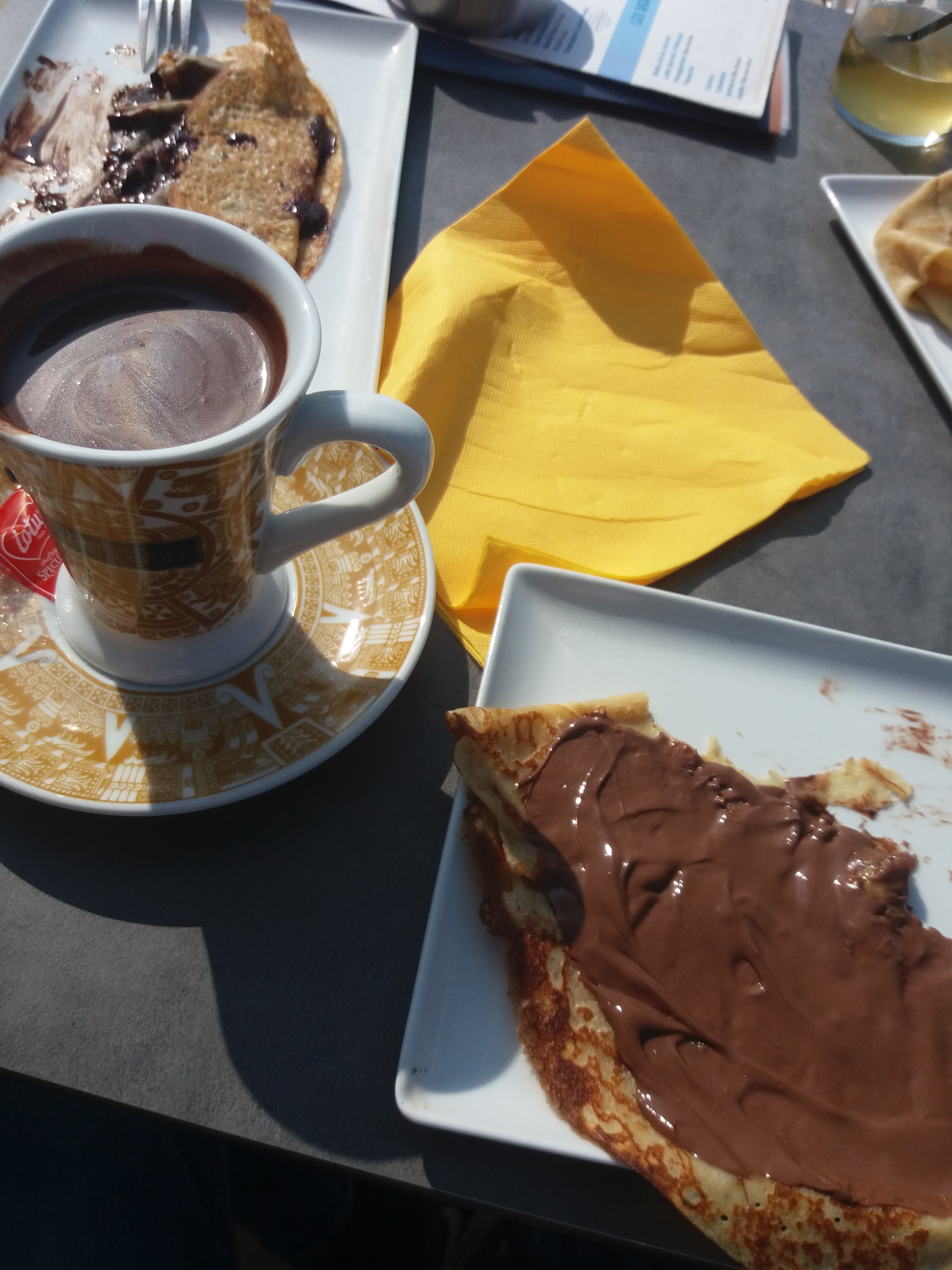 Personnel très agréable, souriant. Crêpes très bien garnies en chocolat. Un bon vrai chocolat chaud également bien épais et délicieusement chocolaté. Parfait!!