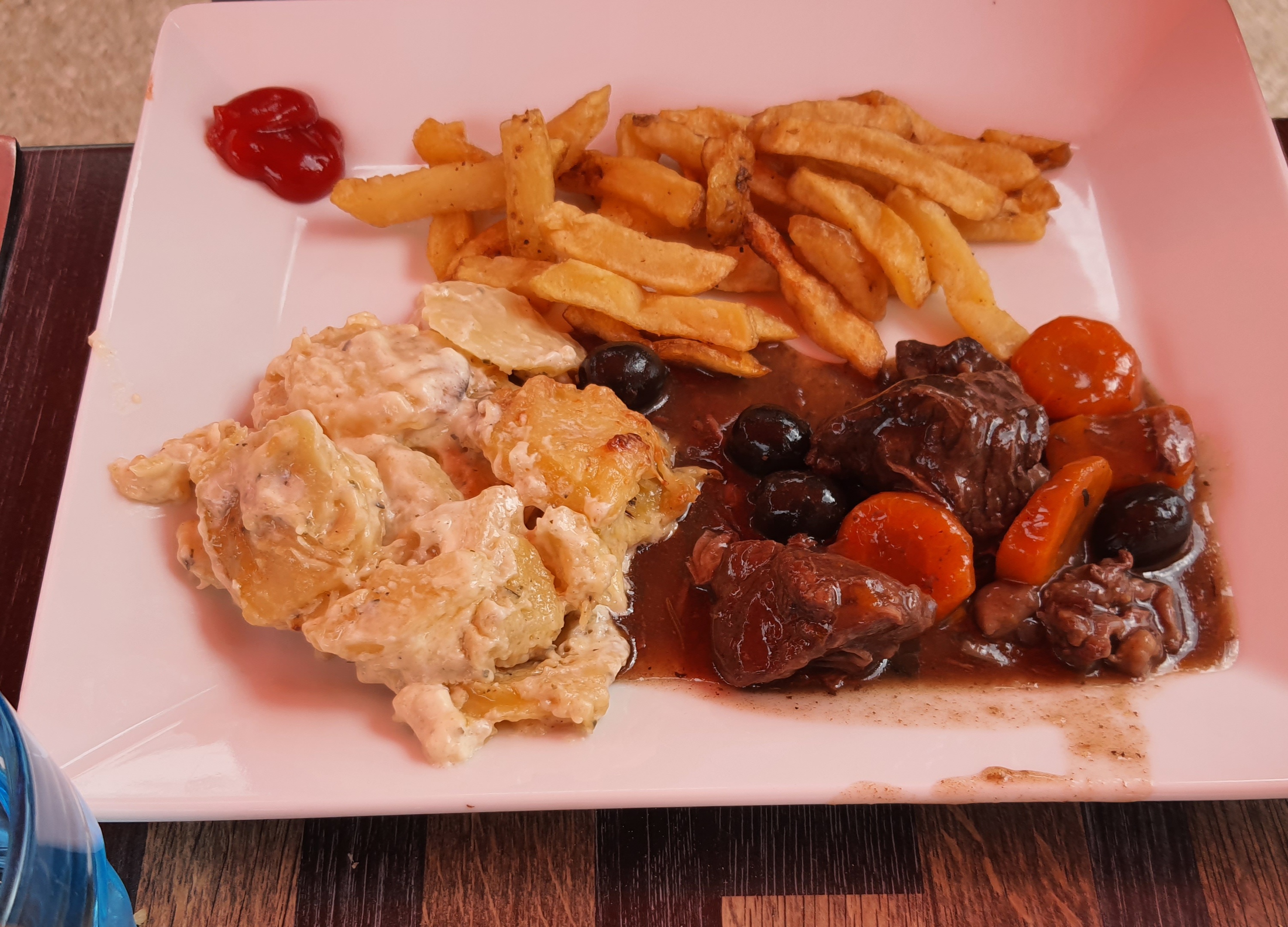 Un bon buffet à volonté Terre et Mer ! J'ai adoré les Moules, les crevettes et les bulot. J'y ai découvert la gardianne de taureau (spécialité de la région) et j'ai apprécié les autres plats, à l'exception des îles flottantes (totalement ratées le jour de notre venue...) Personnel sympathique et rapport qualité / prix très agréable !