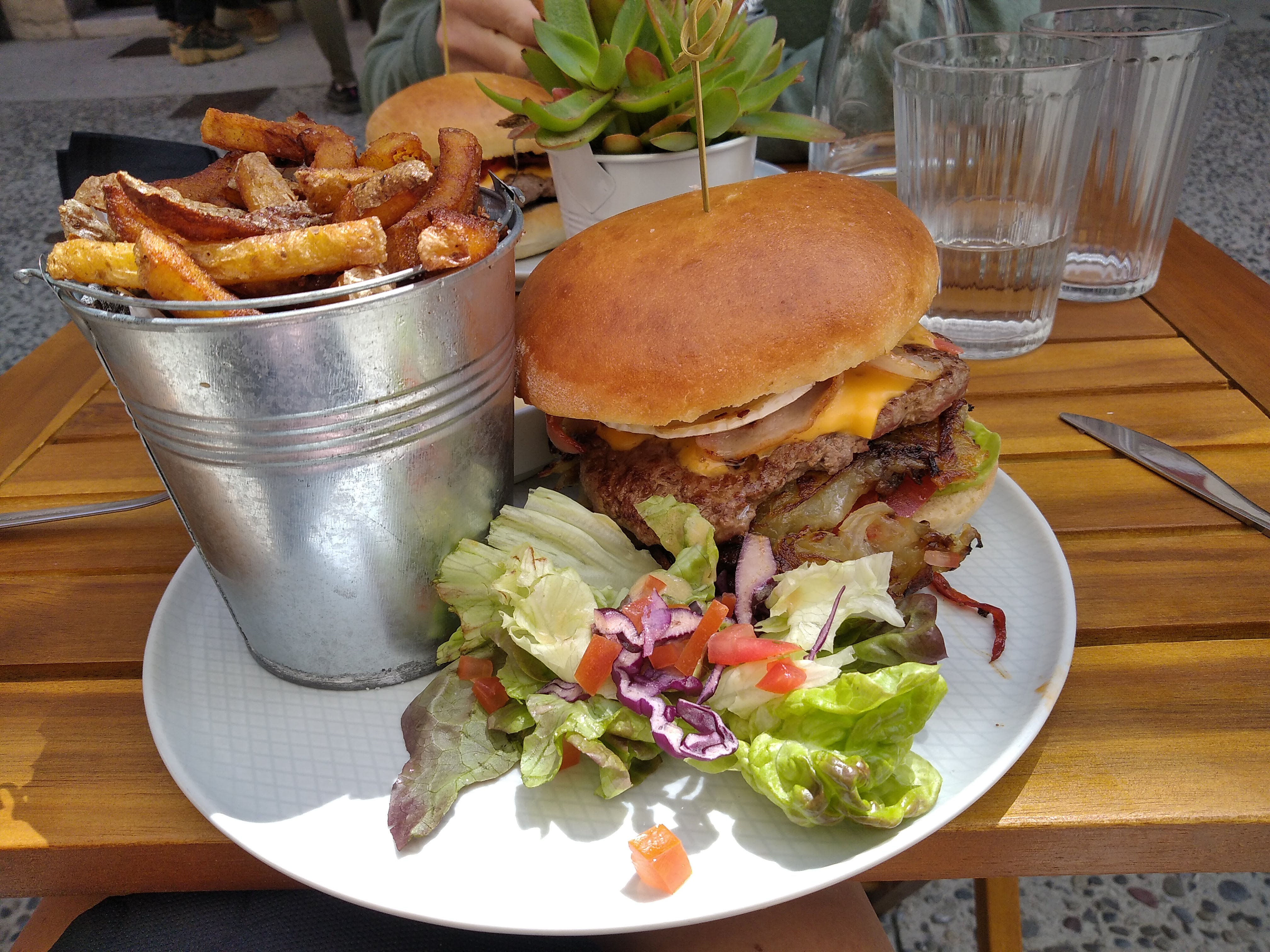 Bon Burger fait maison et très bonne restauration et service impeccable, un lieu calme et agréable pour déjeuner