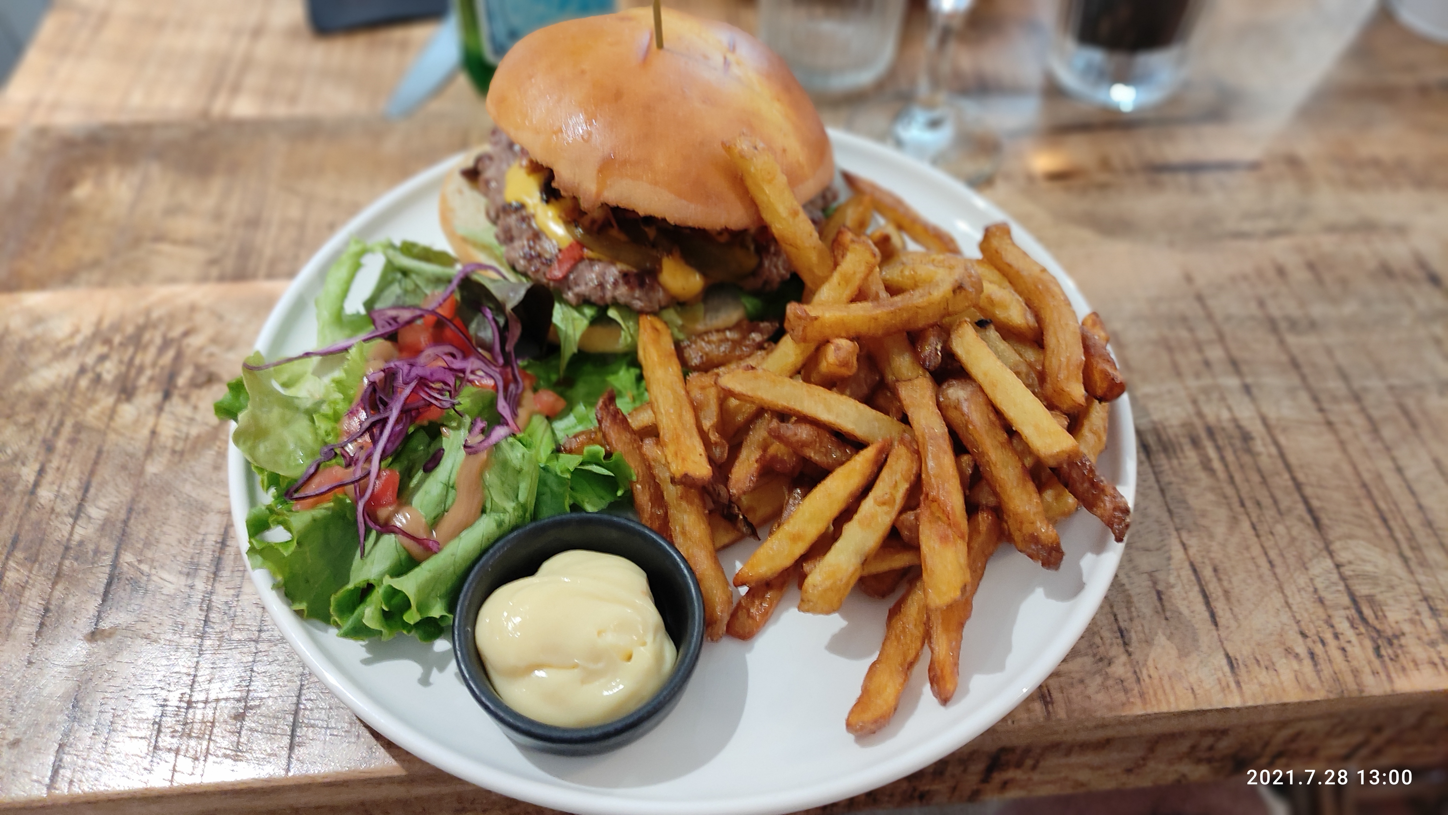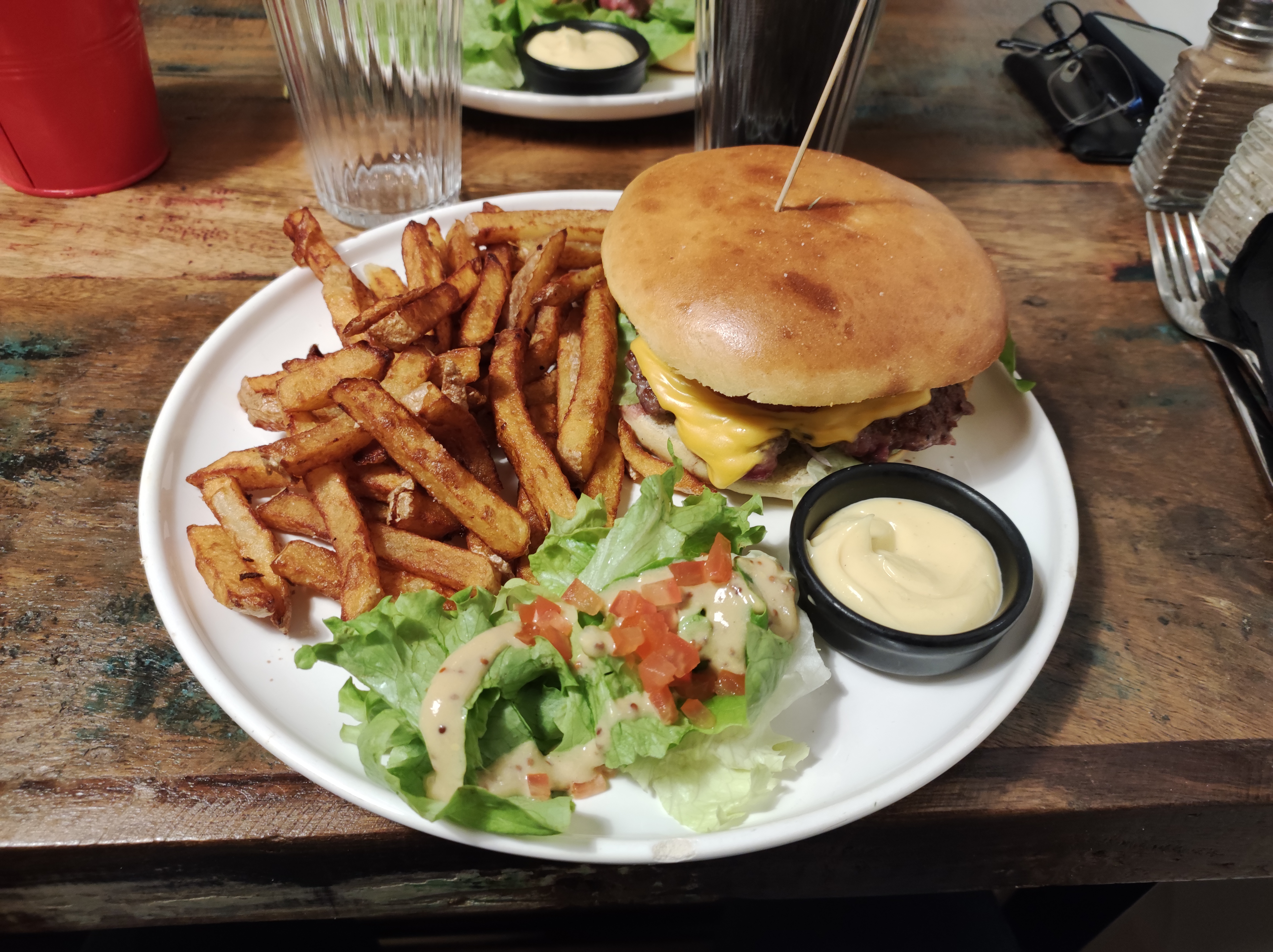 Hamburger sans plus, moi qui ne suis pas fan, j'en ai mangé de meilleurs. Plat à la carte, magret de canard, à 12h15, heure de notre arrivée, il n'y en avait plus ... Le service très correct, jeune dame très aimable et souriante, ceci compense cela ...