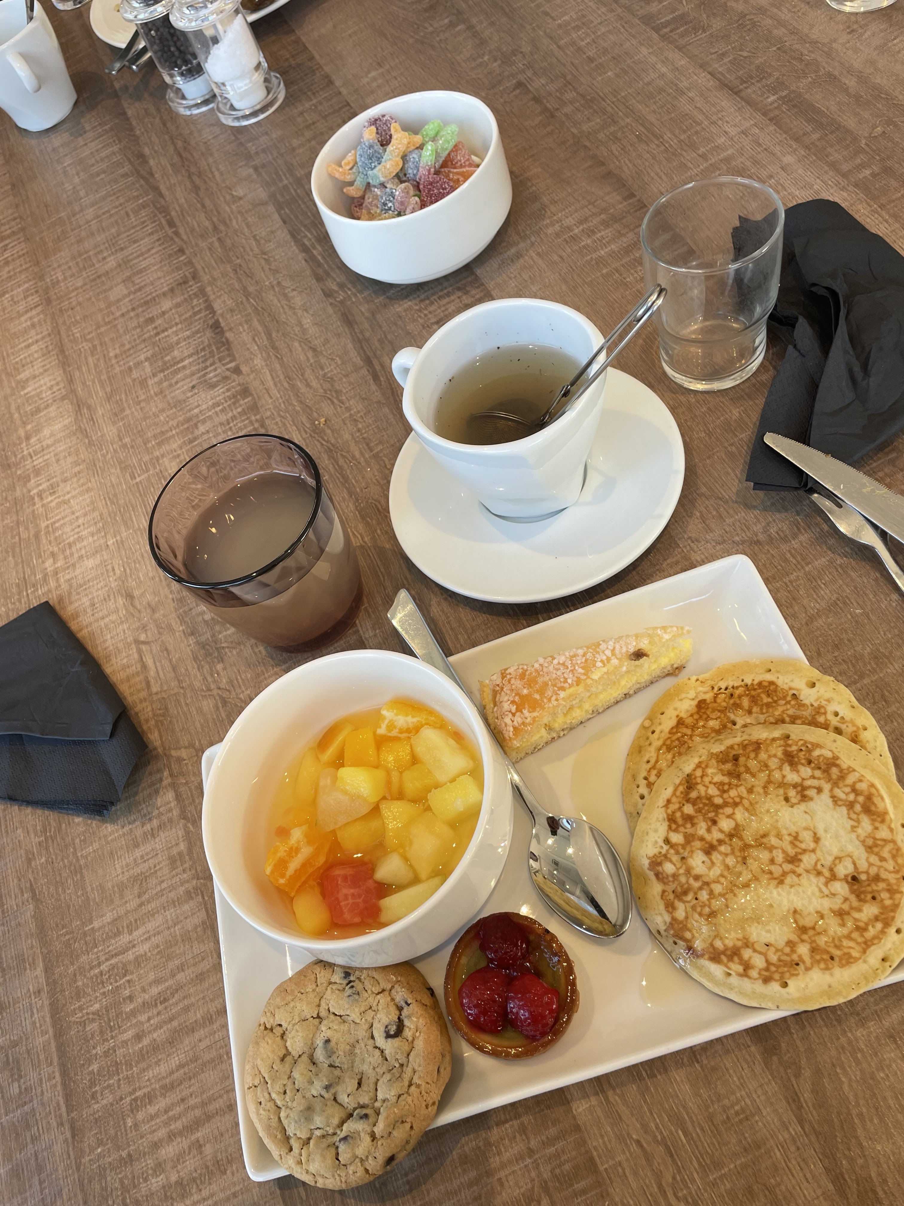 Même buffet qu’un petit déjeuner dans un hôtel basique et qui sait que j’ai eu l’occasion de fréquenter beaucoup d’hôtels lors de ma carrière professionnelle… inadmissible de faire payer 34€ par personne pour cette prestation…. Boules à thé sales, tasses tachées par le thé, qualité des produits bas de gamme… tenue du buffet laisse à désirer… les produits frais pas maintenus au frais malgré les températures extérieures élevées…