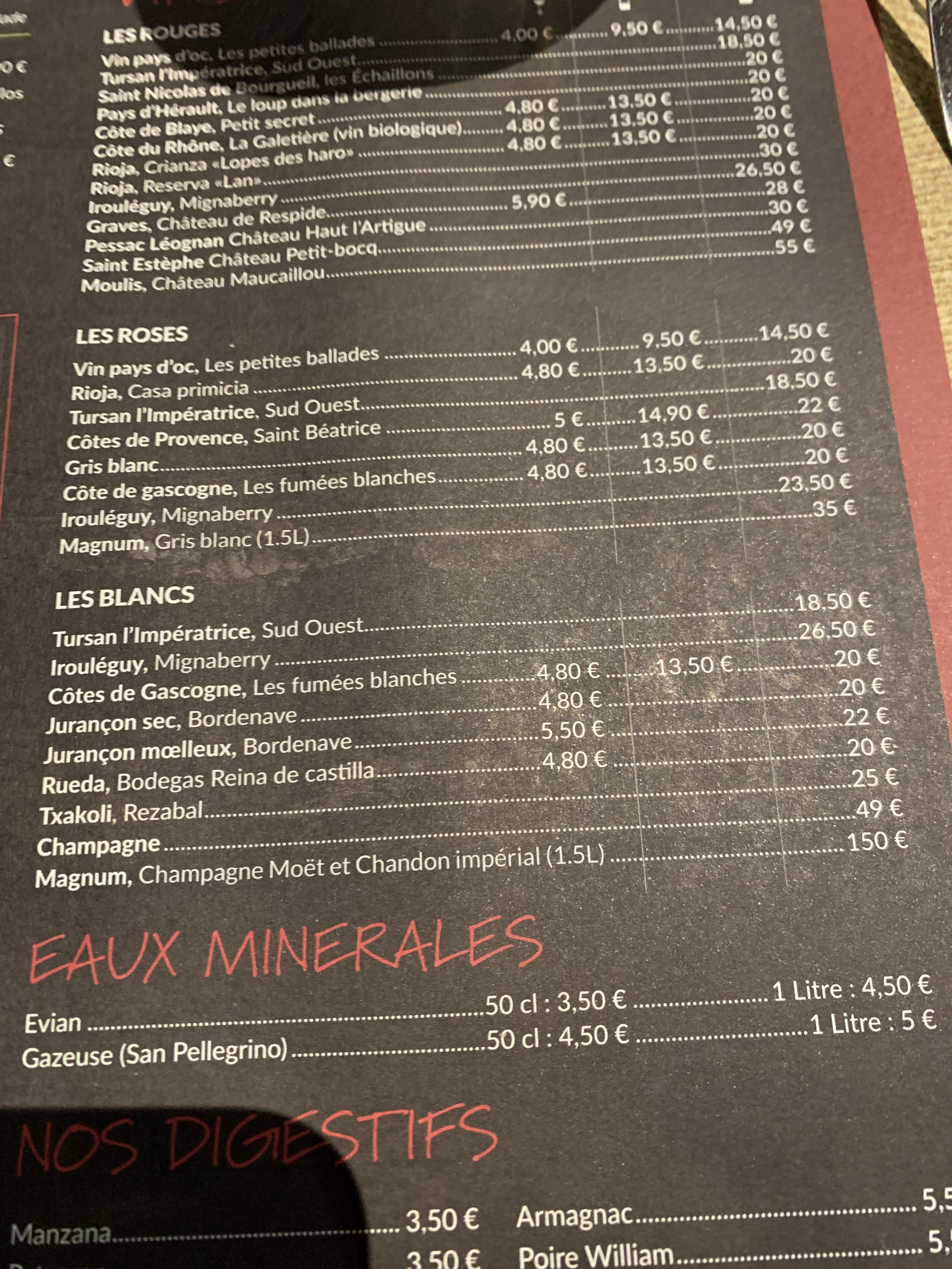 Nous sommes venus un soir et sommes restés environ 2H30 à table 😅. L’ambiance est chaleureuse mais ne vous attendez pas à vous reposer et à un environnement calme pour la soirée. Nous avons finis le repas avec le gérant qui hurlait presque avec ses amis à côté de nous. Une ambiance presque trop « familiale » si l’ont n’est pas des habitués du lieu. Sur le rapport qualité / prix il n’y a absolument rien à dire ! Les quantités sont très généreuse et c’est très agréable. Les serveurs sont très aimables mais très familier comme précisé plus haut. La petite planche de tapas, qui est excellente des produits bien faits et bien choisis. Le menu à 26€ est un très bon choix et en plus valable le soir. Les choix sont nombreux. Le foie gras maison est très bon et on sent qu’il n’est pas industriel tout comme la poêlée de chipirons. L’entrecôte, un peu maigrichonne avec pas mal de nerfs qui ressemblait plus à un faux filet. La sauce au bleu très bonne ainsi que les frites maisons. Les assiettes sont très bien accompagnées. La sauce au foie gras avec le Burger est très lourde et il manquerait un peu d’armagnac dedans pour relever le goût. En dessert la salade de fruit tout aussi généreuse et avec des fruits frais. C’est un excellent restaurant, on en a vraiment pour son prix. Comme indiqué cela n’est pas pour passer une soirée au calme mais plutôt à la bonne franquette. L’attente est très longue. Mais les serveurs ont toujours été attentifs.