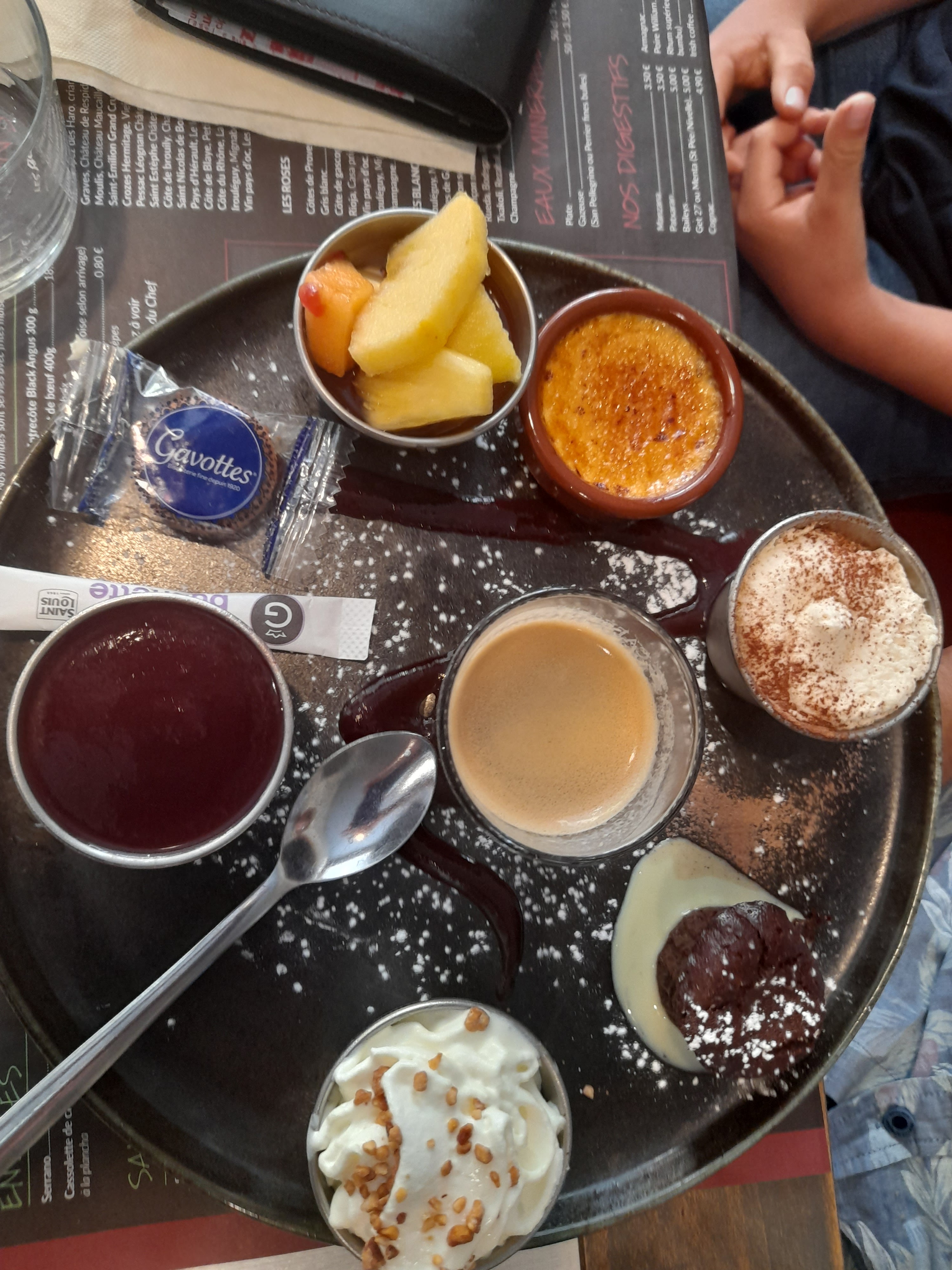 Nous avons bu verre en face du lac puis un petit plat pour finir la journée, à la fin du repas j'ai choisis un café gourmand plutôt copieux ,fin et esthétique, je vous le recommande