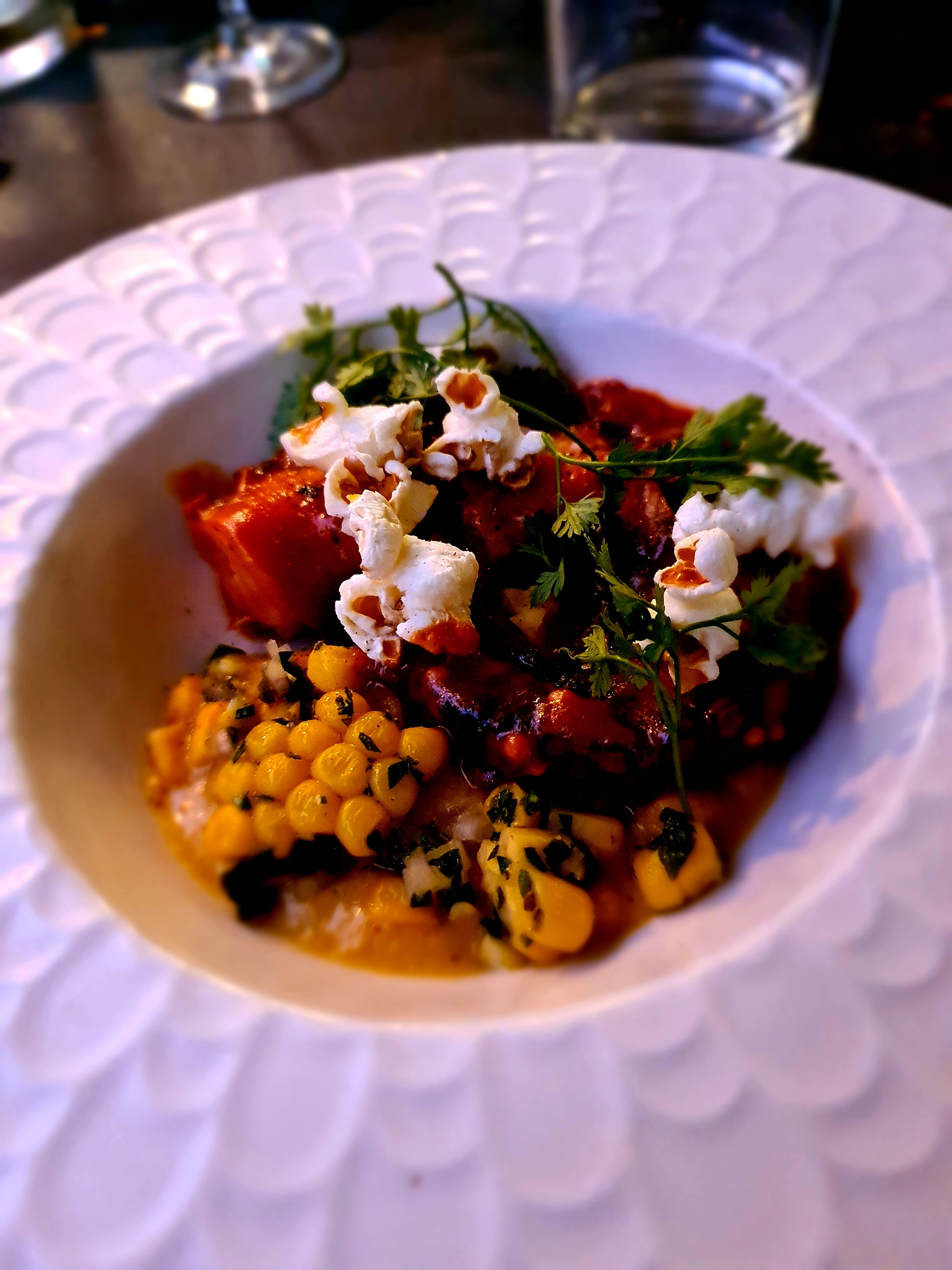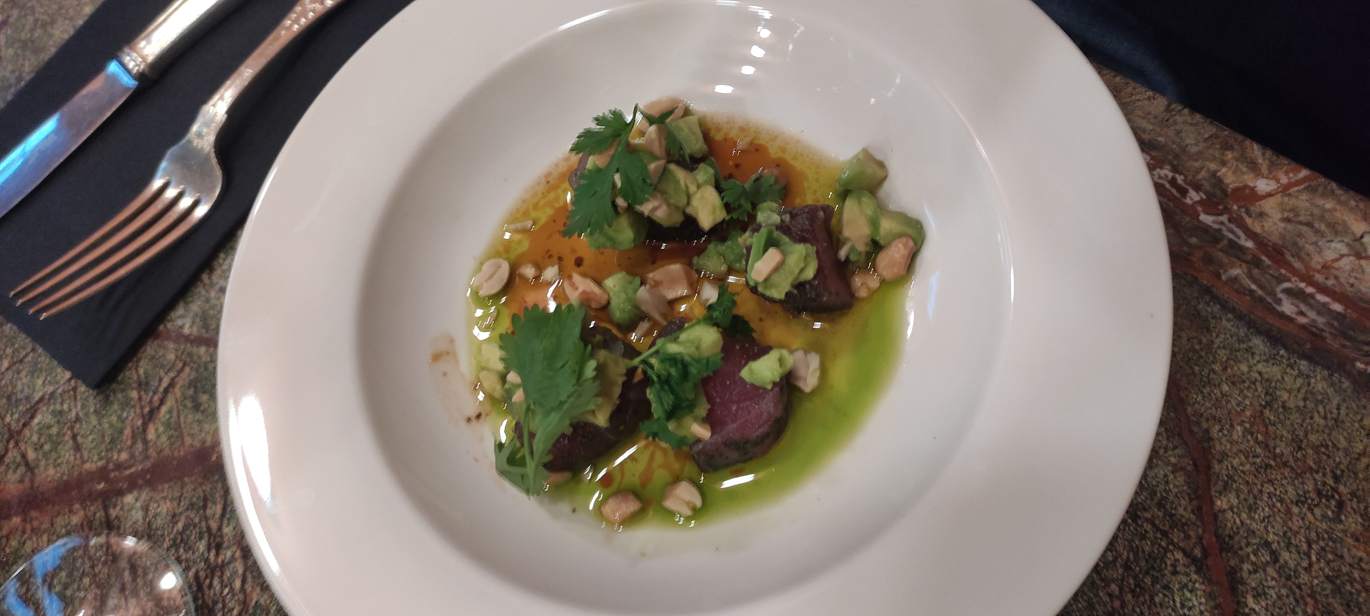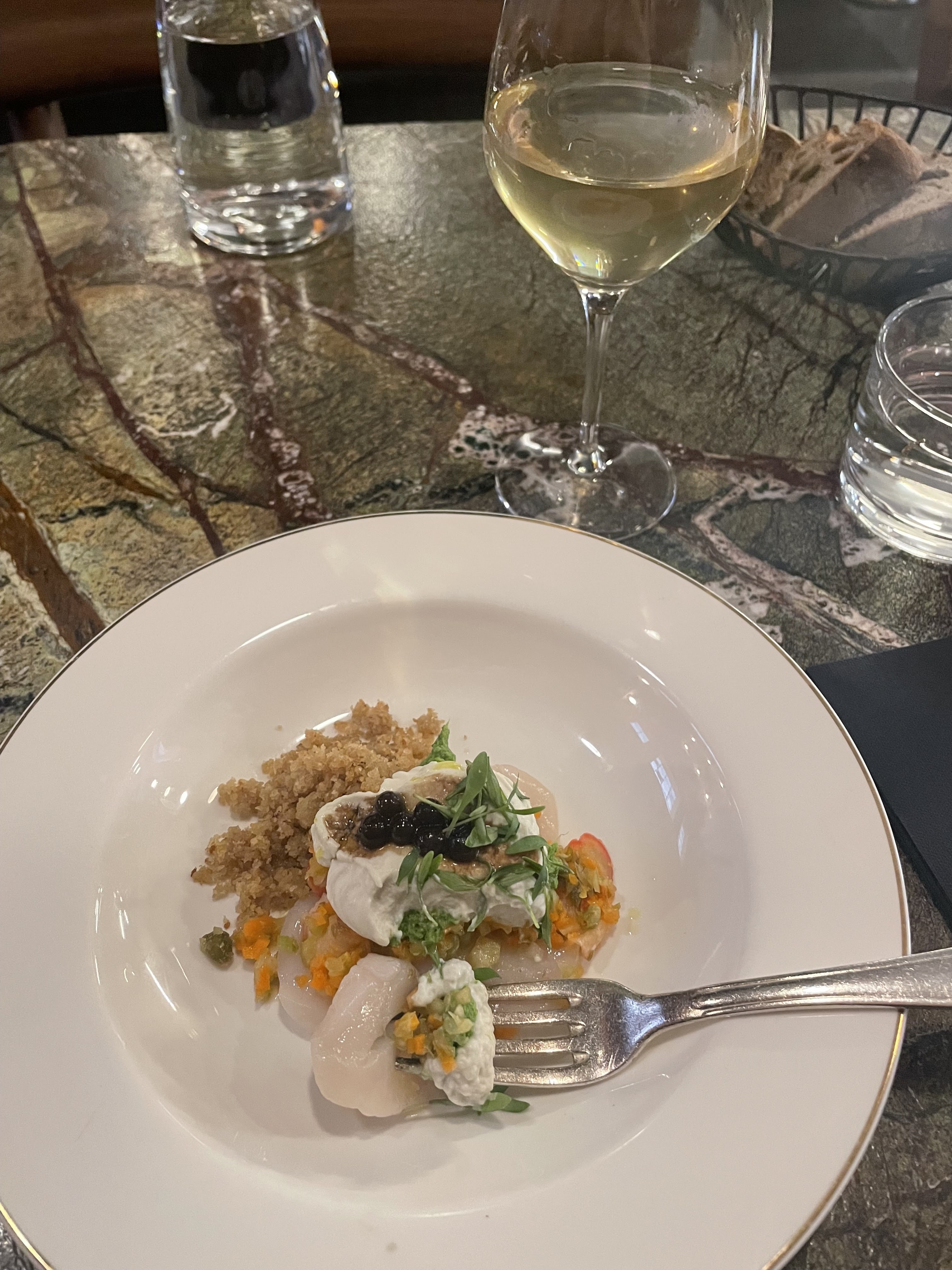 Absolument incroyable. J'ai mangé les 5 plats que j'ai accompagnés de vin. Les coquilles Saint-Jacques étaient incroyables ainsi que le dessert. Le bœuf Angus était bon, mais il contenait un tout petit peu de tendon, mais il était quand même excellent. Les vins étaient parfaitement assortis, le serveur a expliqué le plat et le vin pour chaque plat.