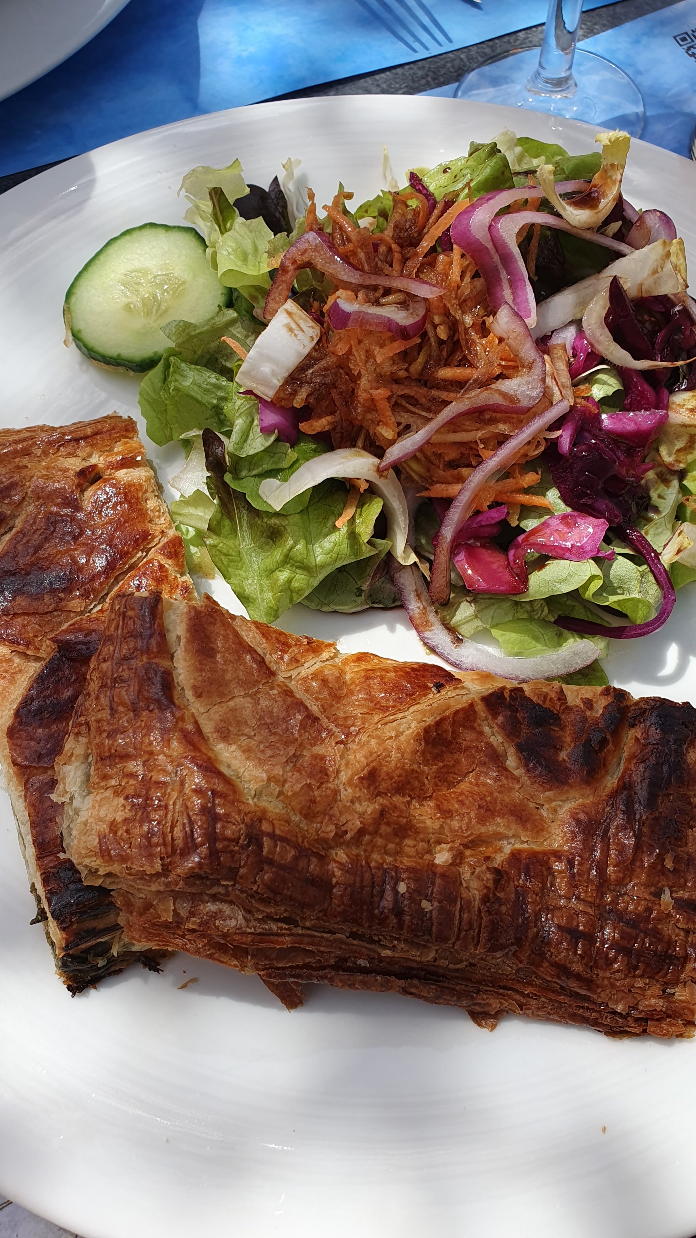 Cuisine correcte mais service désinvolte (il aurait dû nous être précisé que la salade de l'entrée était la même que l'accompagnement du plat du jour - 2 salades quasiment identiques dans le même repas c'est une de trop) J'ai noté une x car aucune mesure sanitaire n'est respectée, pas de masque y compris en intérieur, salle et cuisine (le personnel n'en a même pas un sous le menton ou sous le nez pour faire semblant) et bien sûr le pass n'est pas demandé. Et ceci malgré la publicité tapageuse à l'entrée sur l'éxigibilité du pass...