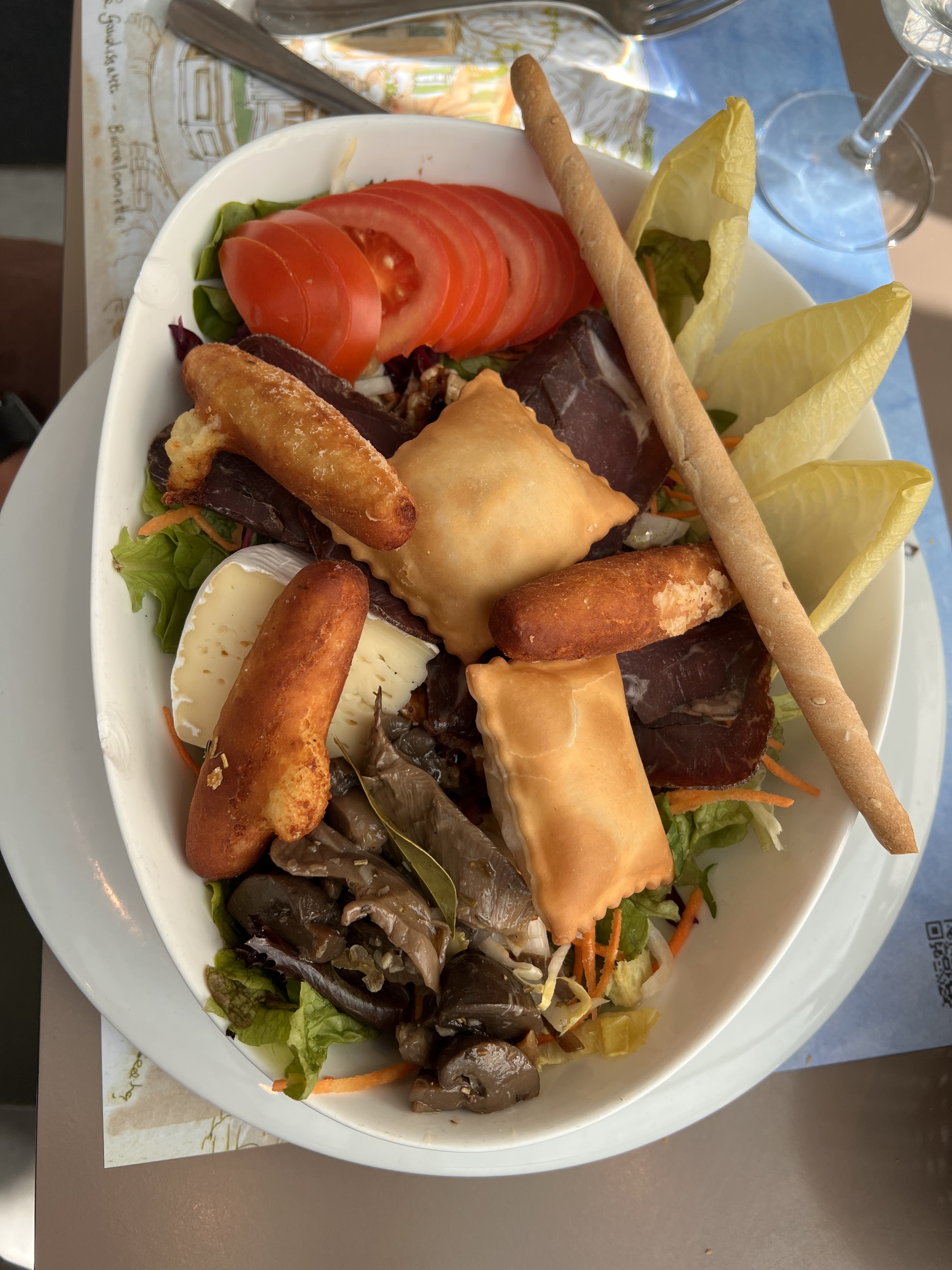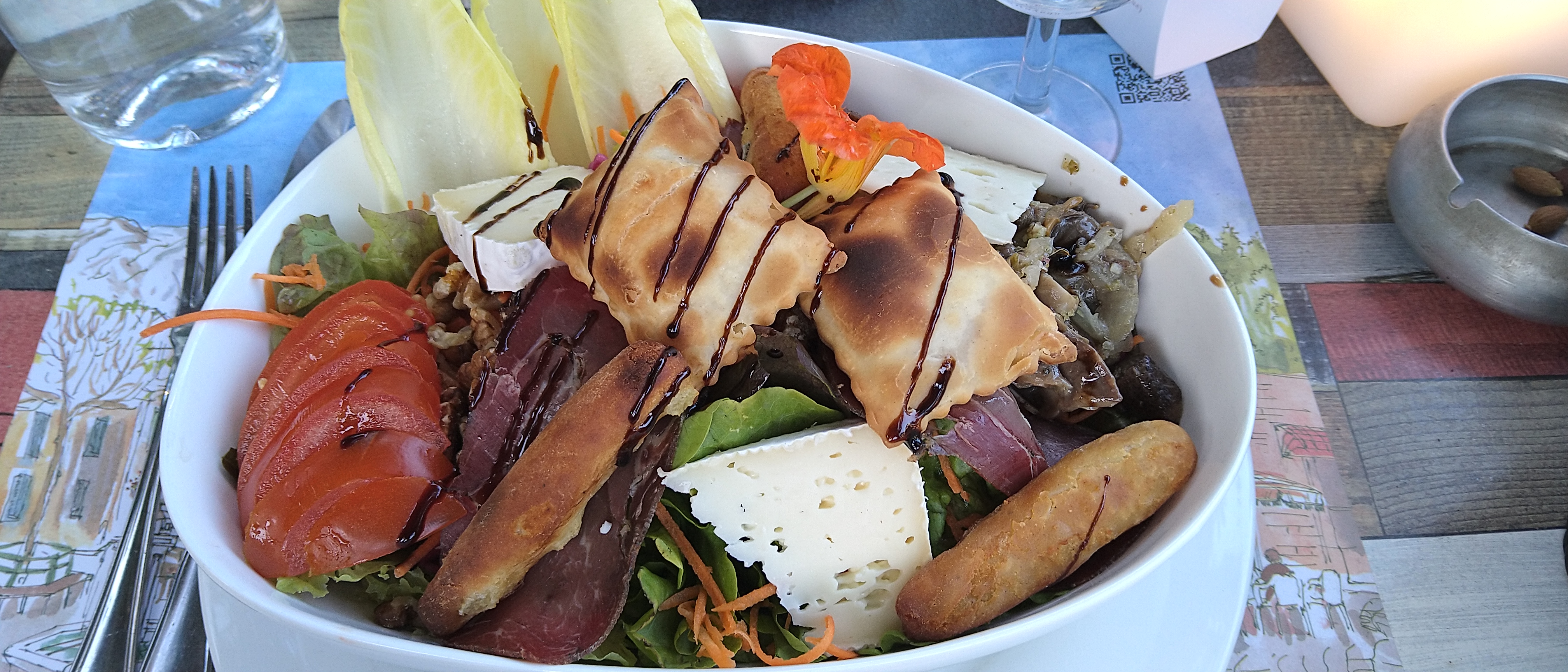 On sert ici la plus délicieuse salade sud-ouest que j'ai jamais goûtée + du bon vin blanc sec. À ne pas manquer.