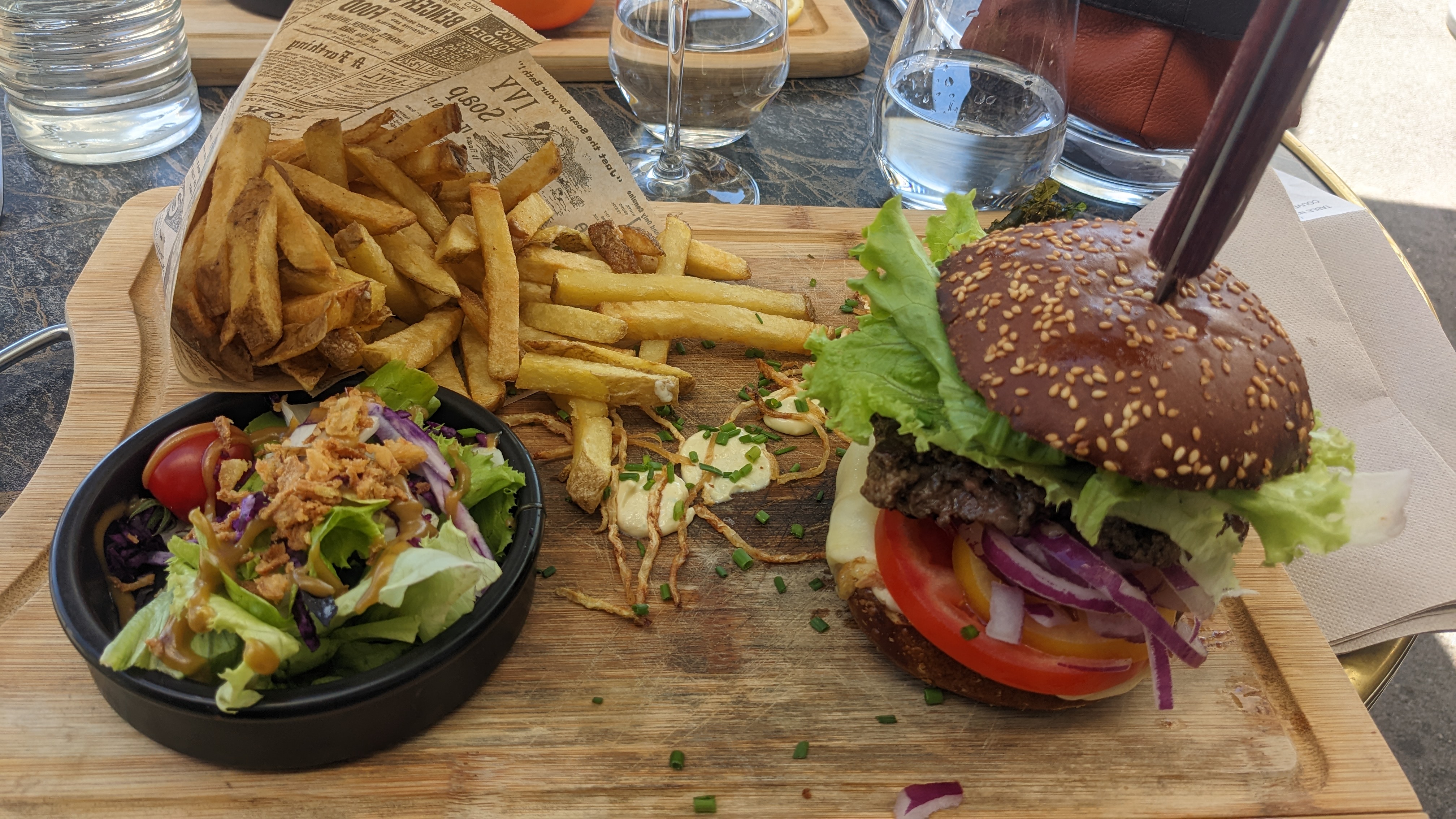 Super accueil , j ai choisis une table à côté de la sortie , ce qui veut dire courant d’air à cause des personnes qui ne fermais jamais la porte quand ils sortent .. La gérante veillée à chaque fois que la porte soit ferme donc, ce n’était absolument pas dérangeant d’être à côté la sortie ce qui est rare ! Merci beaucoup à la gérante Les serveuses sont super gentilles, rapide et efficaces , malgré tout le monde qu’il y avait ! Mon copain a pris un hamburger il s’est régaler , ce ne sont que des produits frais ! J’ai pris une salade , j’avais peur qu’elle soit peu fourni , et bien pas du tout ! Une superbe assiette remplie et super bonne ! Je recommande