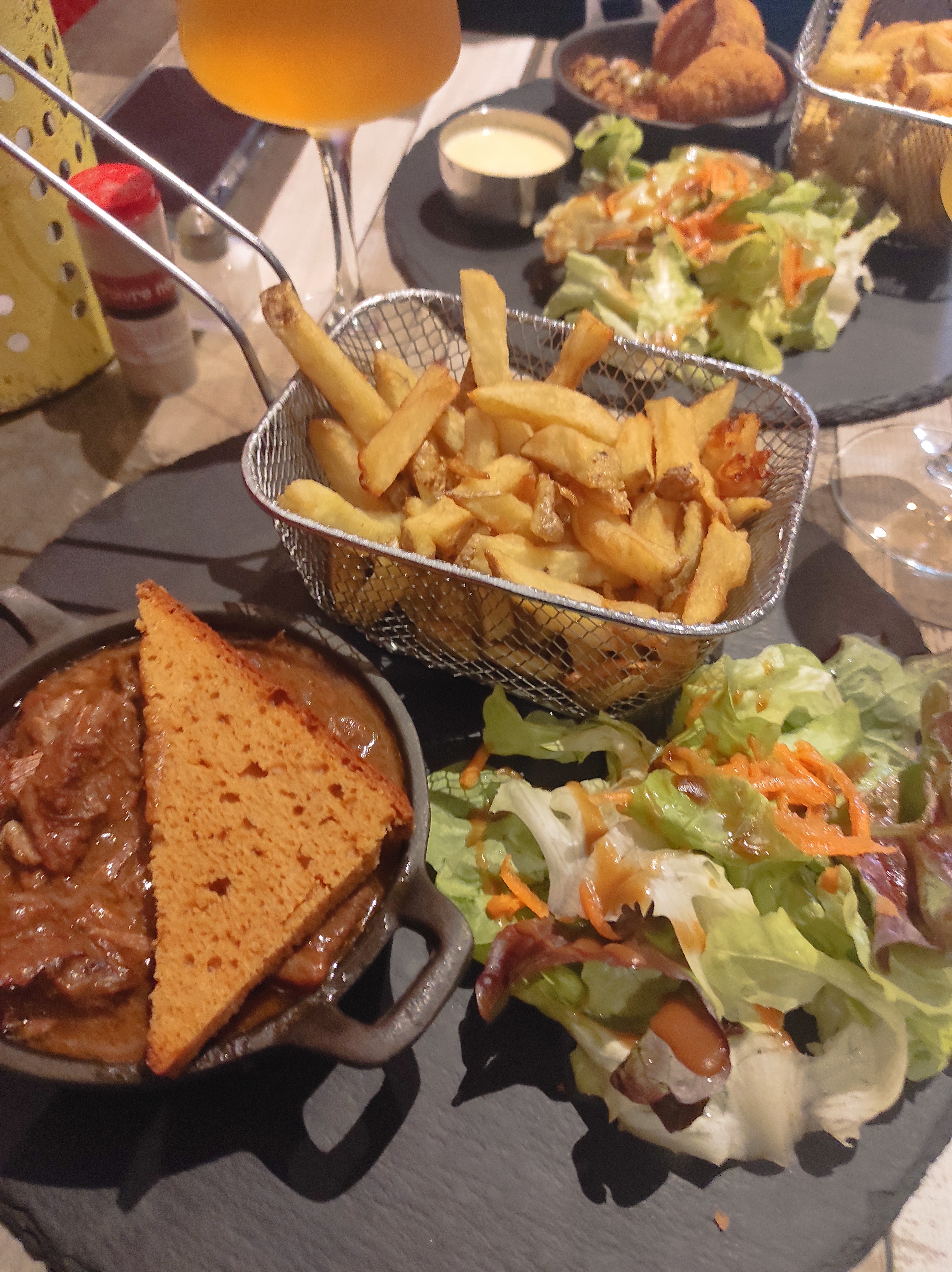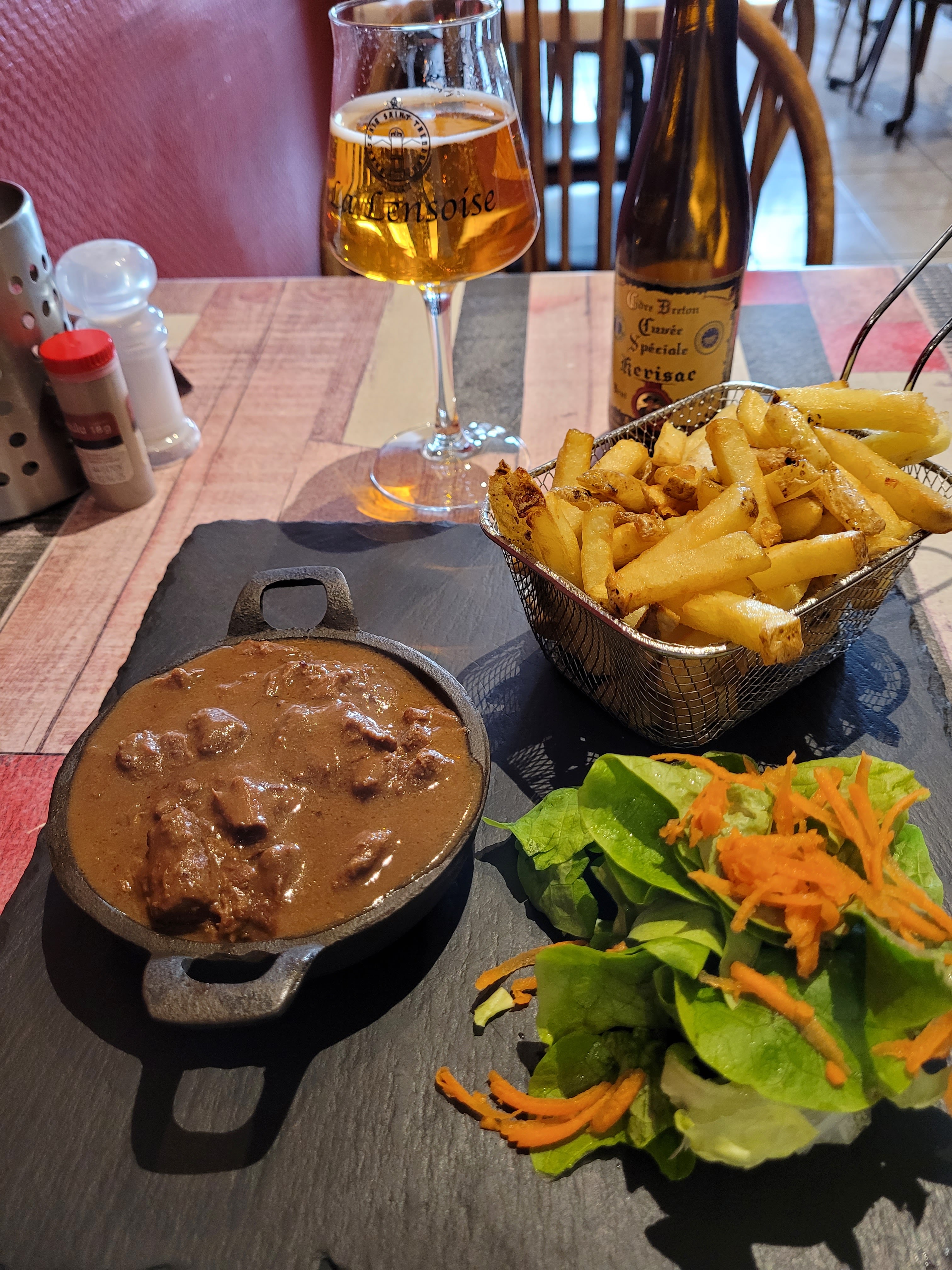 Une bonne petite carbonade Flamande au déjeuner avec du cidre. Ça fait du bien.