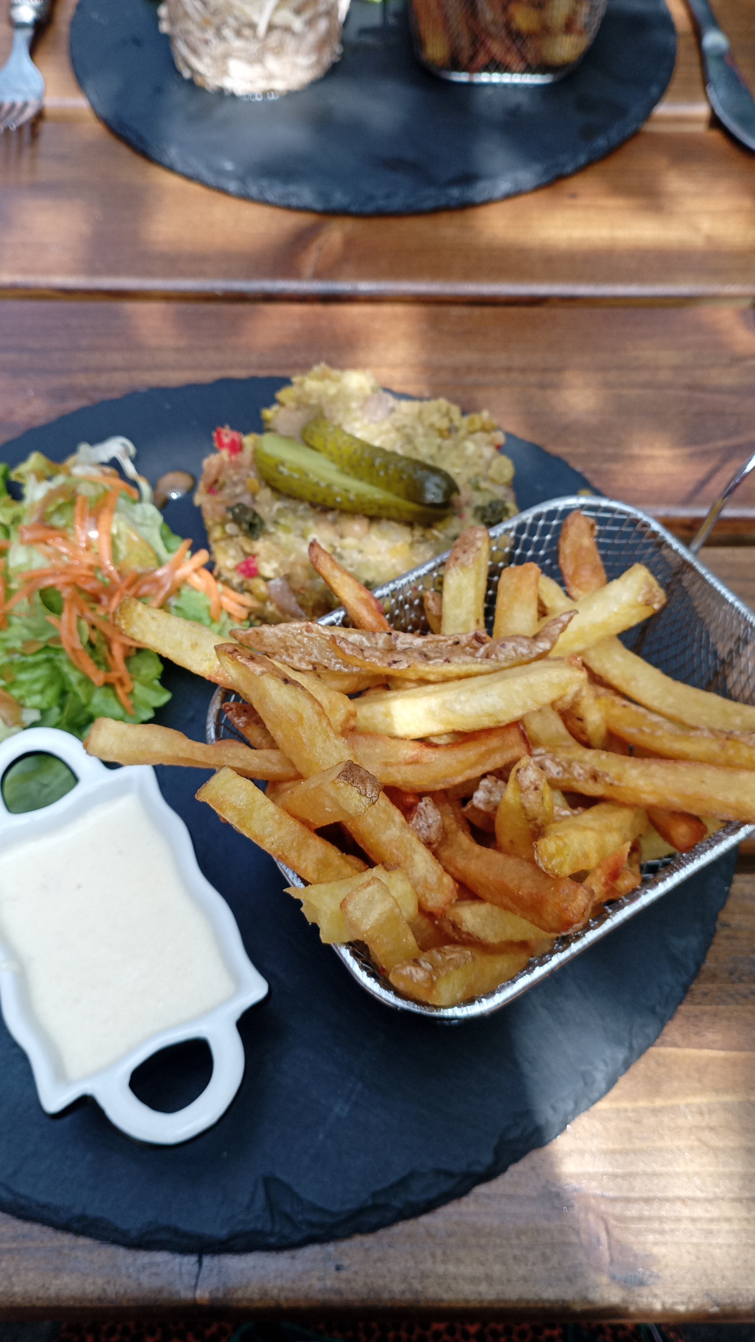 Ambiance et accueil super malgré le monde. Prix raisonnable et bien servi. Seul bémol, les frites pas assez cuites, trop molles. Est-ce cuit comme il faut ? Deux cuissons dans de la graisse de bœuf ? Sauce au maroilles excellente. Desserts aussi fabuleux faits par le papa de la propriétaire. Merci monsieur (pâtissier)