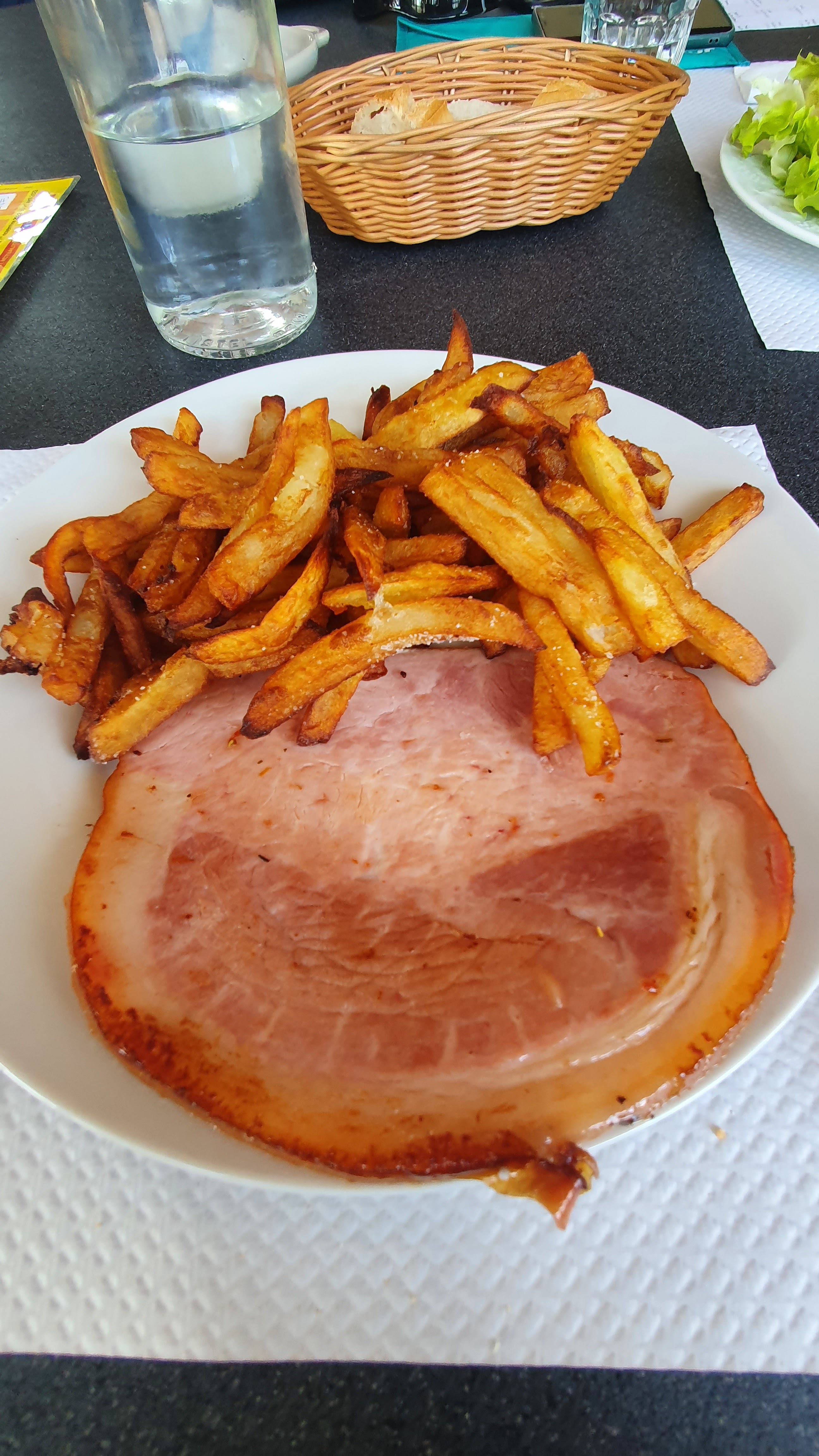 Frites de suif !!! La viande était bonne aussi. Le pain vient d'une boulangerie locale et est également très bon. Si vous souhaitez éviter toute huile végétale, veillez à éviter les vinaigrettes pré-préparées sur les salades. Ils ont la spécialité régionale pâté de Pâques selon la saison - que vous devriez essayer si vous êtes dans la région. Vous pouvez demander des cartons pour emporter les restes si besoin. Vous pouvez rechercher des artefacts vintage en attendant la nourriture. Tables à l'intérieur et à l'extérieur. A côté d'une route mais ce n'est pas très gênant.