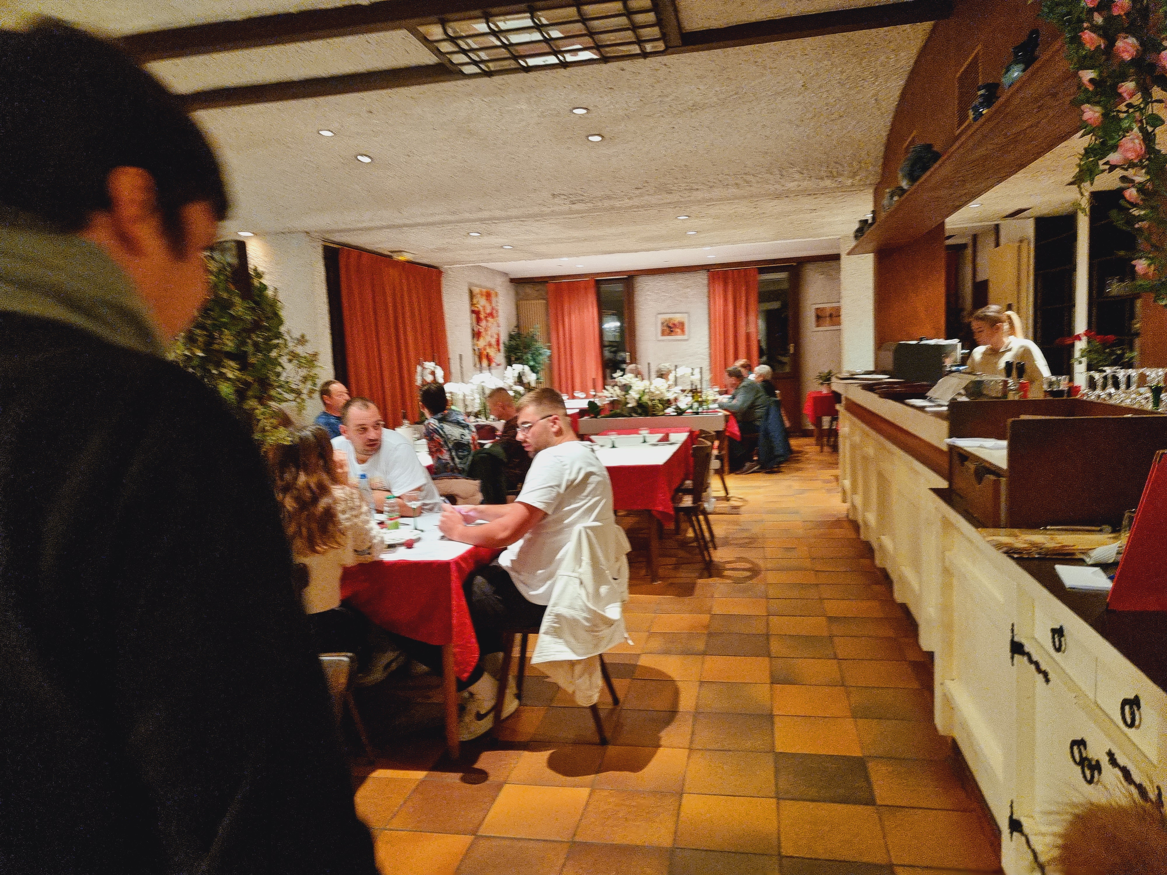 Restaurant plein et ça ne suis pas.. La course du vendredi soir (serveuse) 15-20min entre chaque tarte flambée une honte Chien accepter ok mais pas qui aboie à tord et à travers... Je suis très déçu j'espère une nett amélioration