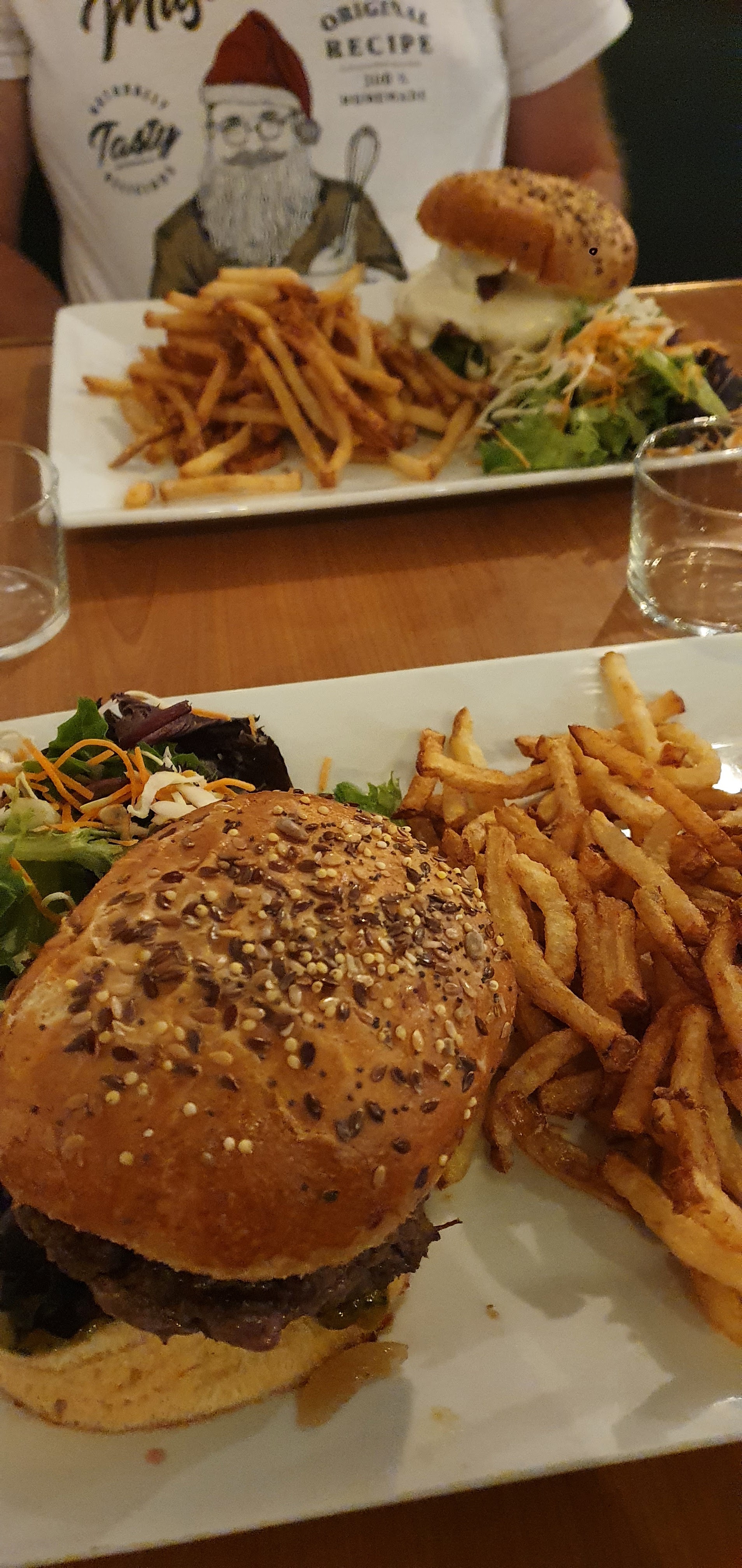Endroit sympathique et chaleureux , serveurs agréables et souriants Pour la cuisine je ne mets que trois car la viande des burgers de mes amis étaient juste tièdes et en ce qui concerne les frites beaucoup étaient noires comme si c était un fond de plat et c est juste pas possible. C est dommage car sans ça les burgers étaient vraiment très bons, ma salade était délicieuse et copieuse. Les desserts copieux et très bons également. Un petit bémol pour le café ou le thé gourmand qui ont des portions de dessert un peu justes.