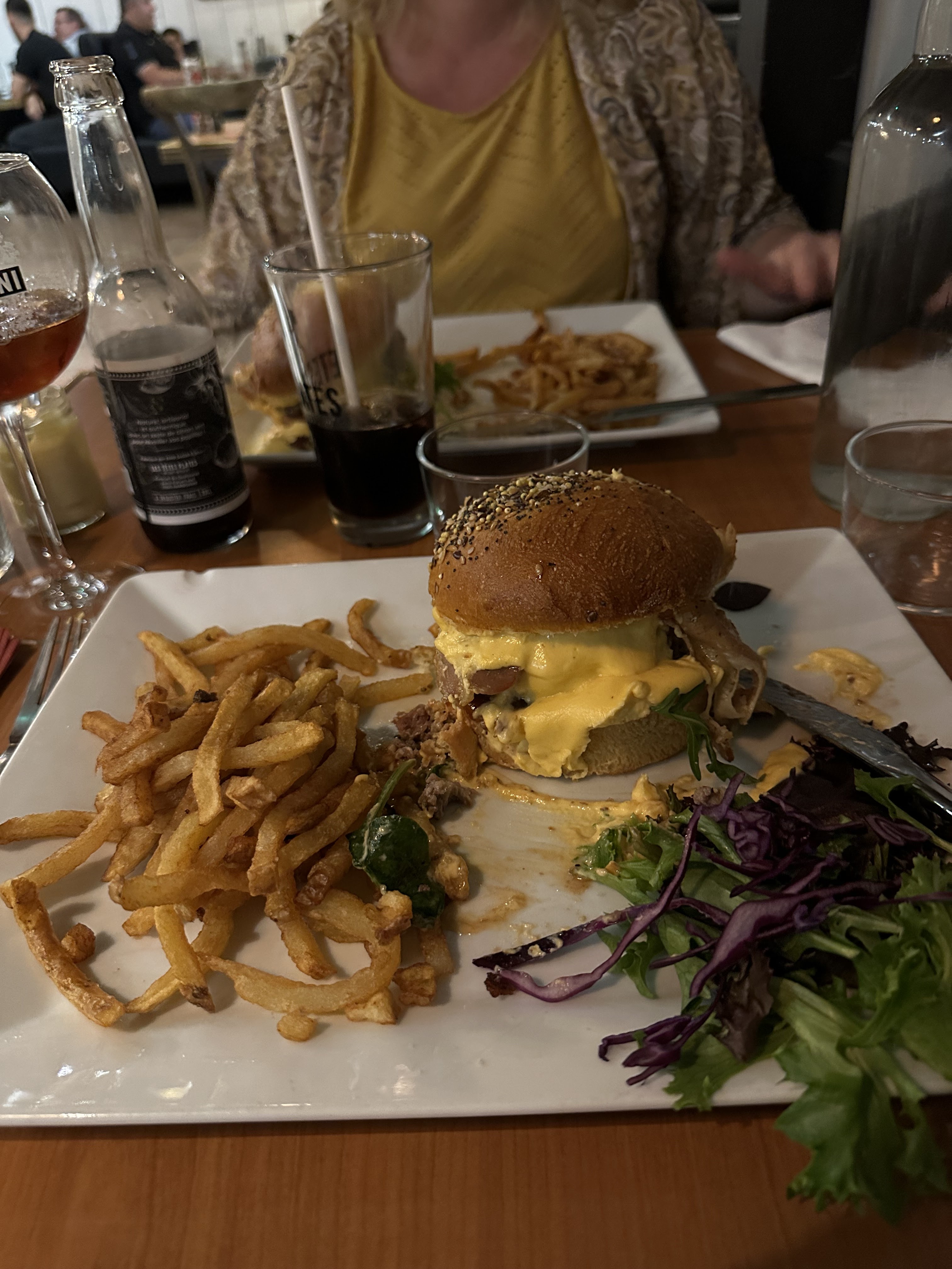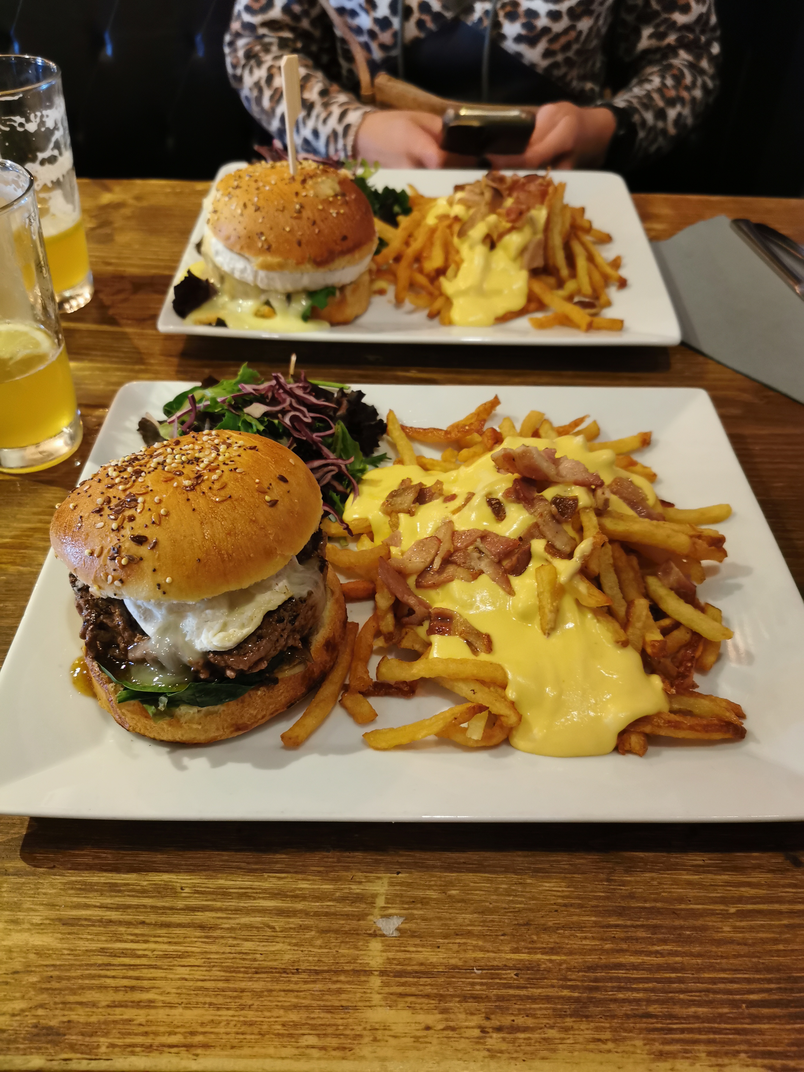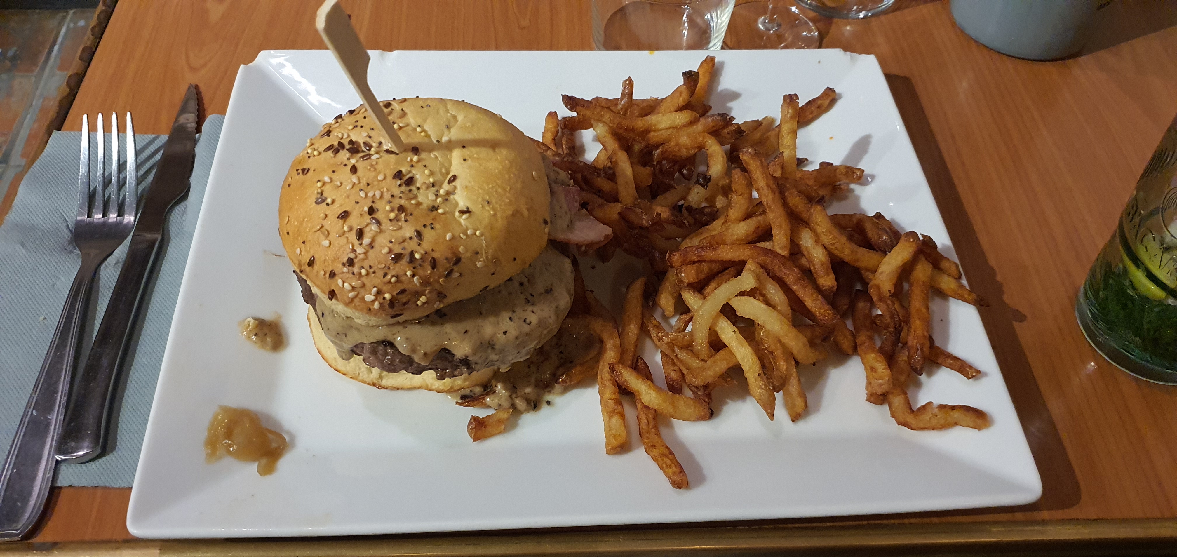 Le serveur nous prend la commande des apéritifs nous étions pas encore dévêtus ni assis.. L’apéritif arrive en même temps que les burgers service rapide ok , mais c’est expéditif.. Les burgers sont très bon! La viande est très bonne, il y a une belle quantité de cheddar. Tout comme les frites. Je reviendrai pour la qualité des plats
