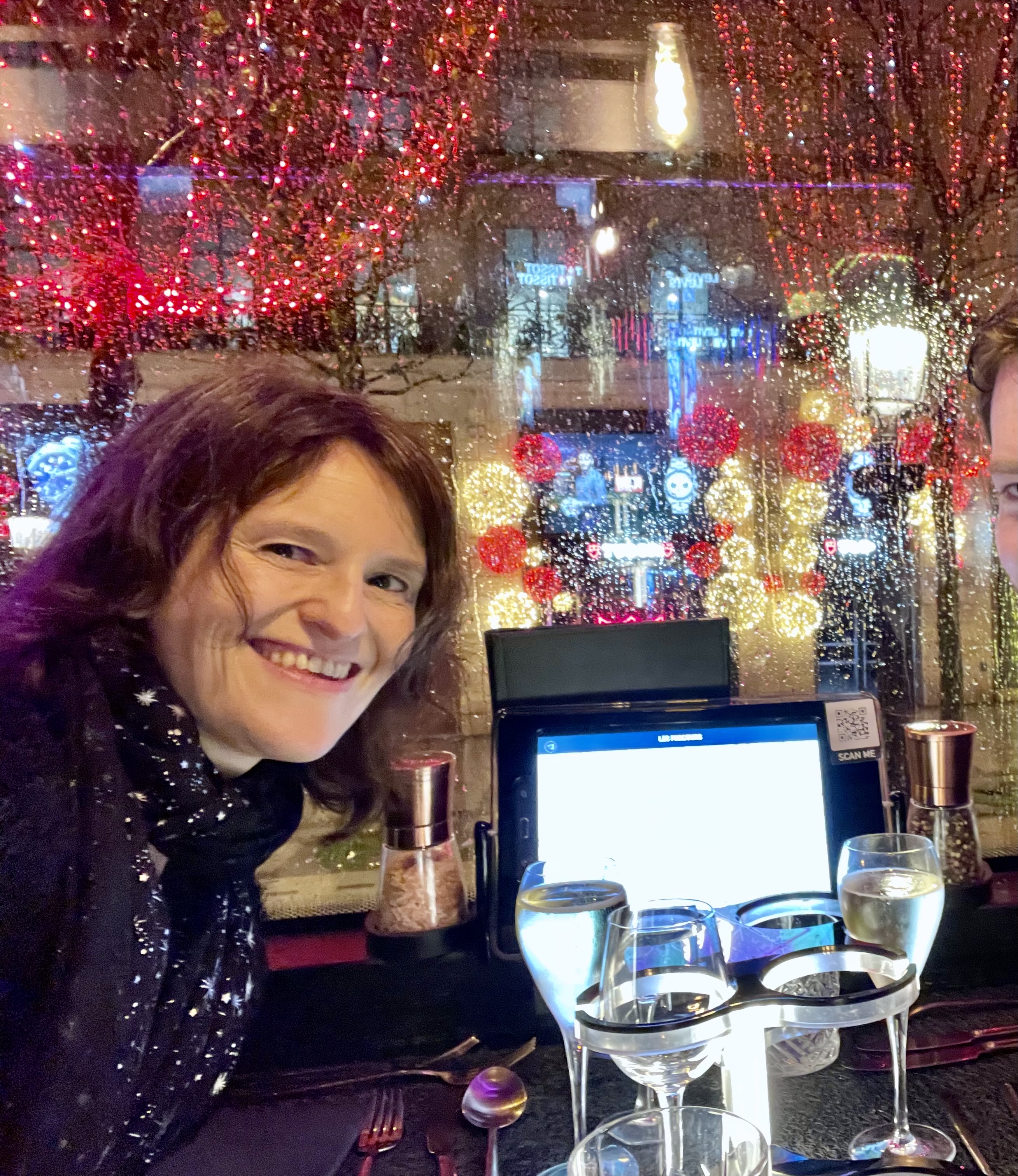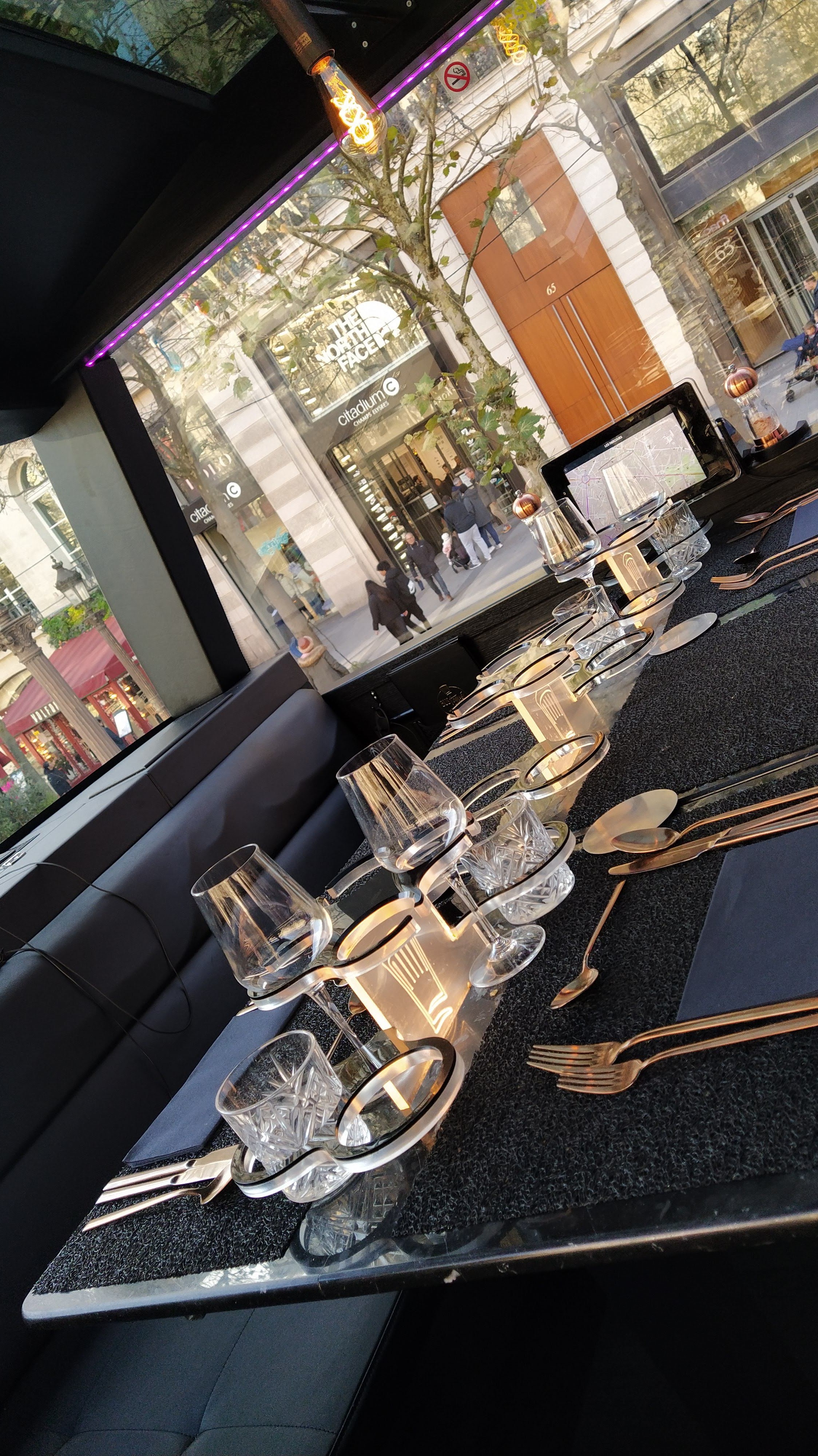 Concept très original, déjeuner ou dîner tout en faisant le tour des plis beaux monuments de Paris. Personnel sympathique. Chauffeur exceptionnel, quelle conduite toute en douceur ! Quelques précisions : - le rendez-vous est au 67 avenue des Champs-Elysees, mais aucune indication n’est visible. Le bus finira par arriver, vous avez juste à patienter sur le trottoir devant numéro 67 (ou 65 ça fonctionne aussi). Pas d’abri, penser à prendre un parapluie si le temps l’exige. - possibilité de changer des éléments du menu sans surcoût. Le menu s’adapte aux végétariens, aux intolérances, et même aux goûts. L’agneau a été ainsi remplacé à ma demande par une délicieuse volaille. - pour le menu Paris by night, les 4 verres de vin sont : 1 Menetou Salon, 1 Viogner et 2 Haut Medoc cru bourgeois. Si vous buvez lentement, vous n’aurez pas 4 verres pleins : je n’avais bu qu’à moitié mon premier verre de Haut Médoc, et on me l’a simplement complété, sans en rajouter et sans me demander mon avis. - une tablette permet de suivre l’itinéraire et d’en savoir plus sur les monuments devant lesquels nous passons. Plusieurs langues disponibles. Service souriant et professionnel malgré quelques erreurs : mauvais plats servis (agneau au lieu de volaille - mais très vite corrigé), et en fin de repas, le décaféiné de mon ami n’est jamais arrivé. Le rapport qualité-prix est très correct. Ce n’est pas un attrape-touristes, la visite est magnifique, surtout avec les illuminations des fêtes de fin d’année, et les plats sont succulents.
