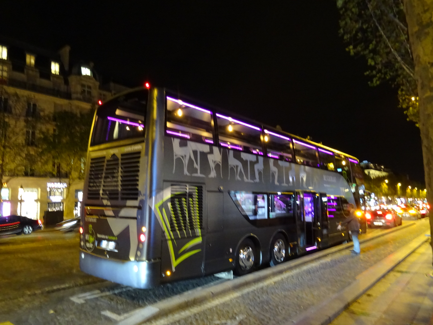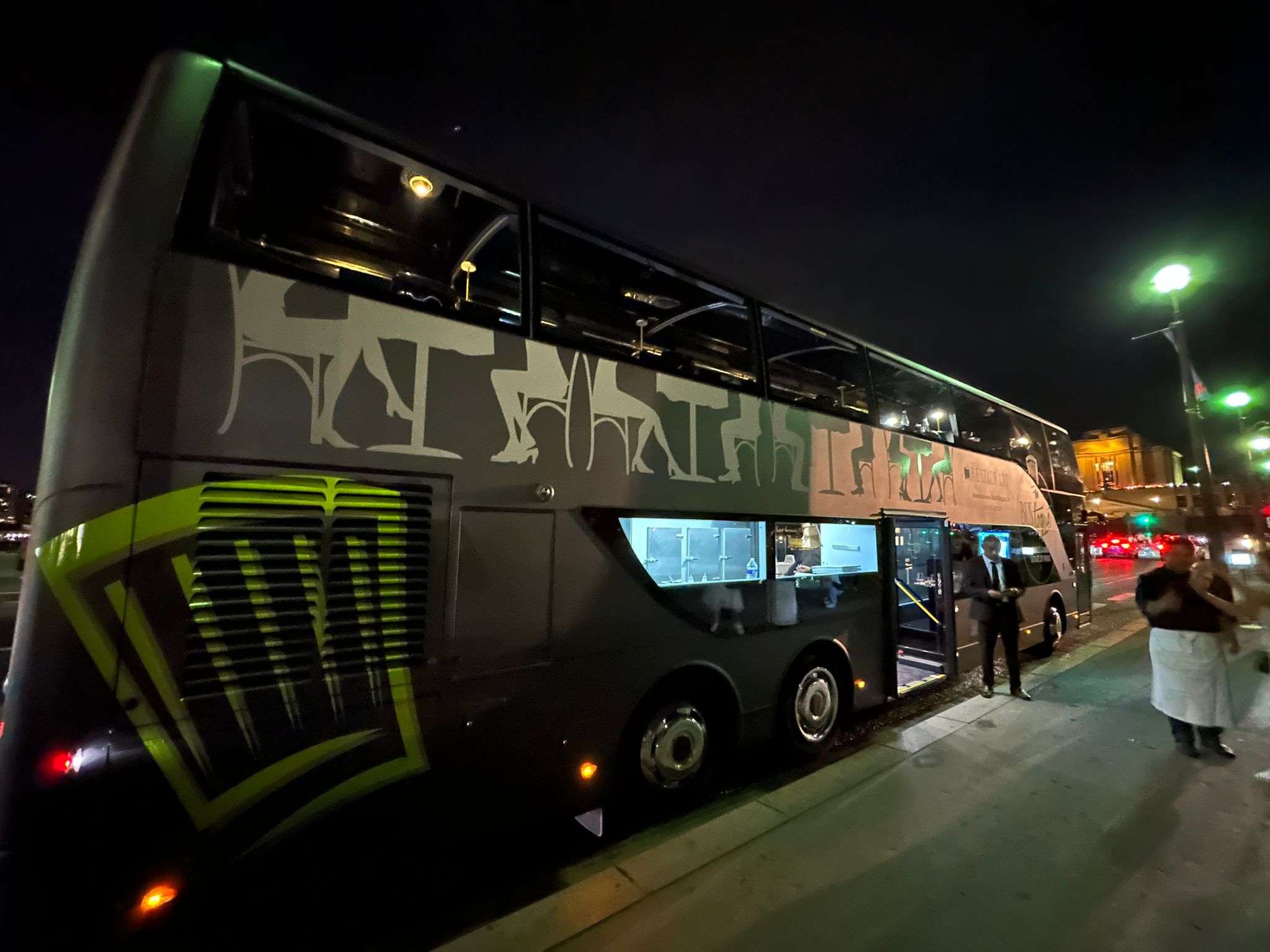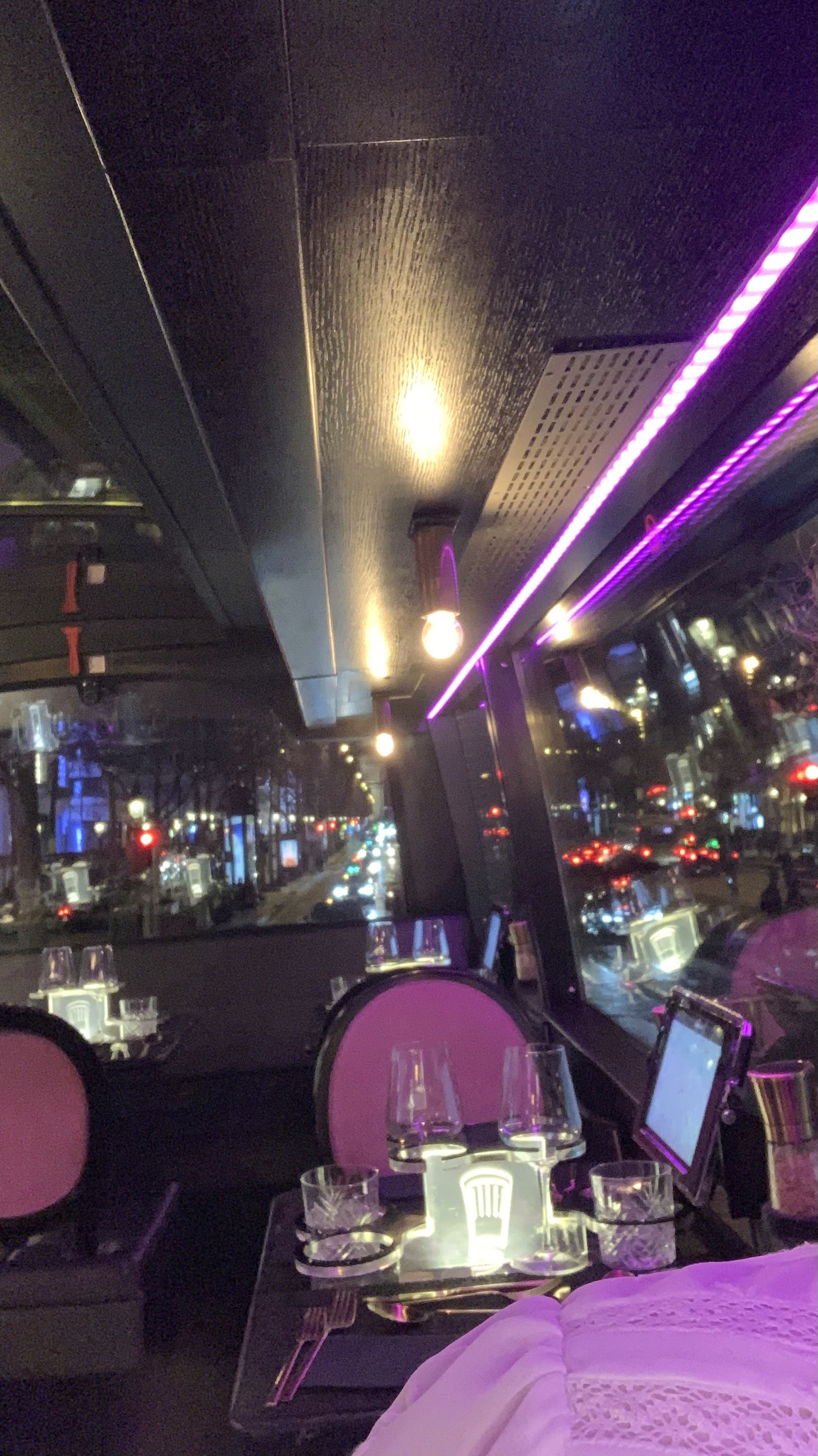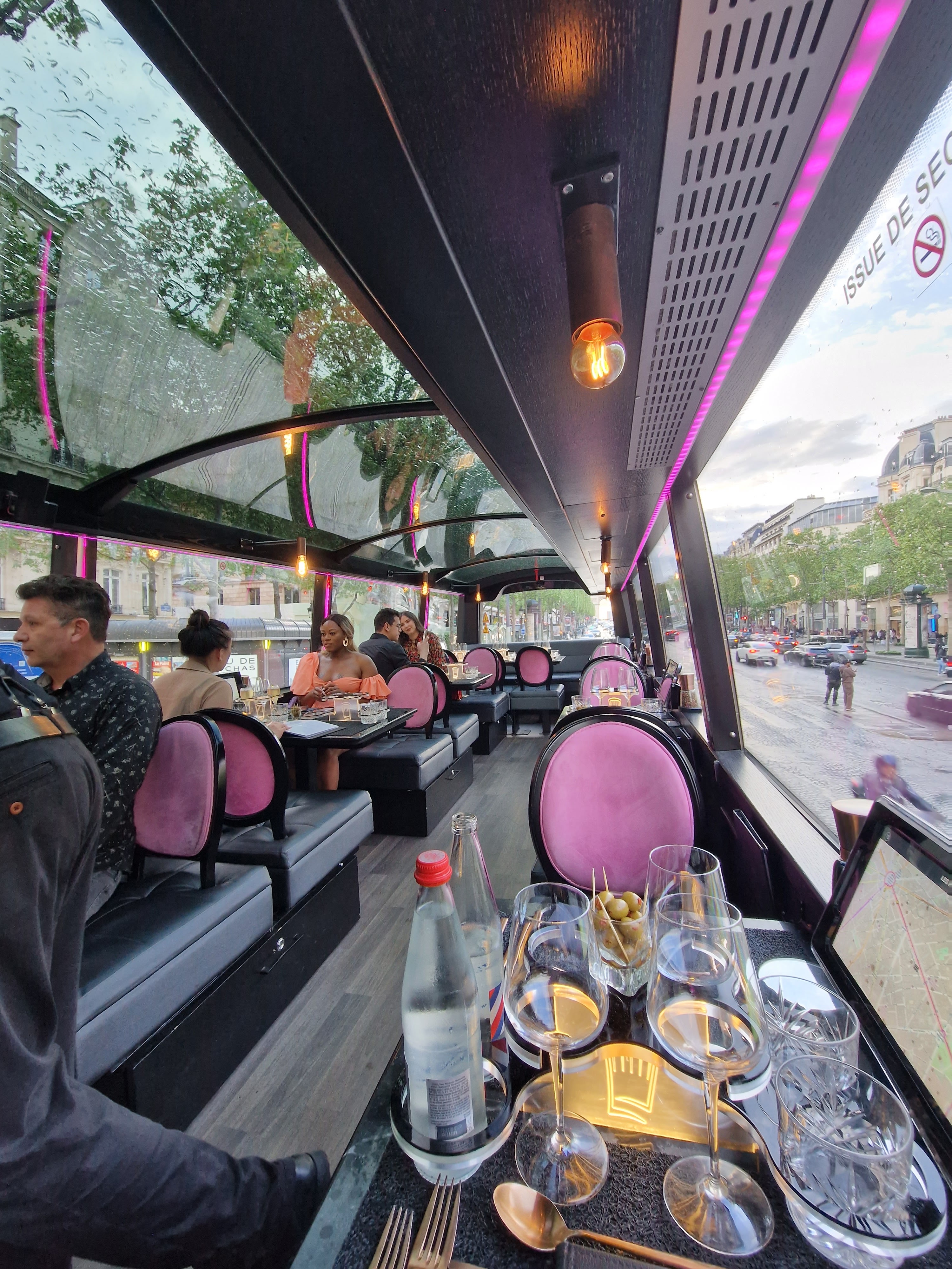 Expérience totalement insolite. Dîner dans un bus. Totalement adapté pour que rien ne bouge .. Un chauffeur de bus et ses serveurs très sympathique et accueillant. Repas avec lumière tamisé. Petite tablette avec écouteurs pour la visite de Paris et de ses monuments , l’écouteur se déclenche lorsque nous approchons du monument. Le repas gastro juste un régal. Une expérience culturelle, culinaire et insolite que nous recommandons