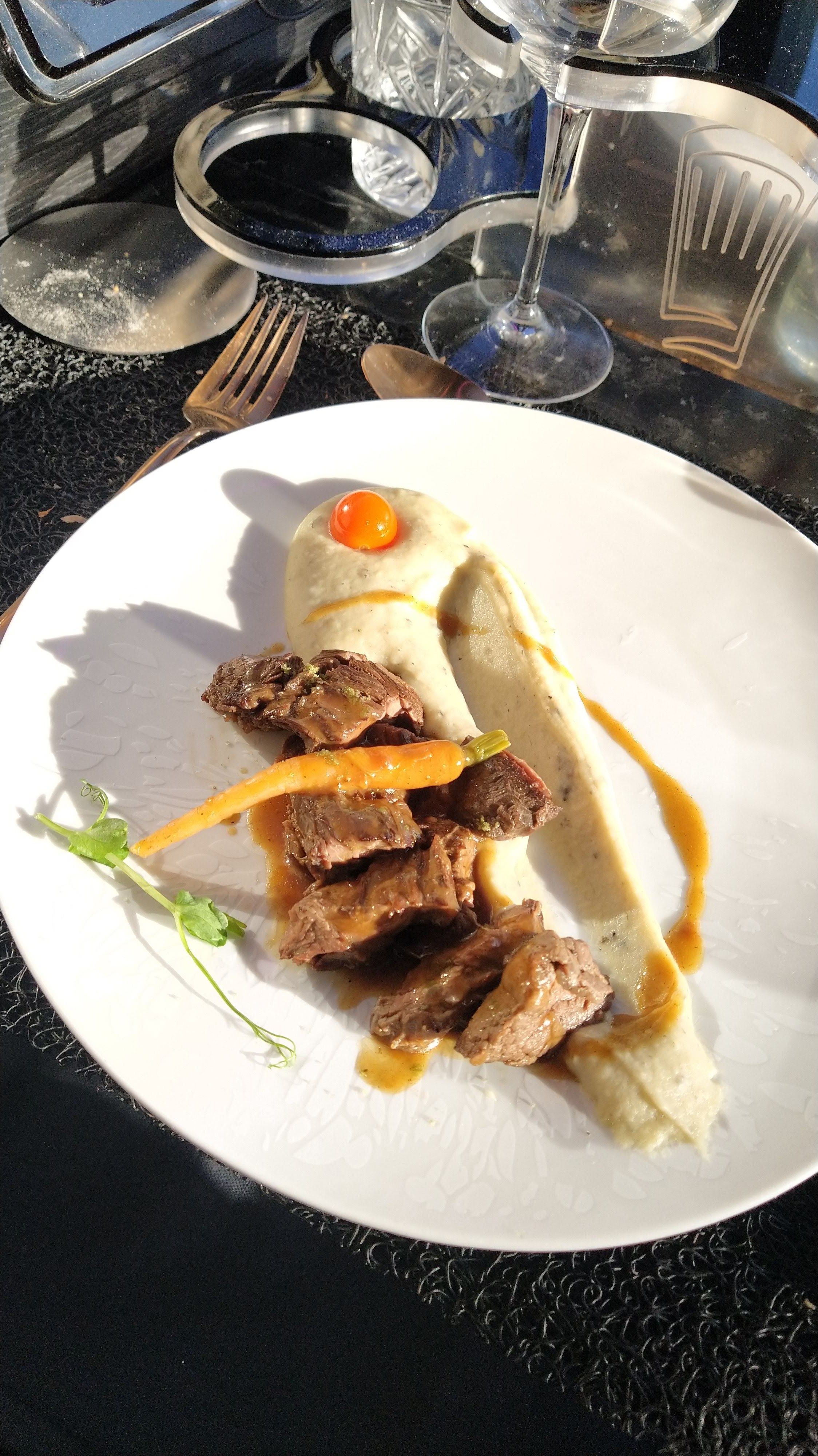 Dès l'accueil par le chauffeur, on sent que l'on va passer un bon moment, ensuite le cadre est unique, la déco est très belle et l'expérience unique en son genre. Je suis moi-même chef cuisinier gastronomique et le déjeuner était des plus délicieux, que ce soit les parfums, les saveurs et la quantité, il n'y a rien à redire. Le service était d'une rare gentillesse et attentionné. Quant au contexte, c'était géniale et la vue unique. Les personnes que vous croisez à travers les vitres sont tellement surpris qu'il y a beaucoup d'échanges de sourire et de saluts. Je recommande et allons y retourner avec les enfants.