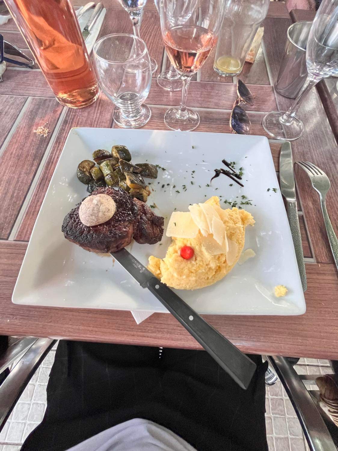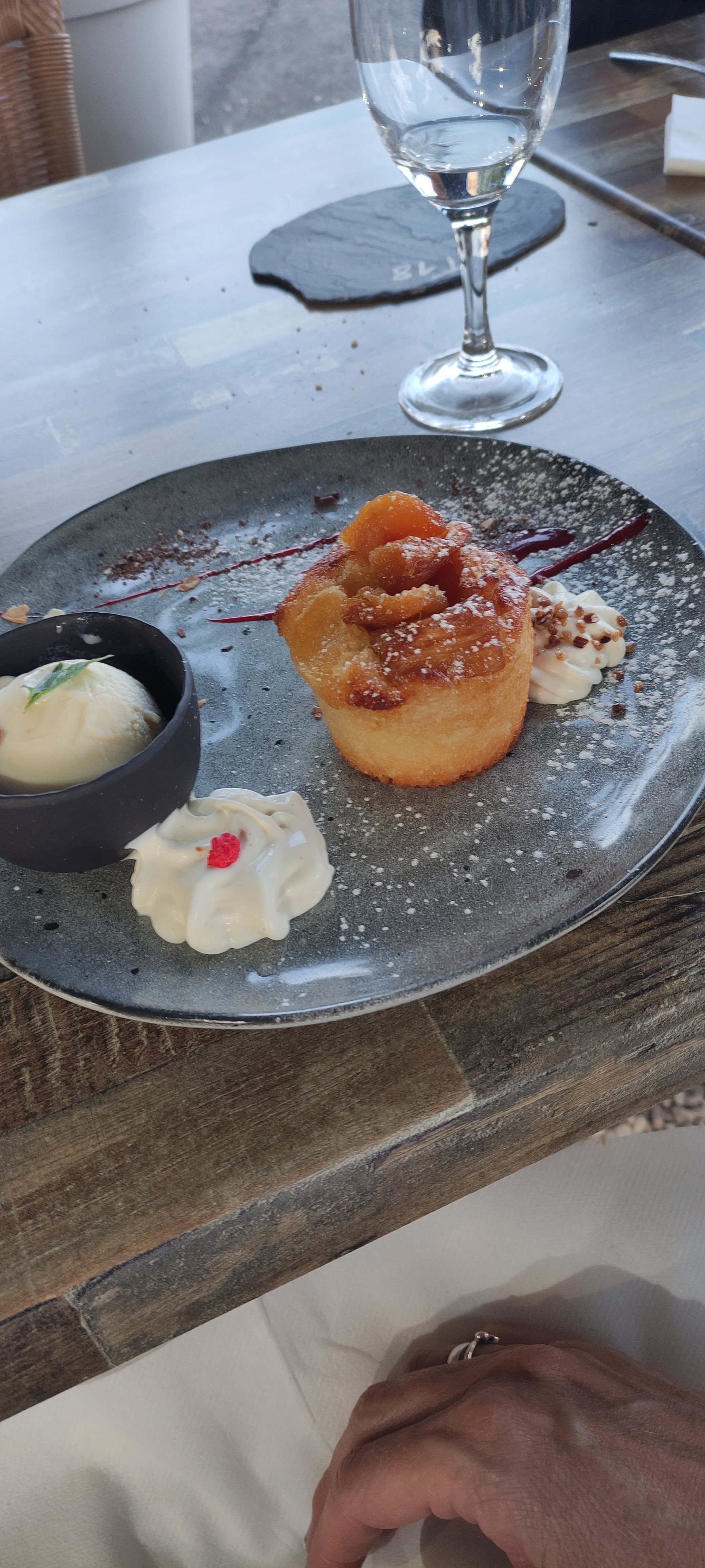 Un super moment passer à table. L'entrecôte énorme! cuites comme il fallait et un goût vraiment extra, de la vrais viandes de race. Servis avec une bonne portions de potatoes. Le dessert vraiment top, super léger et gourmand.
