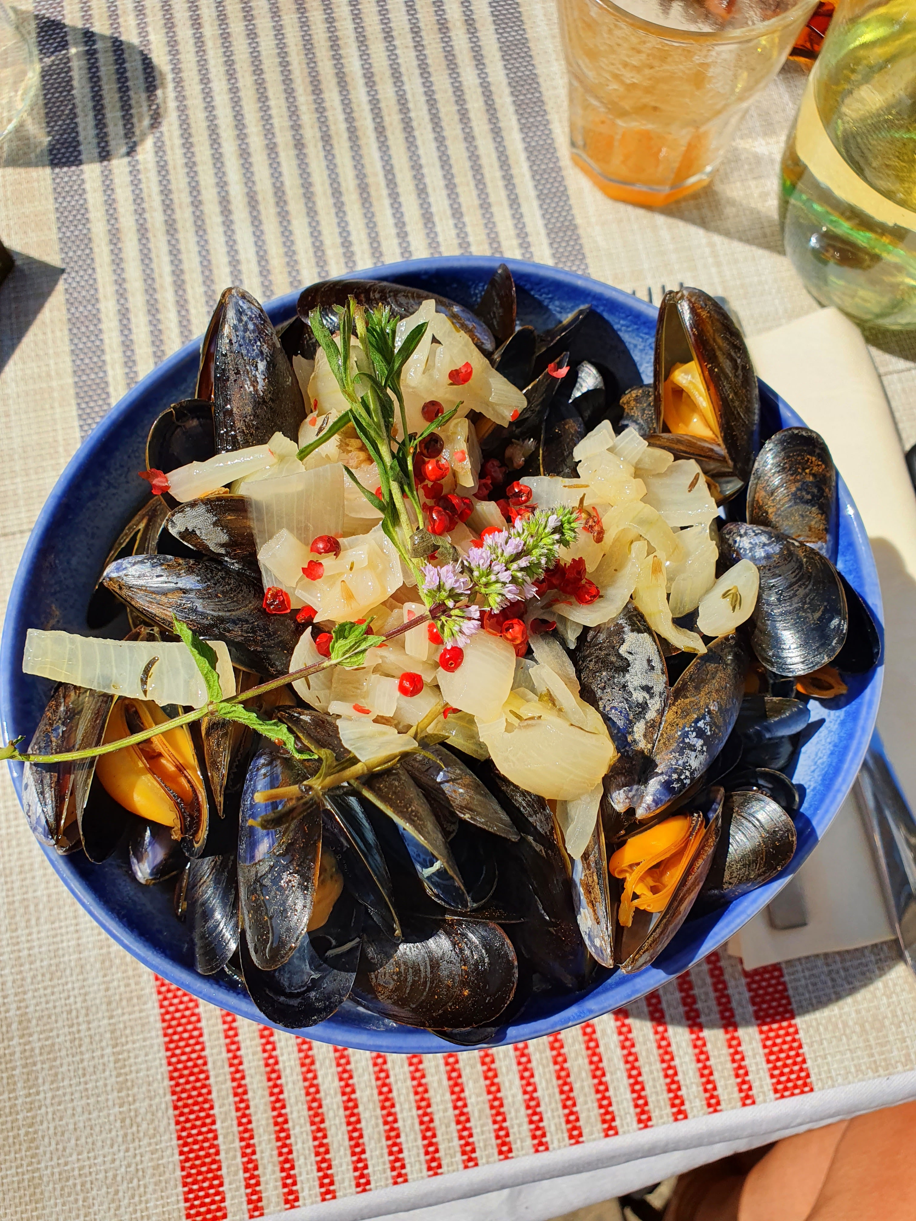 Tres Petites moules juste avec un peu de pain et 1 verre de blanc à 6,20€ ....! Conseillé mais prix pas affiché ! Total 18,20 €