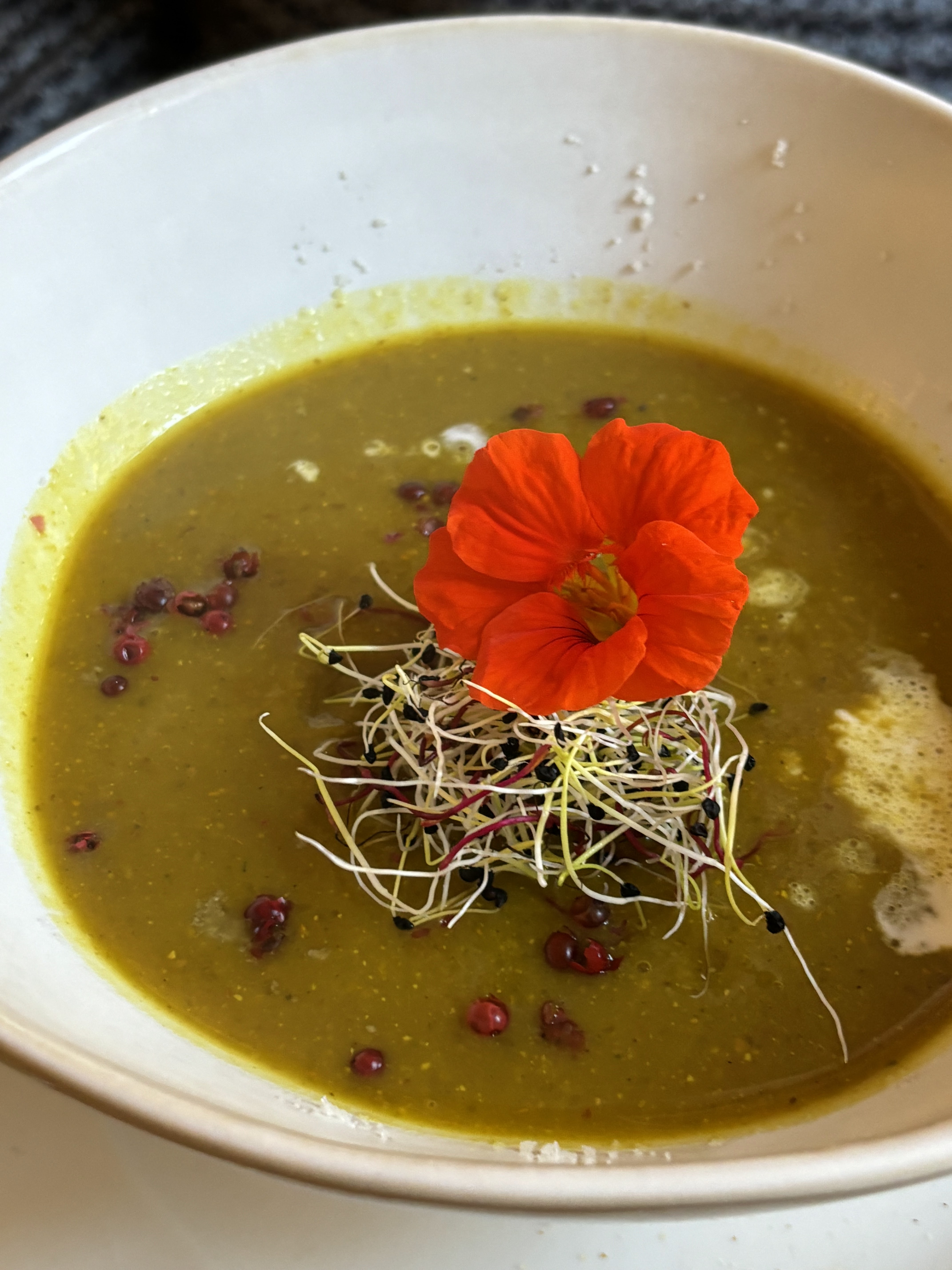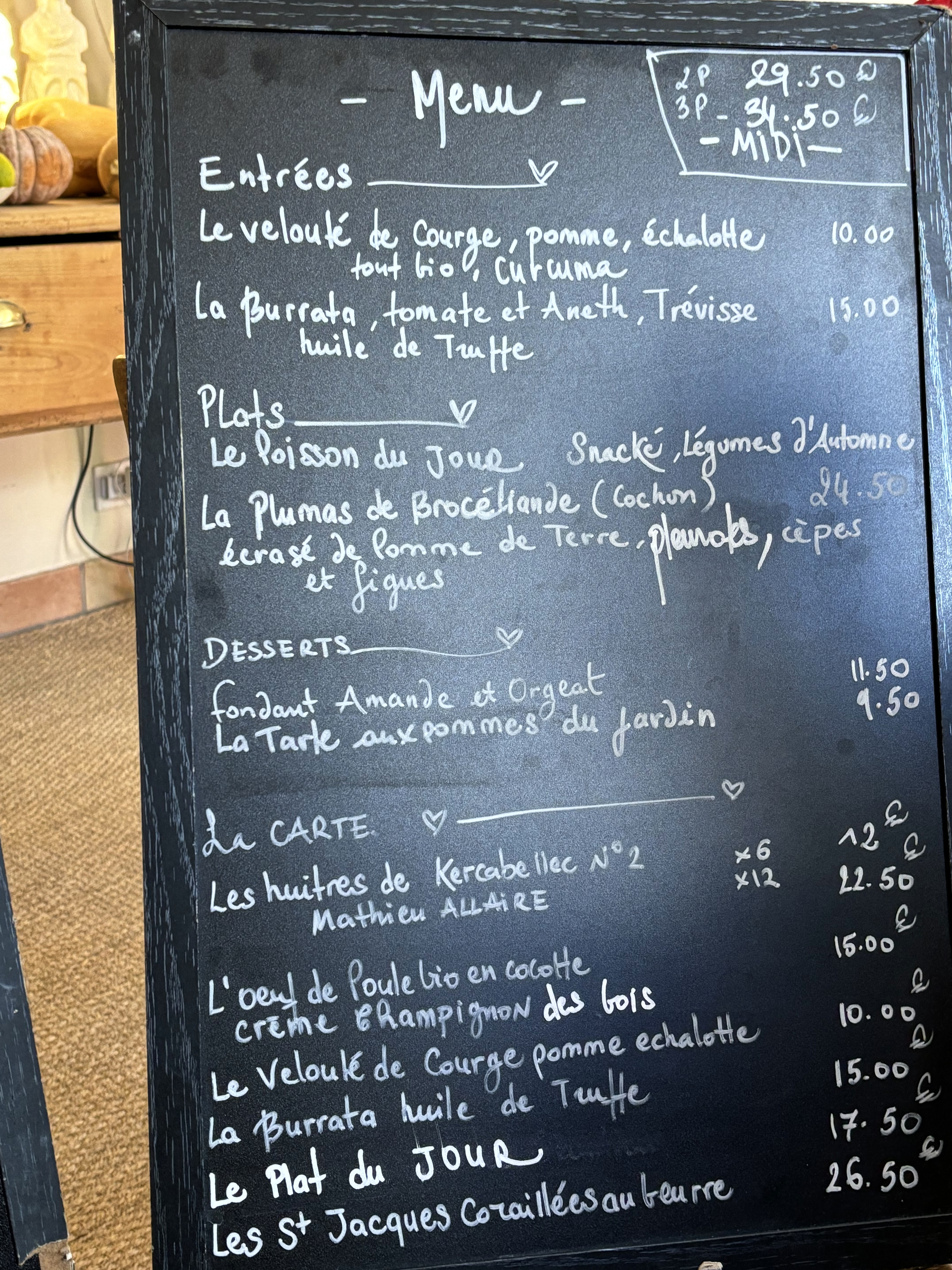 Un endroit tellement différent de ce que l’on trouve ailleurs en France. La propriétaire et son amie ont été très agréables dès l'instant où nous avons passé la tête pour y jeter un coup d'œil. Nous avons été attirés par l'arôme merveilleux provenant du restaurant. Wh avait le spécial (maquereau) et un délicieux plat de porc. Commencé d’abord par une volute de courge, pommes et échalote. (En gros, de la soupe à la courge mais elle était verte et délicieuse.). Tout était joliment présenté et absolument parfait.