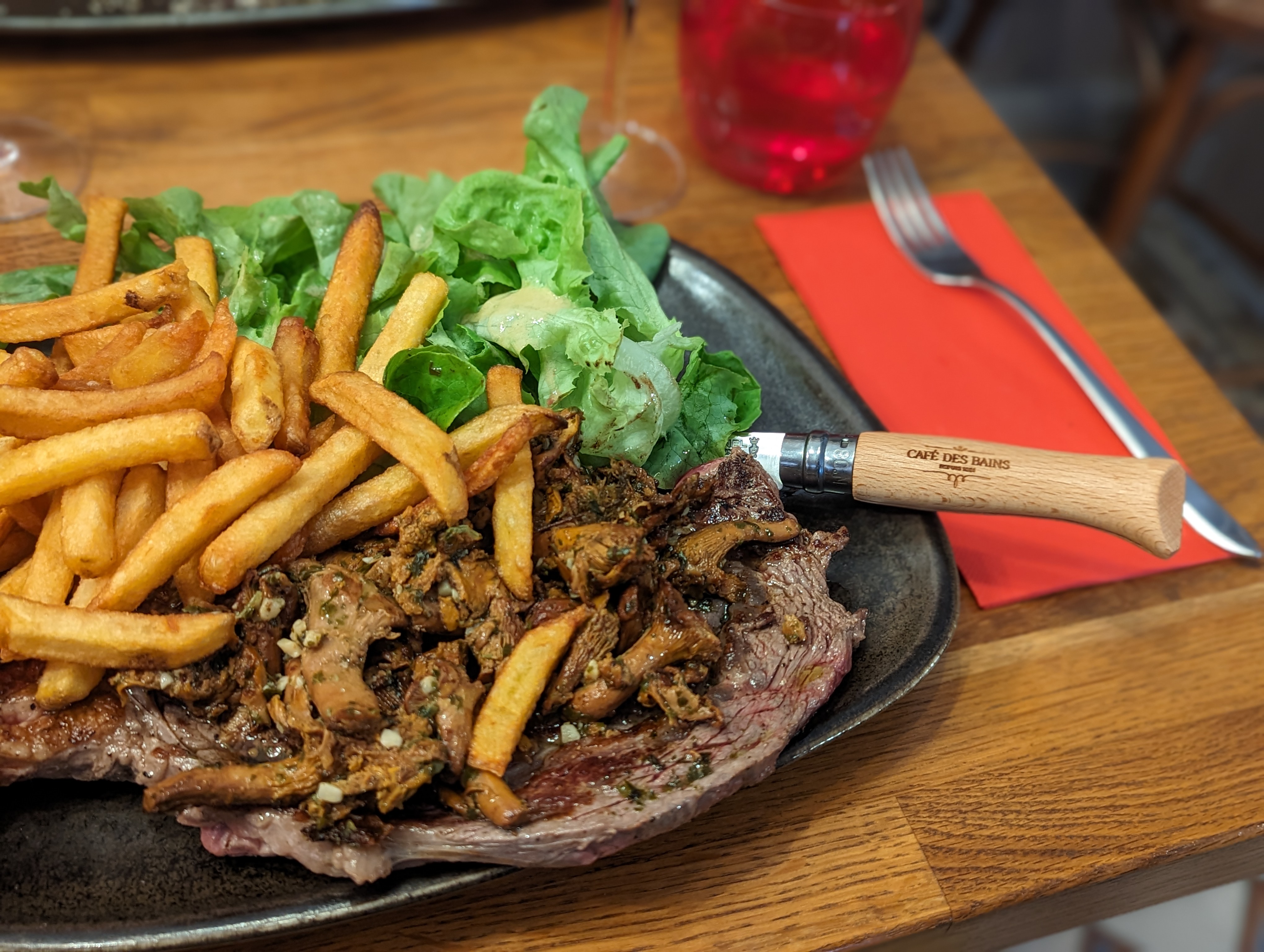 Trop contente de mon déjeuner, je n'avais pas le moral, j'ai choisi, une merveilleuse entrecôte avec des frites maison et des girolles persillées petite salade verte que du bonheur c'était une merveille la viande fondée dans la bouche. Petite tarte au citron meringuée un café un petit verre de rosé que du bonheur!!!