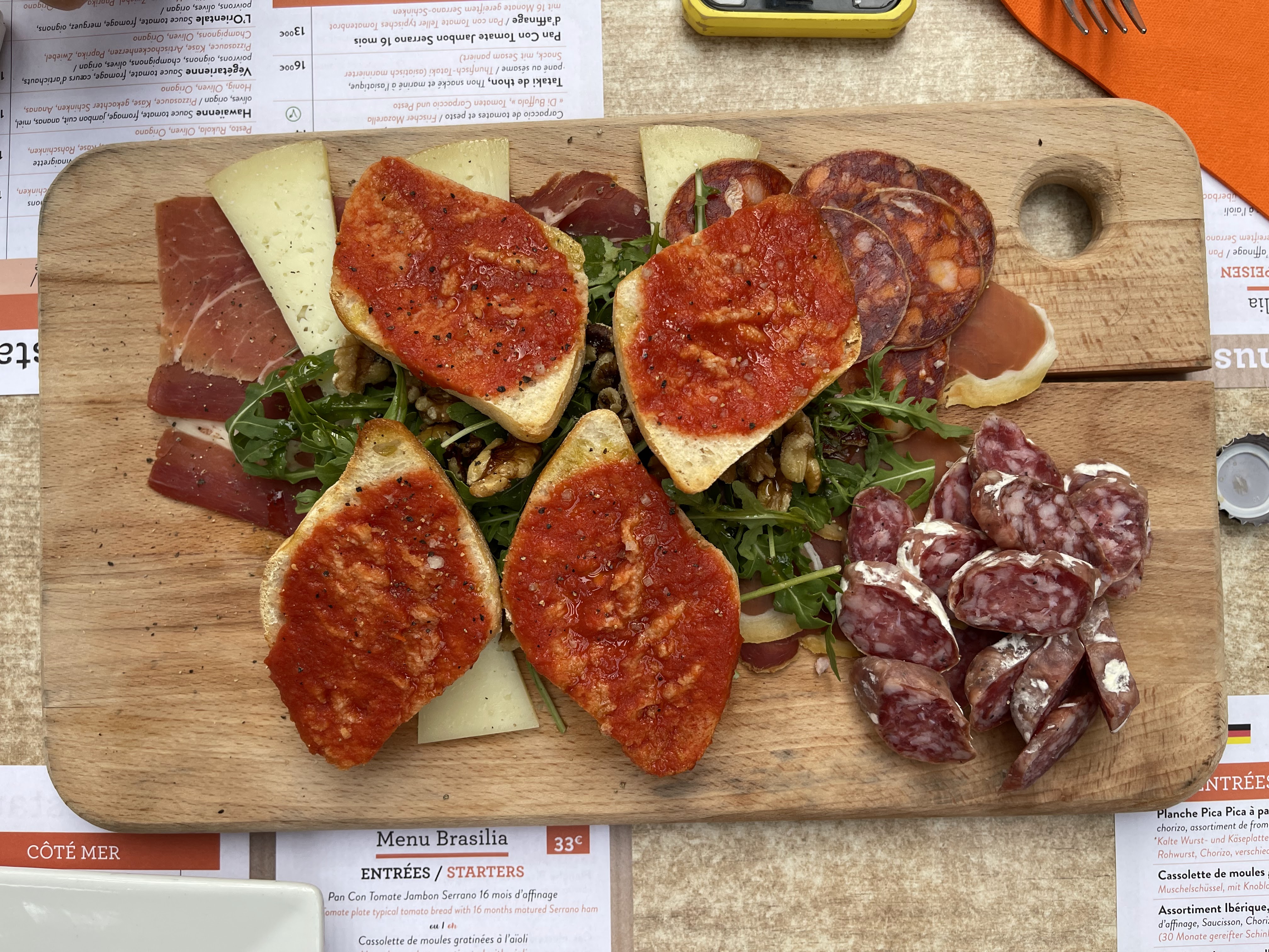 Nourriture très riche et variée. Des hamburgers, pizzas, pâtes, moules, poissons, etc... Tout cela est très riche. Très bonnes prestations, grande terrasse. Superbe carte de desserts. Fortement recommandé, Café Gourmand. Excellente attention.