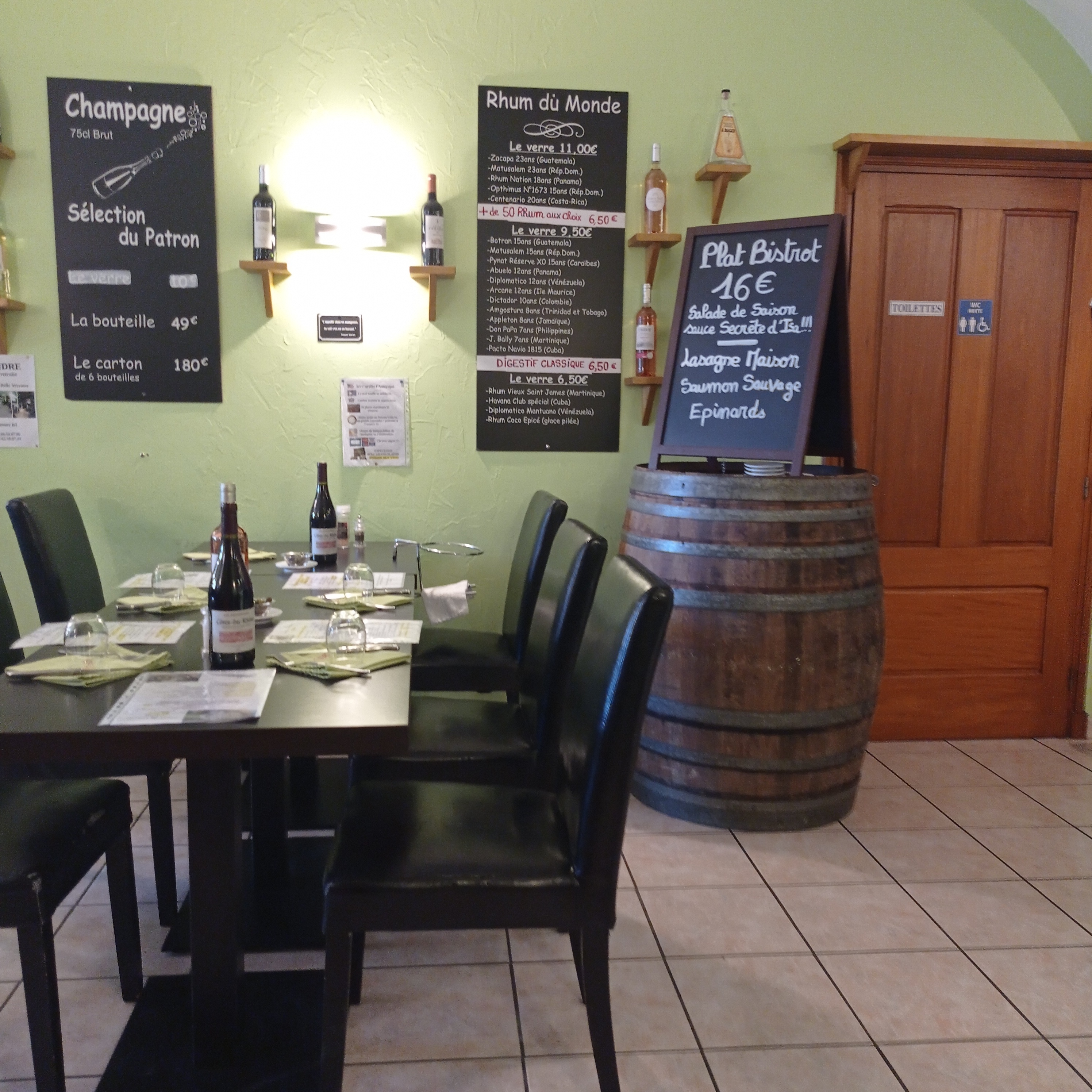 Quel plaisir d ' entrer dans ce lieu convivial.Un épicurien reconnaît au premier coup d ' œil qu ' il est à la bonne adresse.Les découverte du patron en matière de vins savent nous séduire. ISA aux fourneaux nous enchante par la délicatesse et les saveurs de ses mets. La tête de veau est une merveille pour les papilles.Hate d ' y retourner.