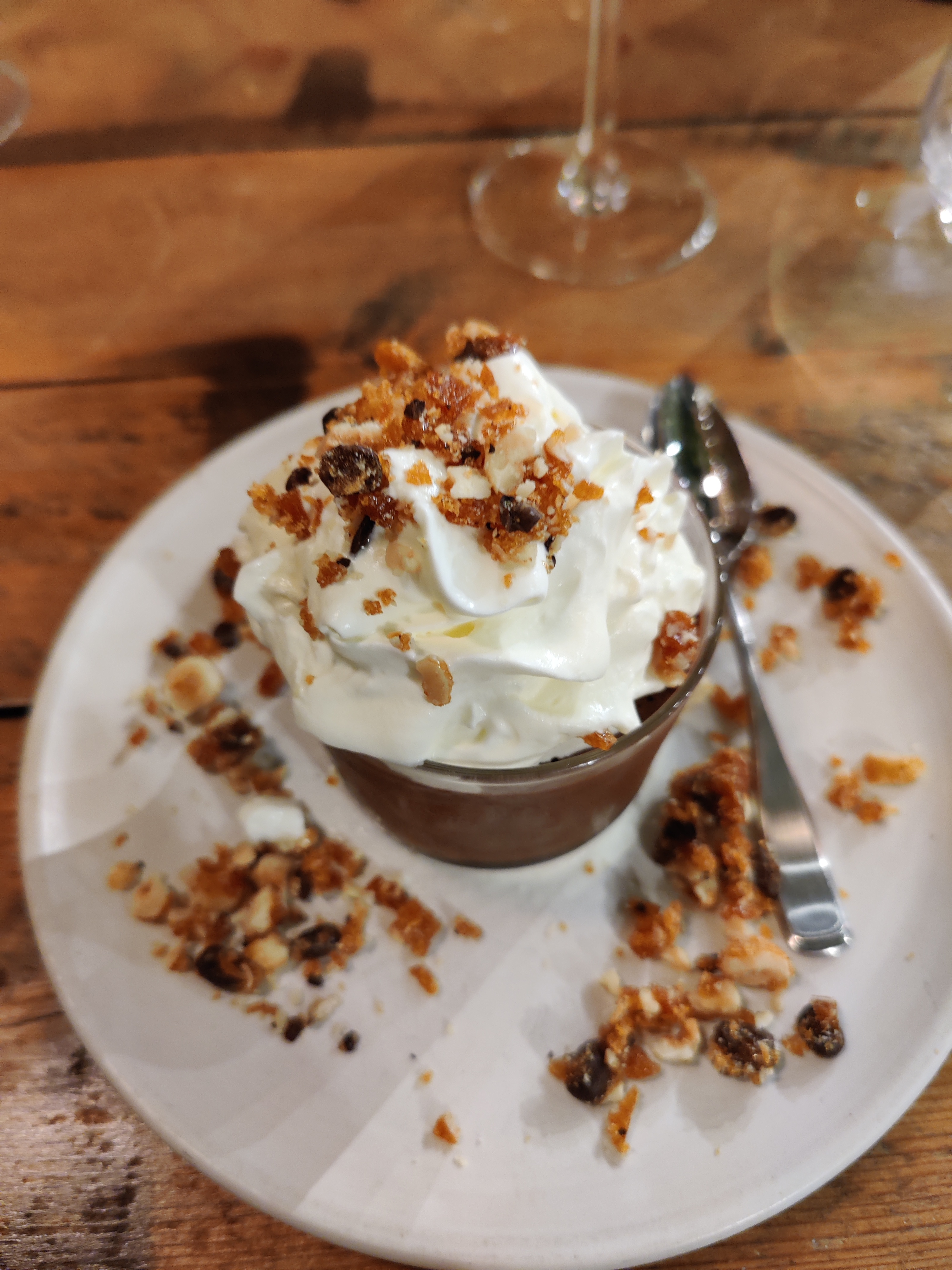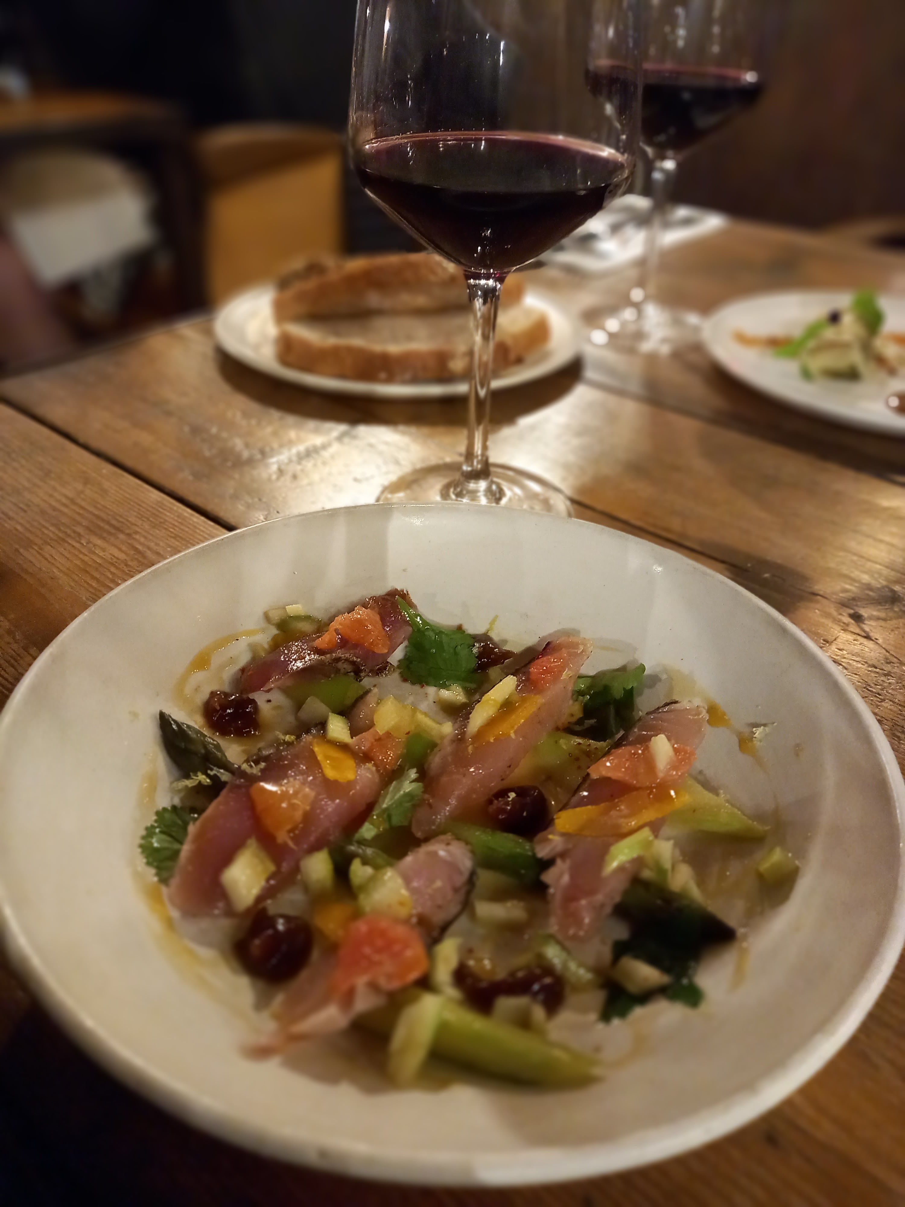 + plats salés délicieux et originaux + très bon rapport qualité prix + personnel très sympa - portions assez petites - le dessert à la fraise n’avait pas assez de goût (mais celui à l’orange si!!!) - pas assez de précisions sur les vins servis