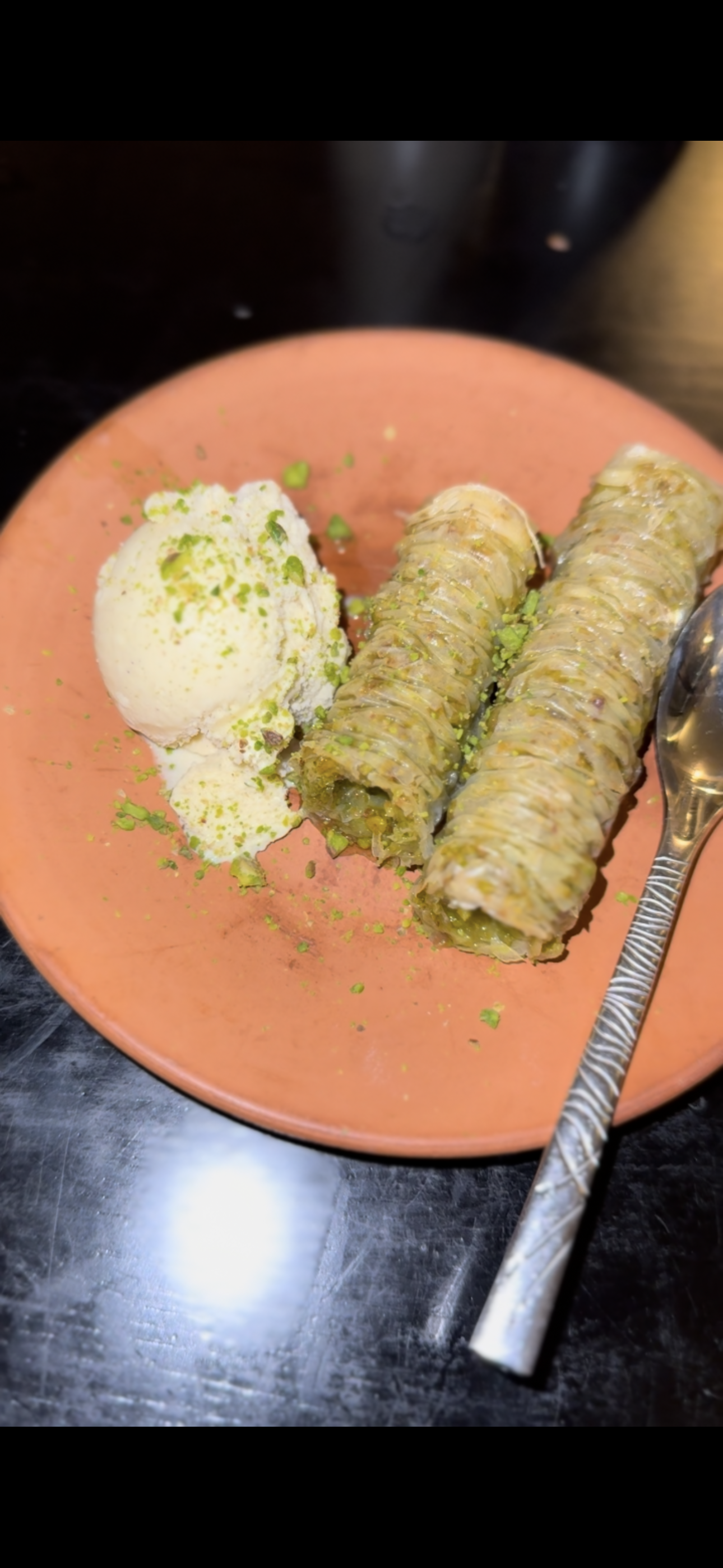 Un menu dégustation qui nous a fait voyager au pays des milles et une nuit. Une soirée ponctuée par un défilé de couleurs et de saveurs. Gros coup de coeur pour le dessert Baklava pistache qui avait un goût de reviens y. Quelle belle découverte !