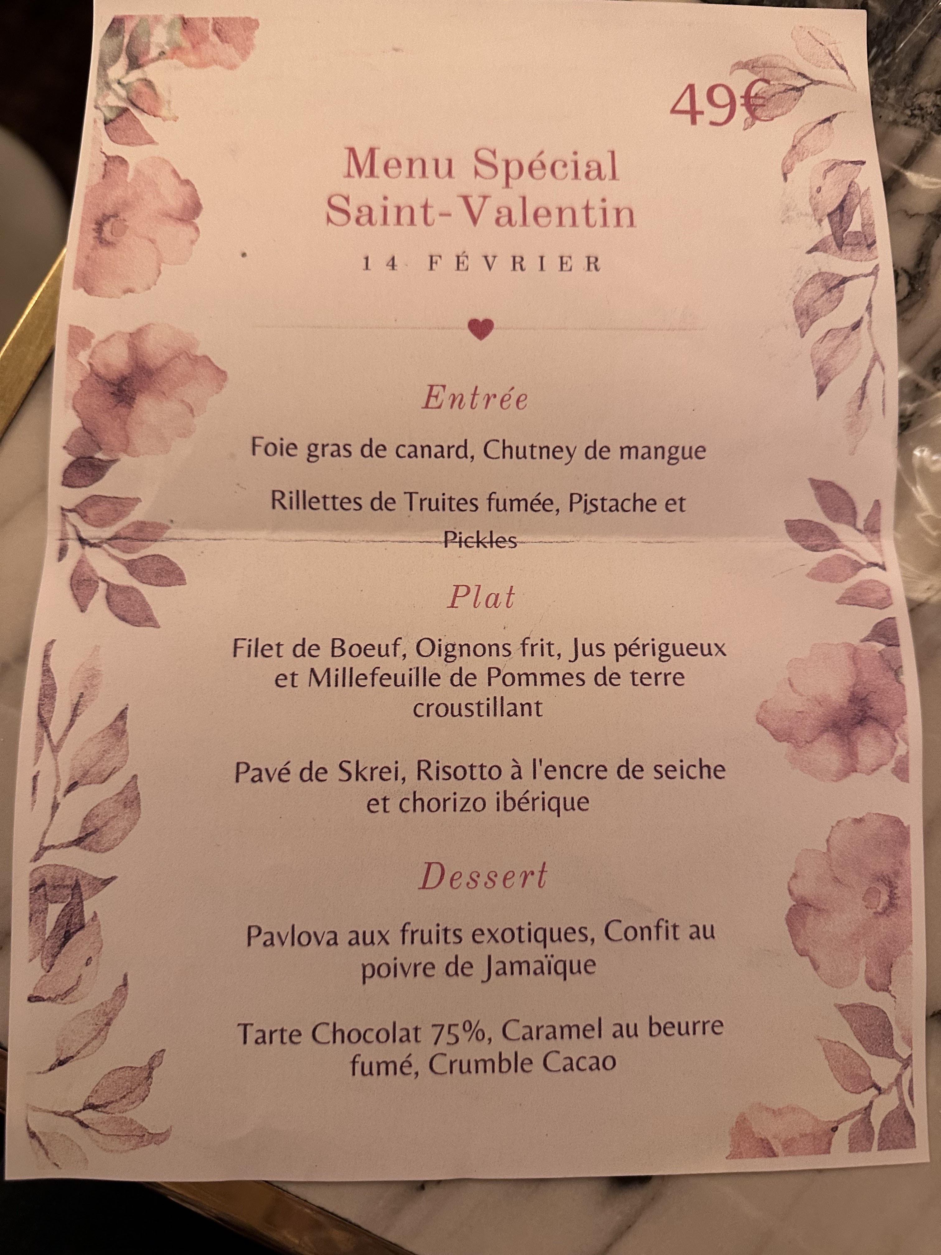 Nous sommes venus à deux pour la saint Valentin. Il y avait donc un menu spécial. Le tarif était de dix euros plus élevé que le menu le plus cher du restaurant en temps normal. Les plats étaient néanmoins plutôt bon et relativement bien servis. Le service était lui un peu moins bon, avec un empressement à retirer les assiettes et les verres un peu exagéré. Surtout qu’il était assez complexe d’obtenir du pain ! Bref une bonne soirée dans l’ensemble, je reviendrais goûter le menu “normal” une autre fois ! Le cadre lui est très réussi, avec une déco très sympathique et un bruit global contenu.