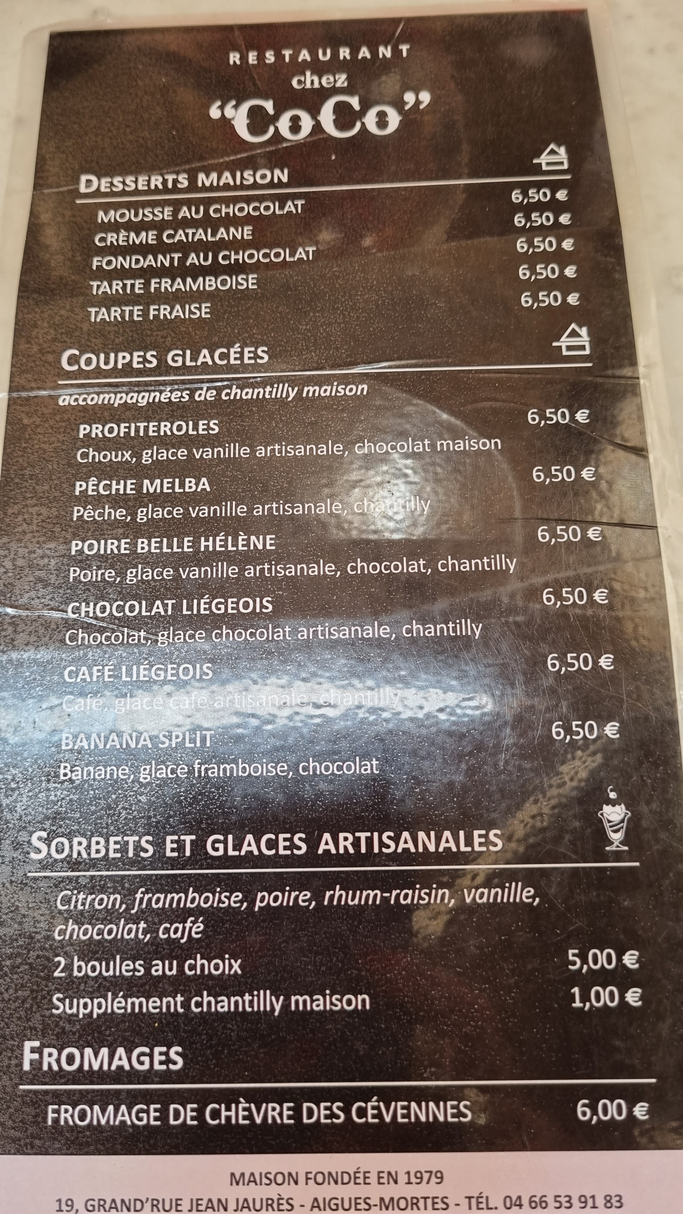 On voulait éviter un resto attrape-touriste en arrivant à aigues mortes. On regarde un peu les avis et on se dit qu'on va tenter chez coco. Plus de place en terrasse, on s'installe à l'intérieur. Au menu du jour à 17€ : brochette de taureau ou pavé de taureau ou entrecôte de taureau... Accompagné de frites maison et de salade. Une équipe de serveurs, jeune et dynamique s'occupe de nous. Très agréable et souriant. Nous nous sommes régalés avec le plat du jour, et nous avons opté pour un dessert maison : tarte aux fraises pour Mme et fondant au chocolat pour moi. Très bon également, ça change des fondants industriels. Au total, nous en avons eu pour 55€ pour 2 boissons + 2 plats du jour + 2 desserts. Ce n'est donc pas un resto attrape-touriste, la cuisine était bonne, le service rapide et un rapport qualité/prix correct pour un lieu aussi touristique. Nous reviendrons à notre prochaine visite !