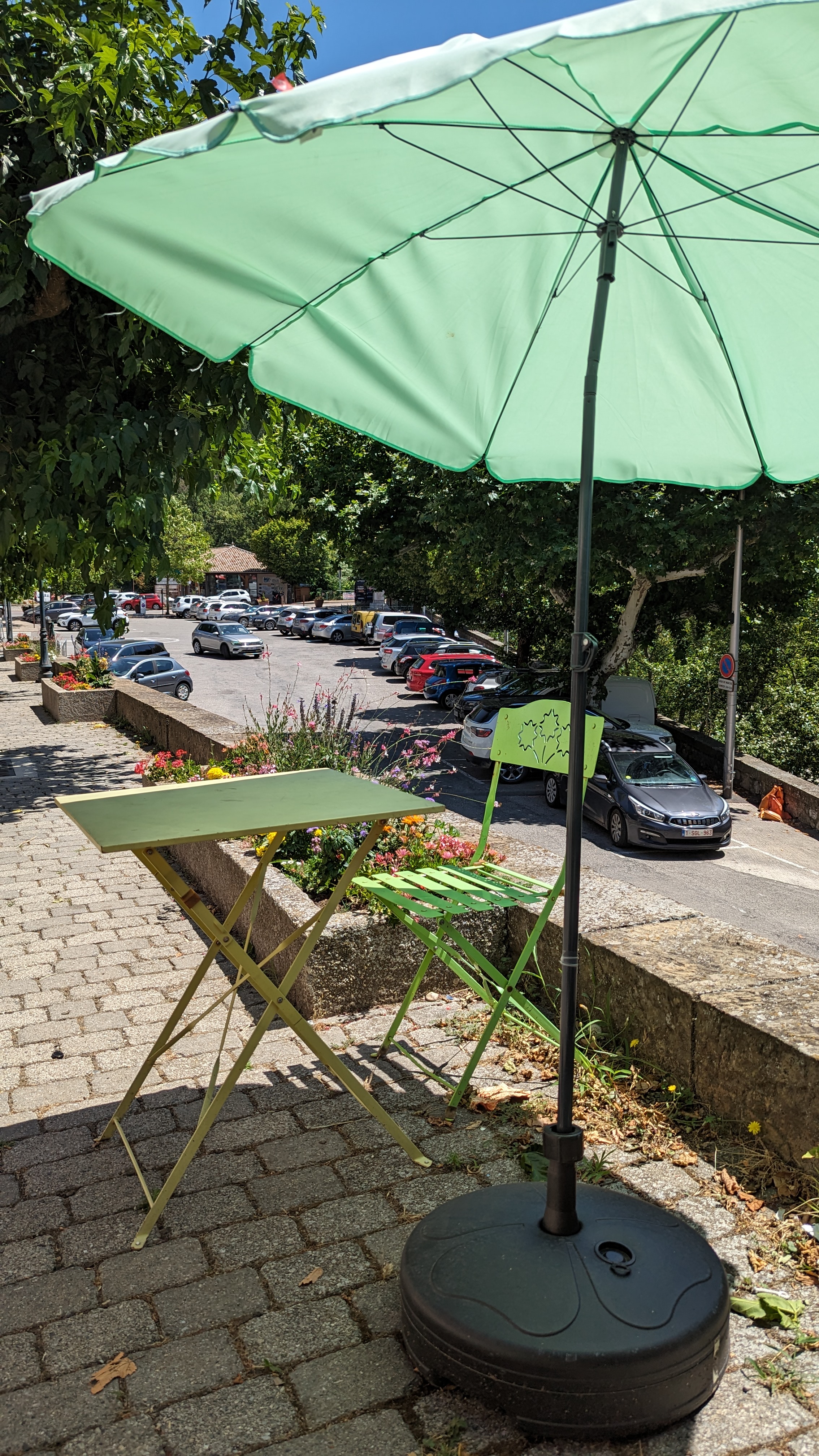 Gérant qui m’interpelle en vélo alors que je cherchait un endroit où faire une pause, c’était une bonne idée j’avais besoin d’une bonne bière bien fraîche car la chaleur était caniculaire. Ambiance de village très appréciée !