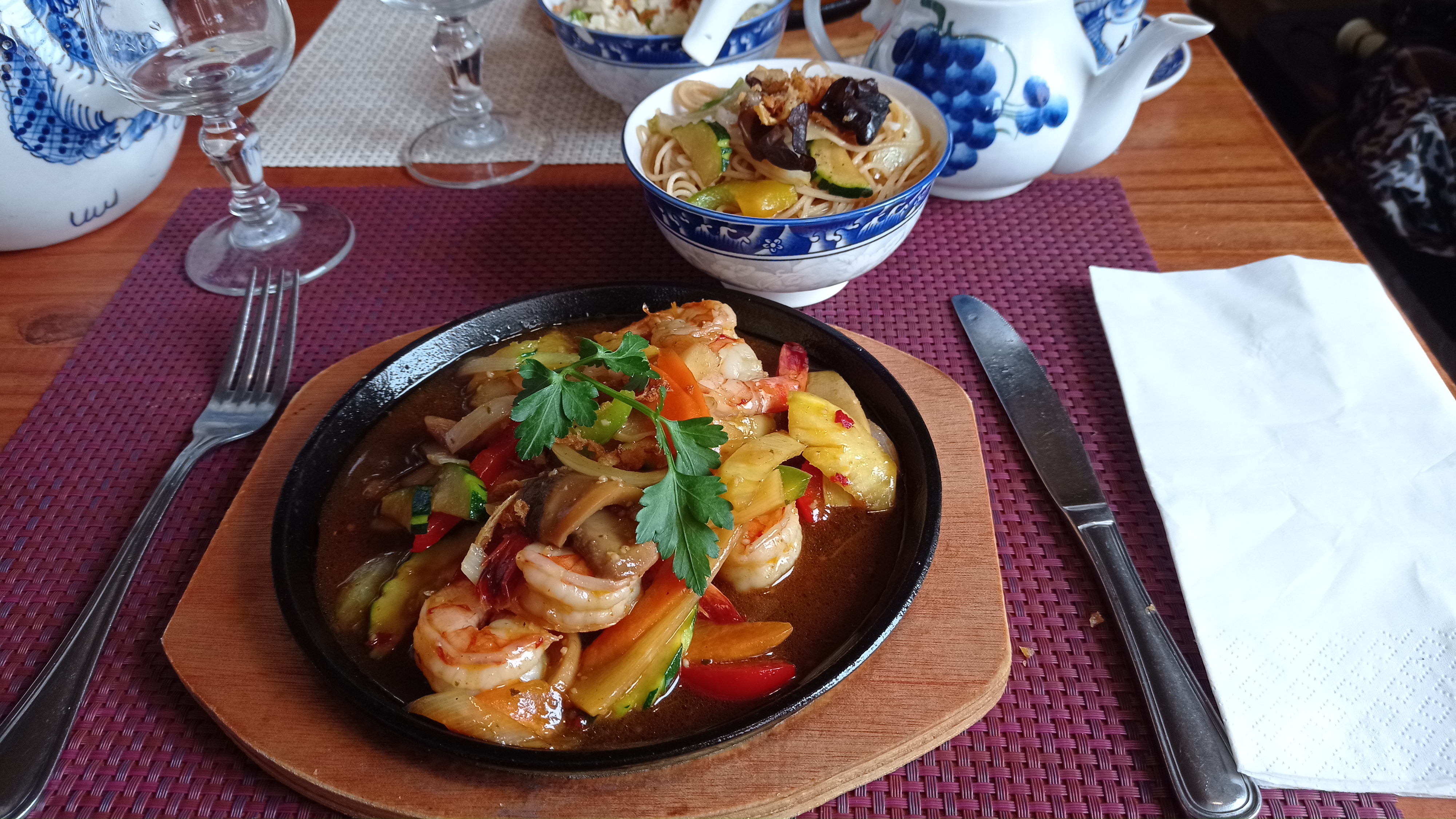 Pas de beignets de crevettes avec apéro plus de crevettes plus de pommes et une seule soupe 25cl de rose plus de rose la théière avec des taches à l extérieur dommage car les plats étaient bons