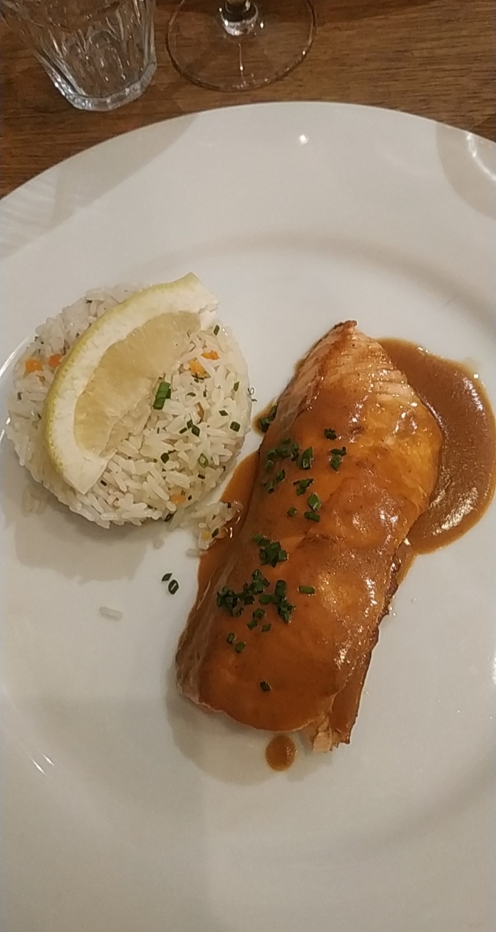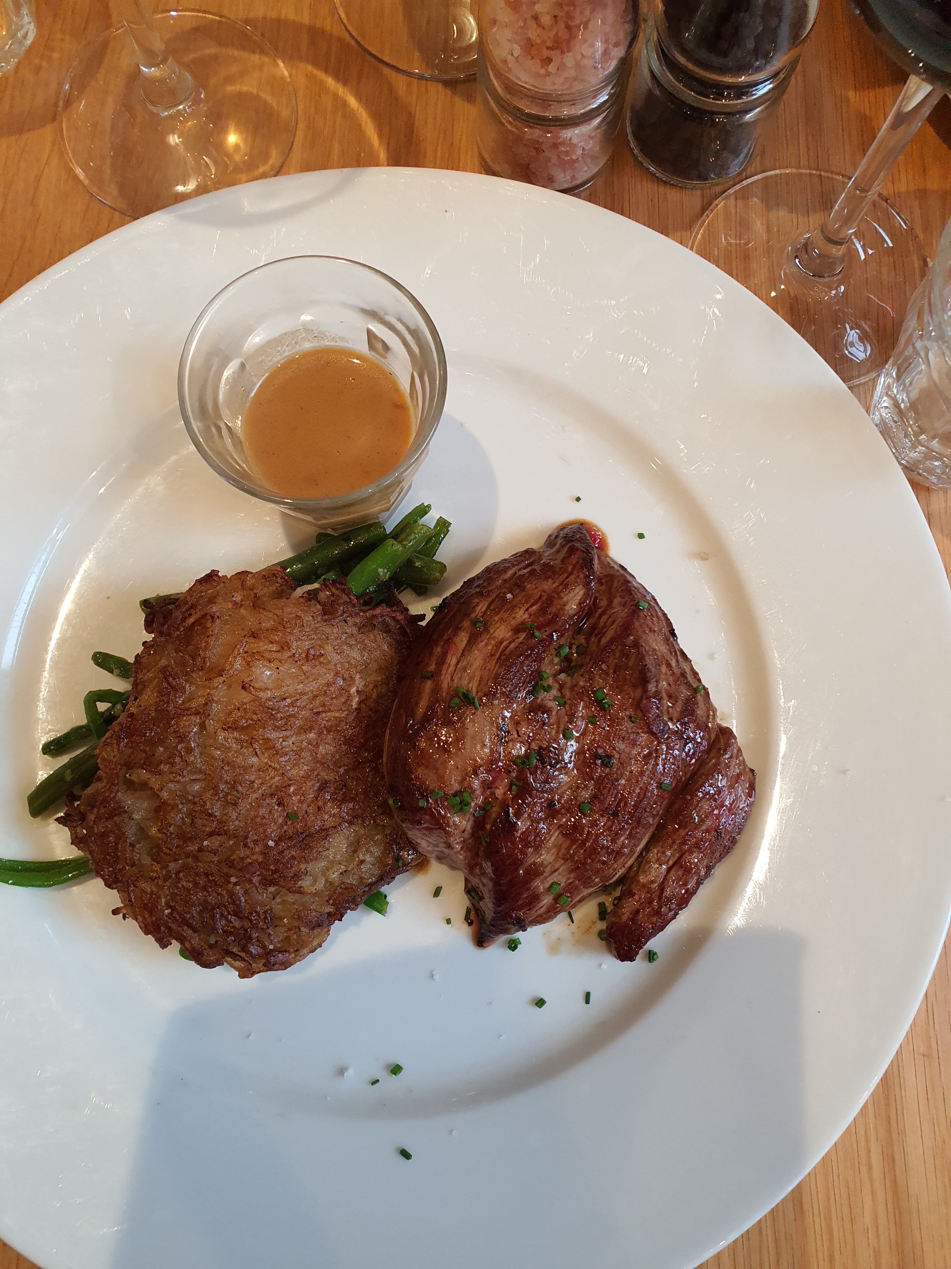 Vraiment déçu. Pour 23€, je m'attendais à mieux. L'entrecôte comportait beaucoup de gras et quant à la cuisson, cela avait des airs de semelle. Je suis peut-être mal tombé! Mais pour les frites, là pas d'excuse : déjà que la quantité était limite (petit panier), au lieu de frites dorées et légèrement croustillantes, certaines tiraient sur le gris et toutes étaient mollassonnes. Ah! J'oubliais les quelques feuilles de salades en accompagnement : zéro assaisonnement! Très déçu donc. Ma femme, par contre, était contente de son saumon. C'est un fait que son assiette avait l'air plus appétissante que la mienne. Mais je lui laisse le soin de faire un message elle-même. Cordialement.