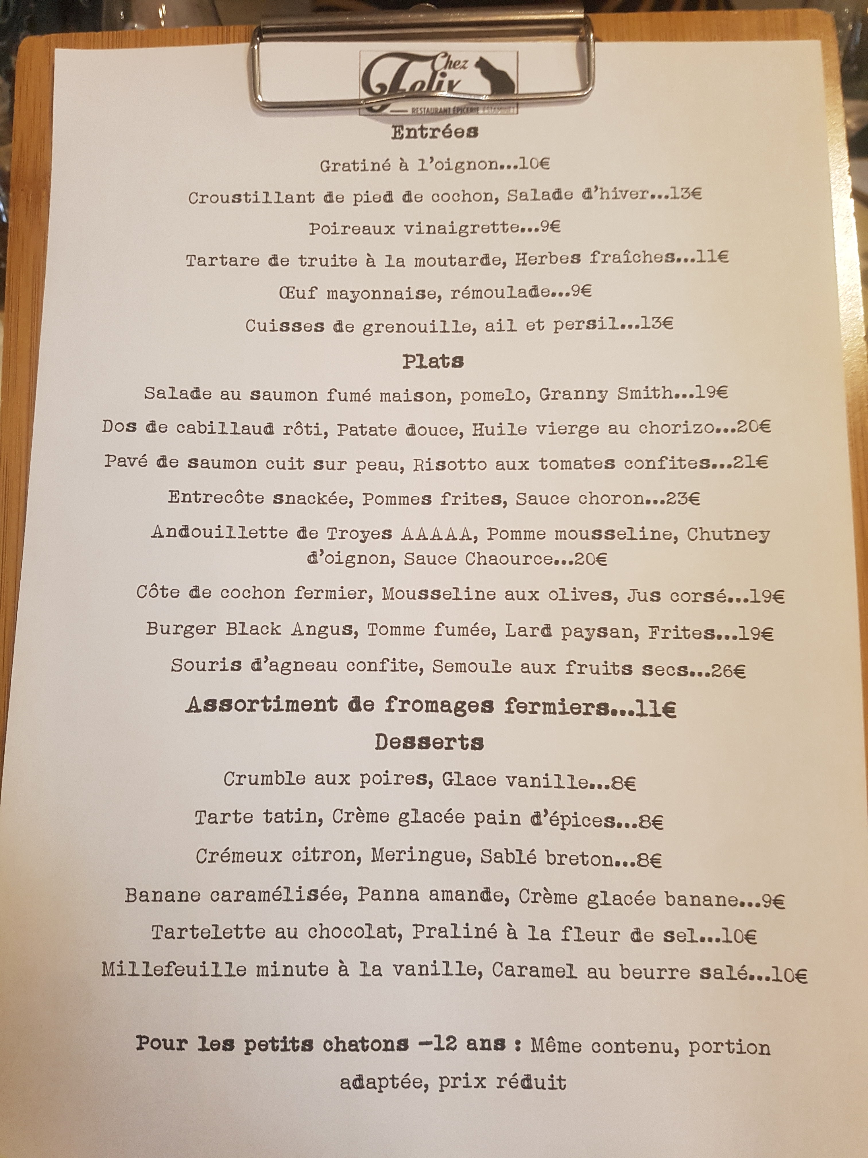 On a voulu tester ce resto situé dans la belle ruelle des chats, résultat satisfaisant Entrée (terrine maison) correcte Plats (bœuf et Souris d’agneau) bons, les frites ont le goût des frites maisons ! Le dessert du jour (mi cuit chocolat caramel) était également très bon. Néanmoins la carte reste très limitée contrairement aux photos qu’on peut voir dans la catégorie menus ci dessus. Et certains prix me paraissent excessifs (9€ le Monaco 50) par exemple, tout comme la plupart des champagnes (ça reste du local et pas des grands noms comme du Drappier, Moet, Ruinart ou Veuve Cliquot) La déco est atypique, mais la serveuse agréable. L’équipe est très jeune (cuisine, bar, service), c’est plutôt bien de faire travailler les jeunes.