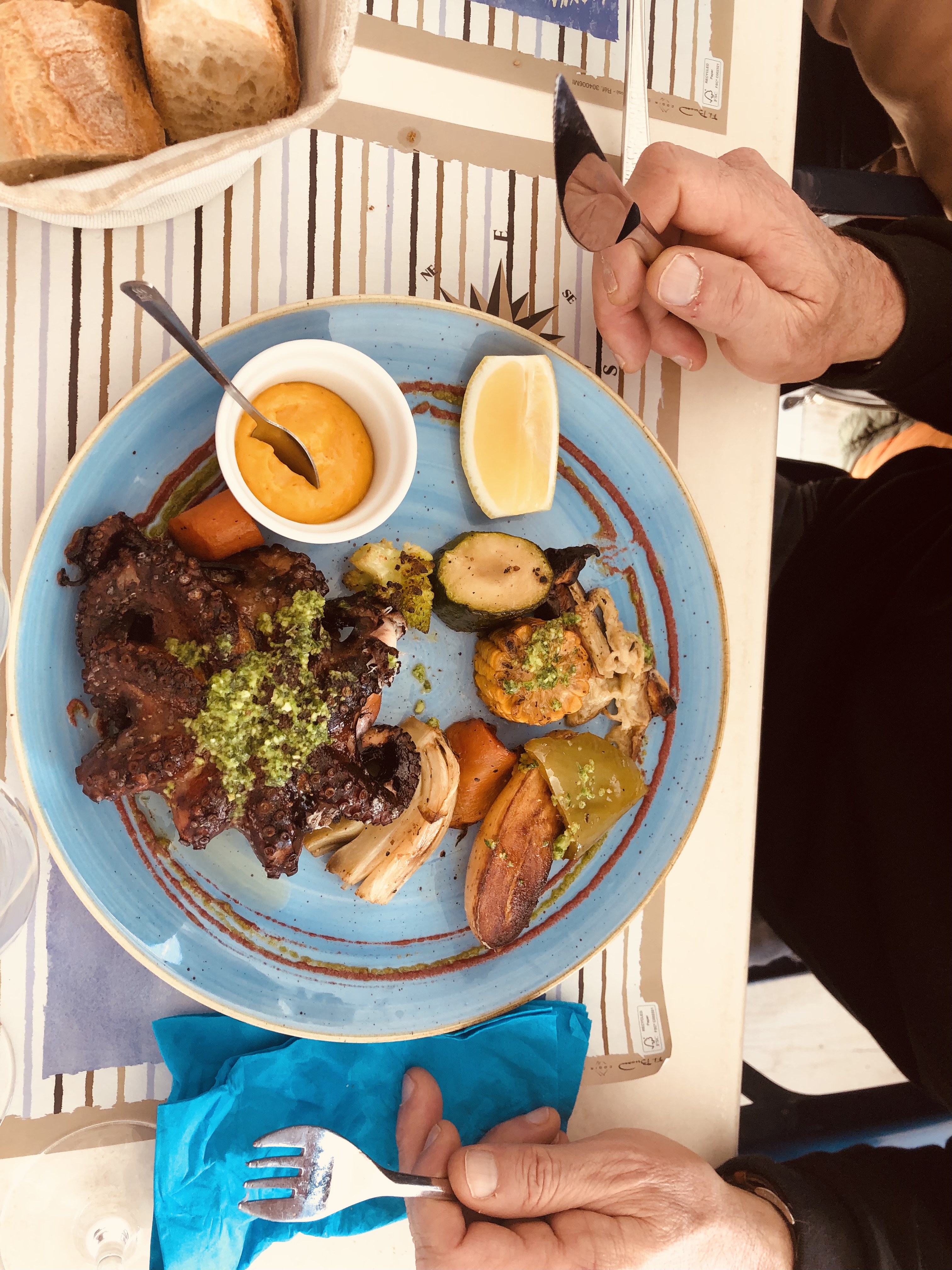 Nous y sommes arrivées par hasard pour déjeuner vers 13h, la semaine dernière. Un accueil souriant et chaleureux, et une place avec vue sur mer. Nous nous sommes régalés de la spécialité, le poulpe entier grillé et de filets de loup. Les produits frais développent toutes leurs saveurs après les cuissons maîtrisées. L'accompagnement de petits légumes était original et succulent. Les plats copieux n'ont pas laissé de place à un dessert qui pourtant nous avait fait de l'oeil . A souligner une très belle ambiance, échanges faciles, un service très agréable. Nous y reviendrons avec envie de découvrir d'autres réalisations. Merci à vous et à votre équipe.