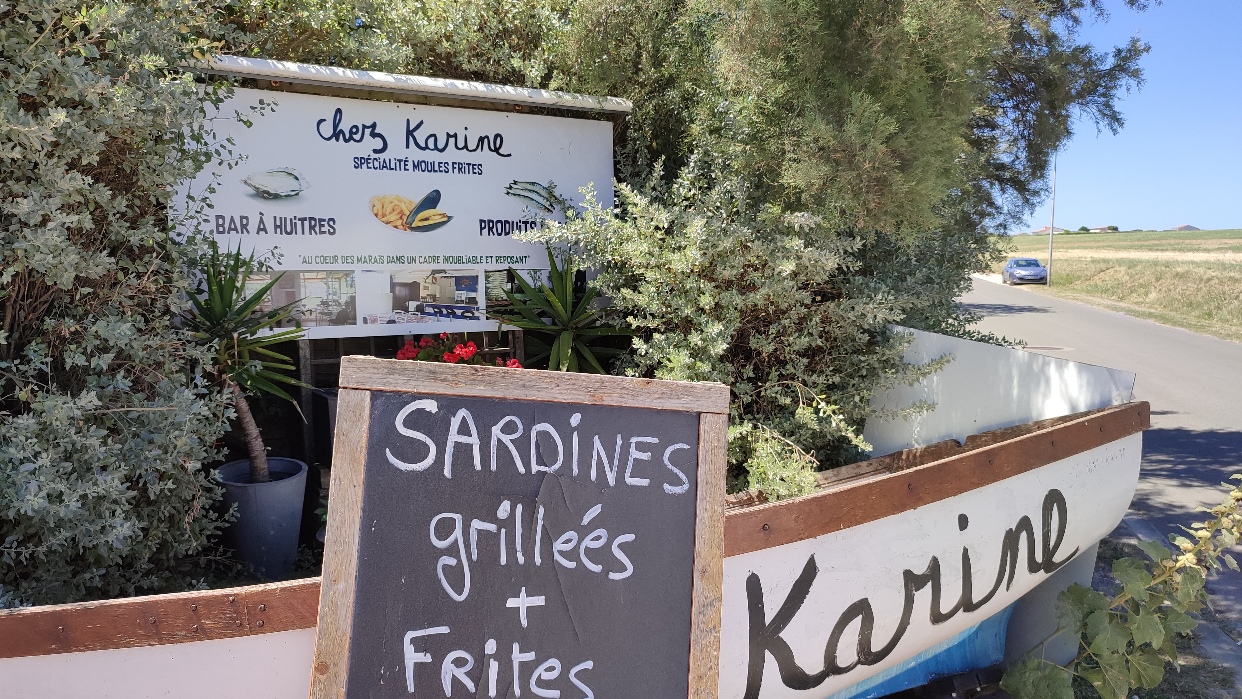 Une excellente pause déjeuner chez Karine 😊👍 Des sardines grillées, des frites, un verre vin blanc et un café pour 15€... Et, avec ça, le sourire et le sens de l'accueil de Karine et sa serveuse👌 sans oublier la terrasse arborée sur les marais. Je recommande 🙂💫