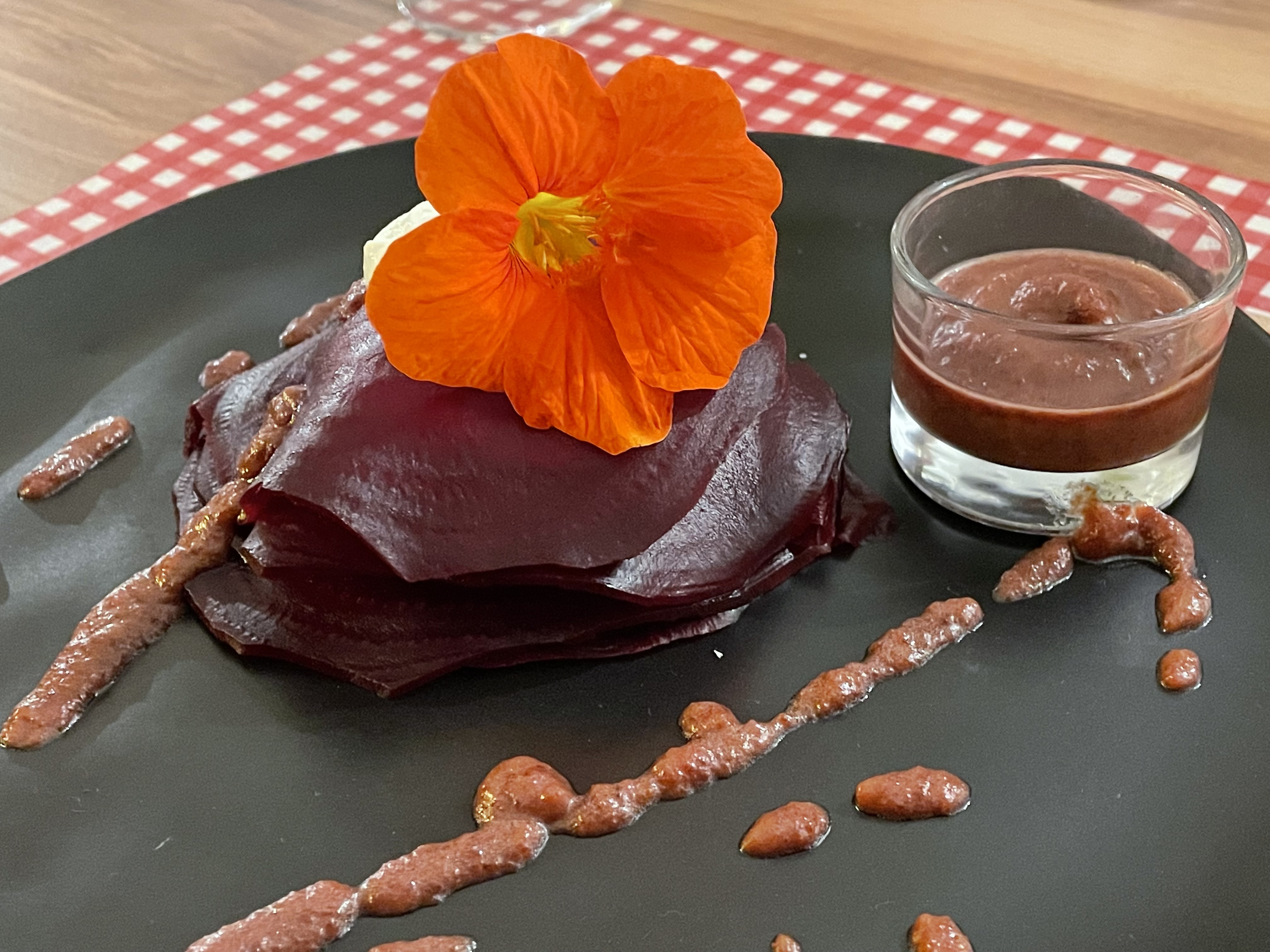 Excellent !!! Panna cotta de betteraves légèrement parfumée au gingembre accompagnée d'une boule de sorbet à la betterave. Très bon et très original ! Filet mignon super tendre avec sa sauce miel gingembre... Et le dessert...Ah le dessert, j'en salive encore...une tarte chocolat blanc saupoudrée de cacao, un vrai délice !!!