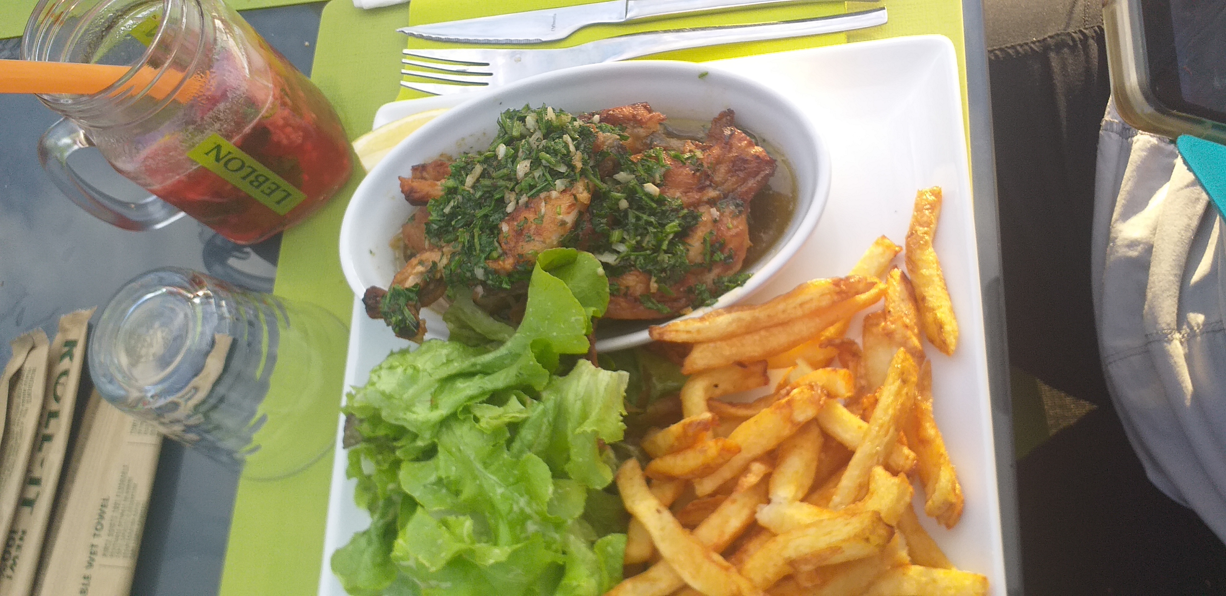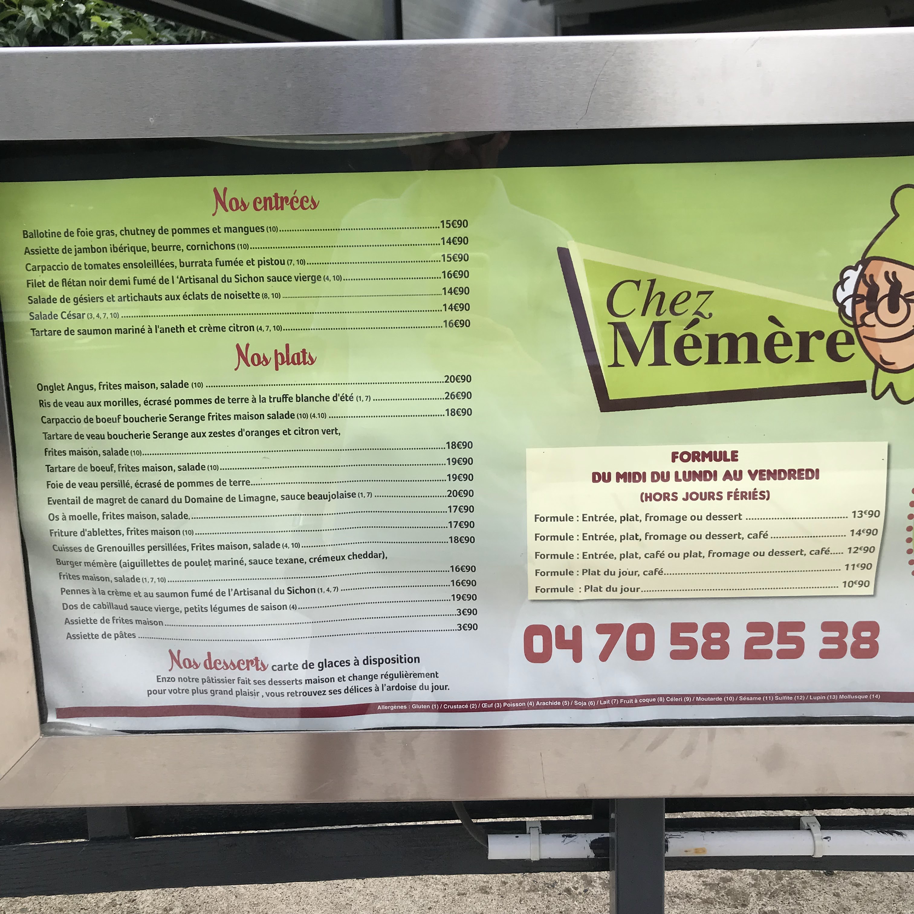 De passage à Vichy sur l’aire de camping car situé à proximité, et en baladant le long de l’Allier nous avons fait une halte chez Mémère. Nous sommes arrivés en première partie de service, nous avons été servis très rapidement et de belle manière. Nous étions avec un enfant de 2 ans, on nous a proposé instantanément un siège ou un coussin. Nous avons mangé une salade saumon bien fraîche et copieuse, et des cuisses de grenouilles que j’ai trouvé particulièrement bien assaisonnées. Pour moi ce jour là c’était un sans faute.