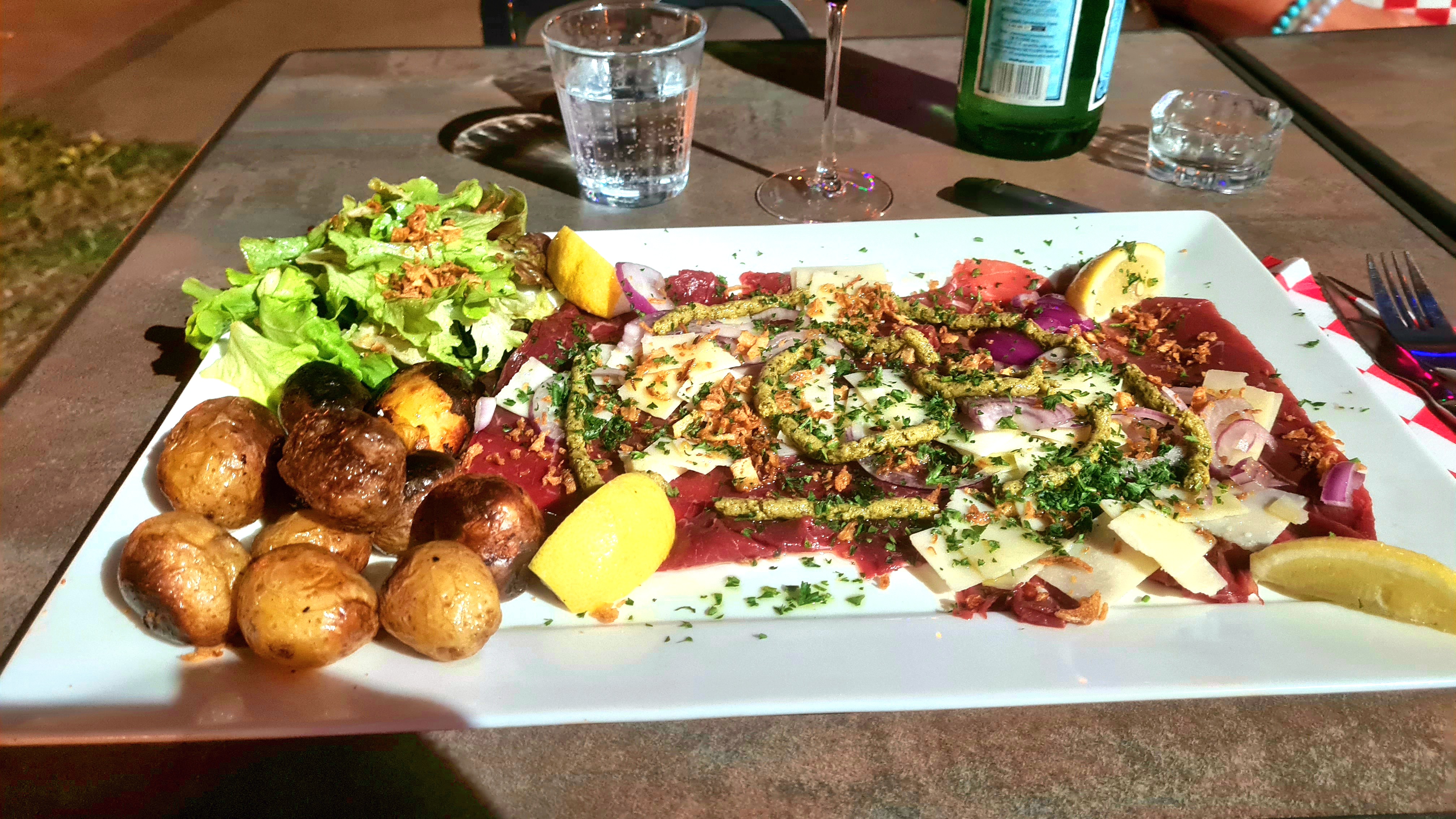 Très belle découverte Personnel accueillant avec de l' humour Cadre magnifique À notre grande surprise on a pu déjeuner dehors 😊 Carpaccio très copieux et très bien présenté