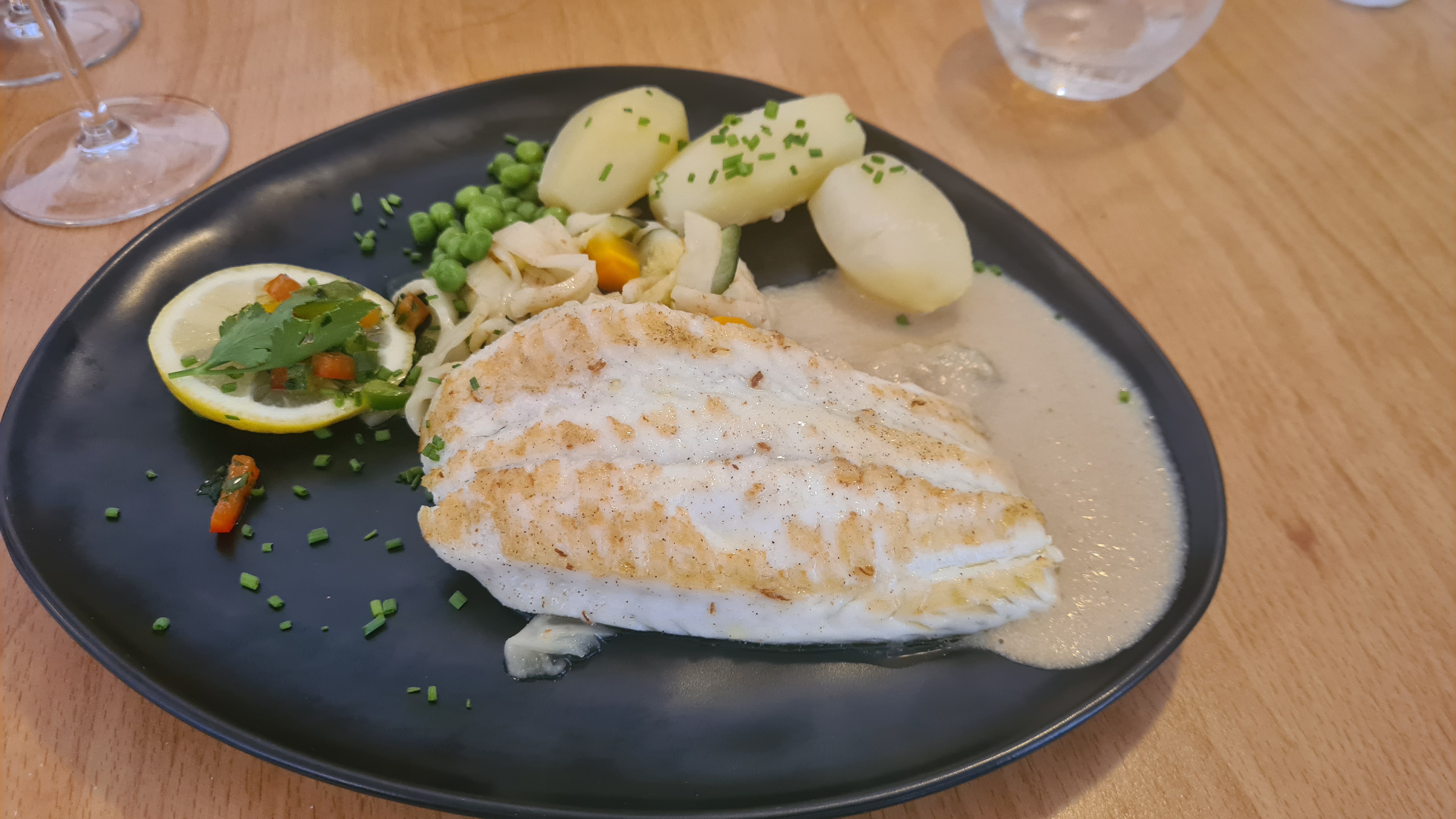 Un joli choix de poissons, forcément, mais aussi des plats adaptés pour les enfants qui n'aiment pas forcément. Tout le repas, de l'entrée au dessert, était très bon, avec une mention particulière, en ce qui me concerne, pour l'excellente cuisson du poisson et son accompagnement : un régal. Un peu plus de légumes aurait été apprécié mais c'était délicieux. Ambiance agréable, et grand plus pour nous, chiens acceptés!