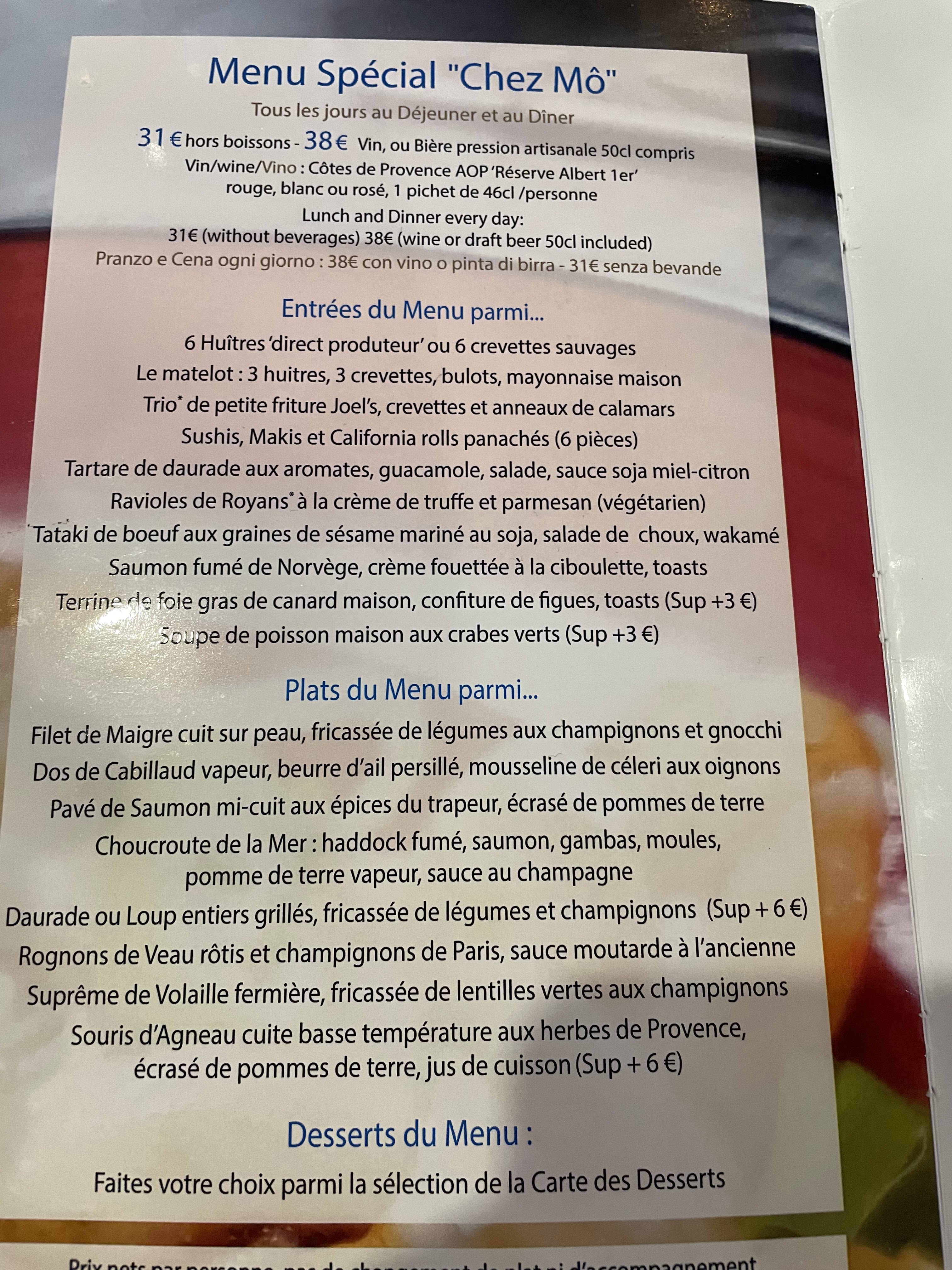 Un menu proposé à 38 € (3 entrées, 3 plats et 3 desserts au choix) absolument délicieux et copieux. Je recommande