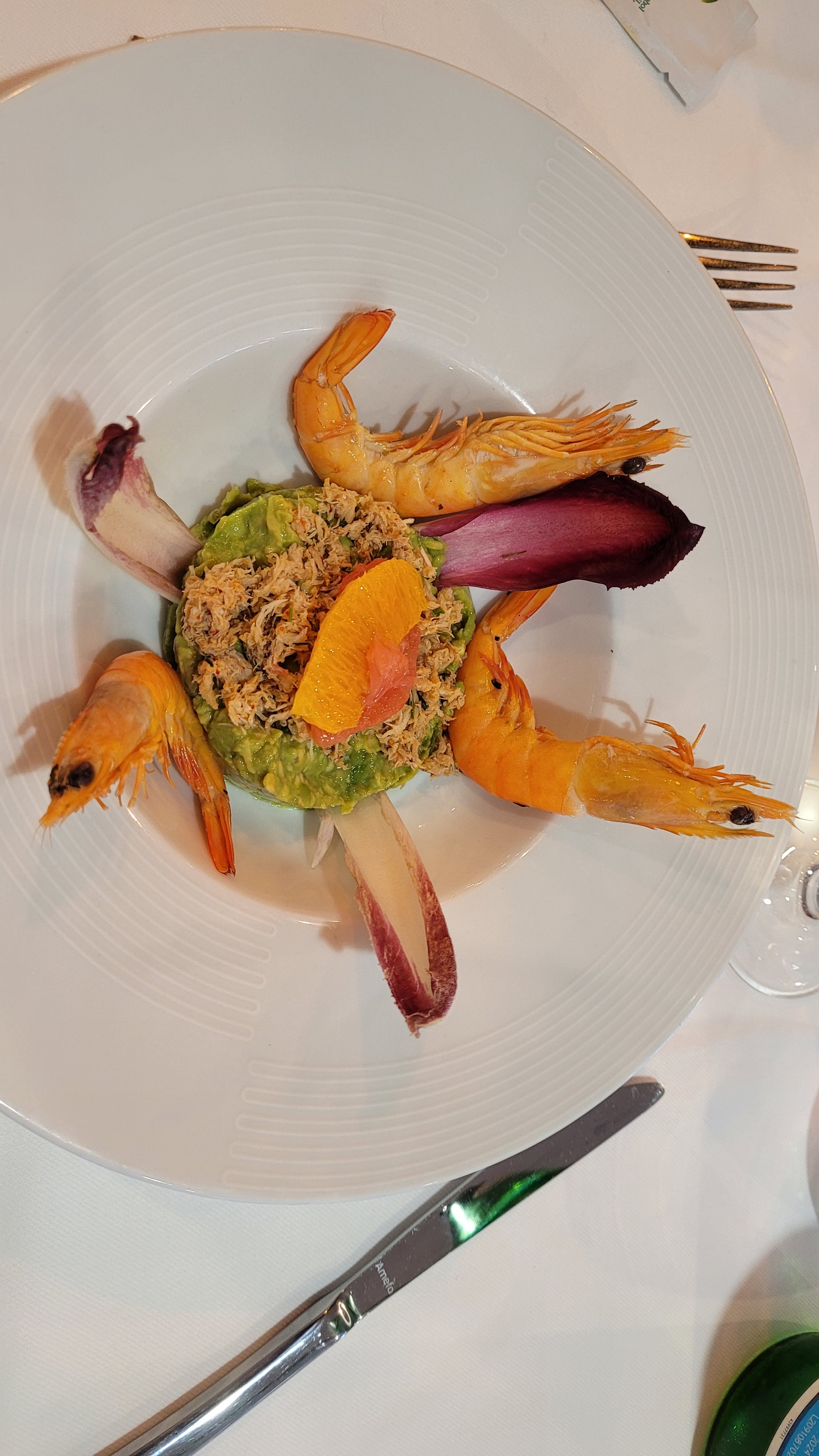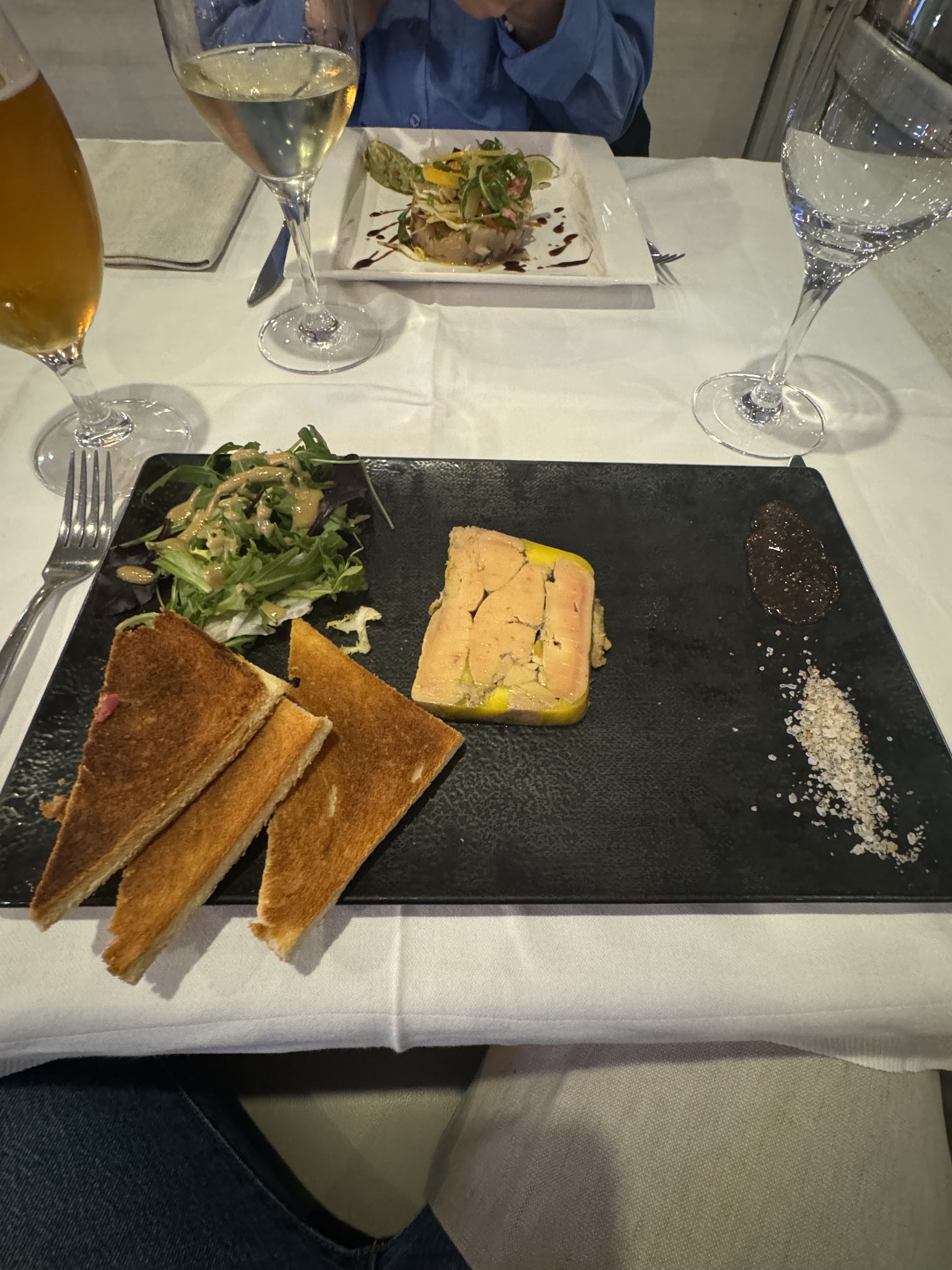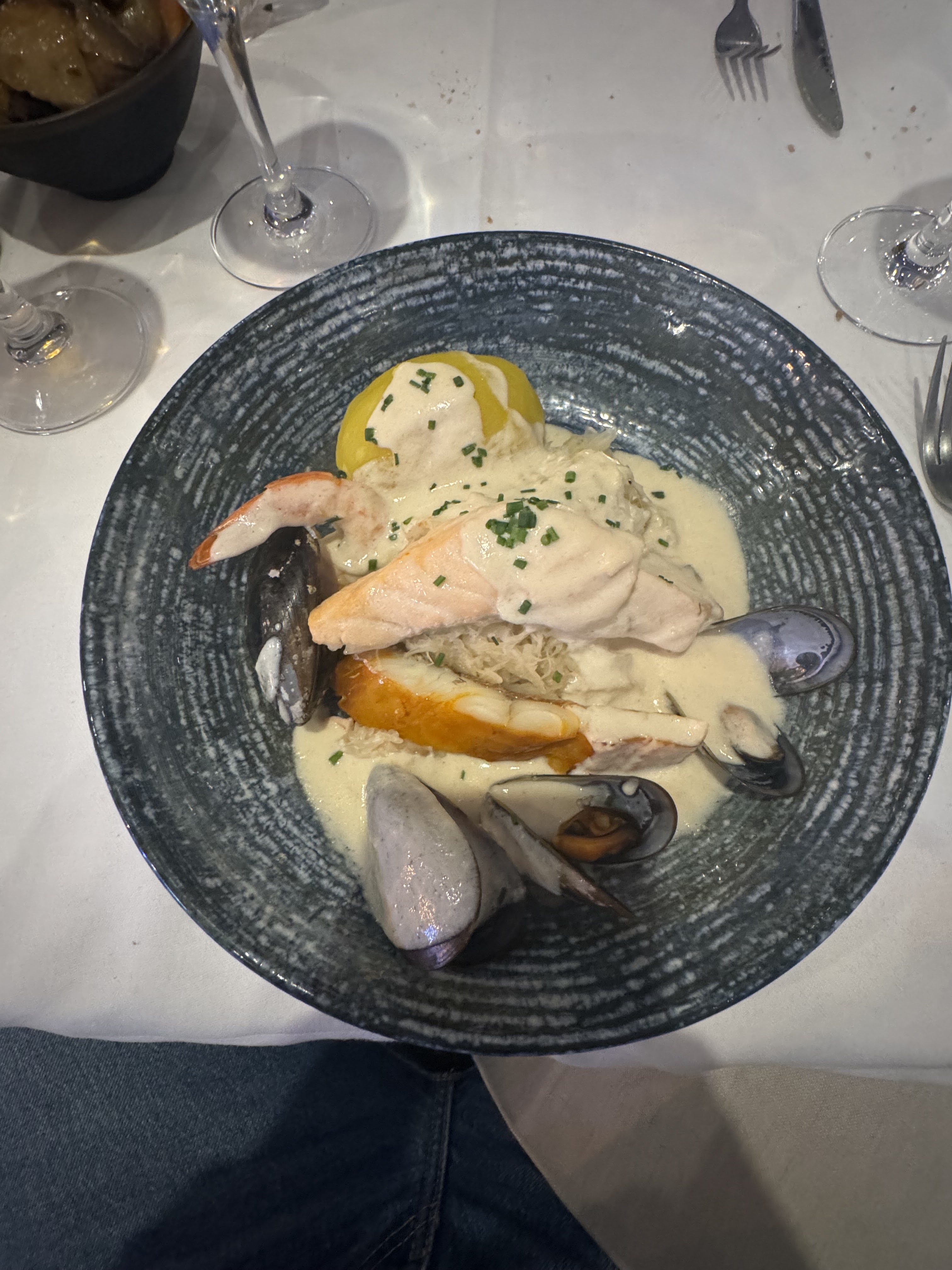 Si j'avais eu la possibilité j'aurai mis 4,5 sur 5 mais bon, Le cadre est très élégant mais malheureusement trop bruyant. Alors que mes accompagnants ont pris le trio avec des calamars et des crevettes, le serveur m'a apporté une petite rillette de morue, sympathique 😊 En plat, la choucroute était raffinée et la morue dans le jus de poireaux était succulente! Et les sushis 🍣 OSAKA était un délice !! Mais malheureusement les plats manquaient de saveurs... Pour finir, les desserts comme le nougats glacé ou la pièmentaise (Glace, caramel,...) étaient parfait ! Ce restaurant mérite tout de même la 1er place sur TripAdvisor 😊